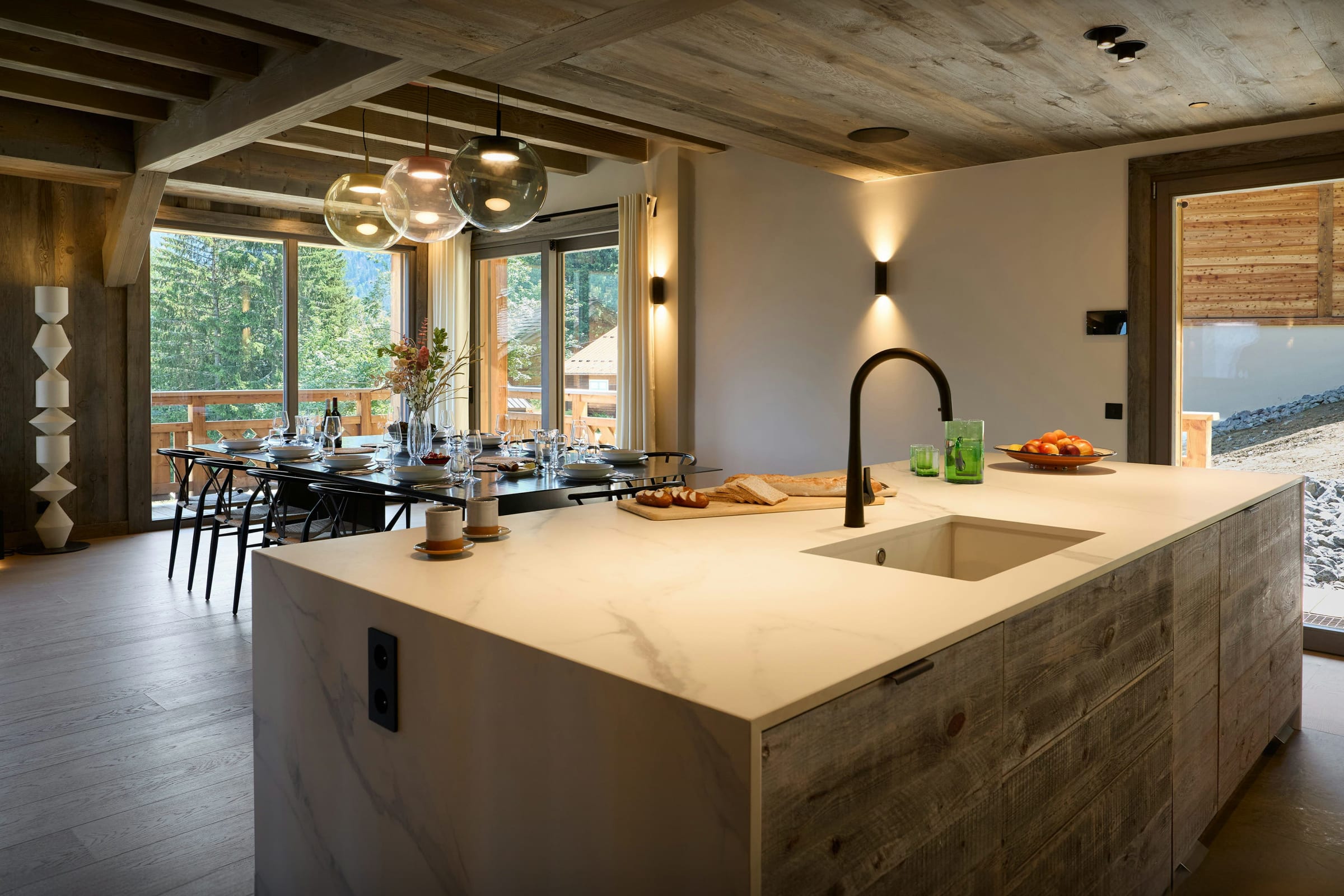 L’étage central est dédié à une impressionnante pièce de vie ouverte, qui comprend notamment une cuisine tout équipée, un comptoir central et une grande table à manger. Un immense canapé modulaire est installé face à la cheminée, et des bancs encastrés près des fenêtres permettent de se décontracter tout en profitant de la vue. Des portes-fenêtres ouvrent sur un balcon.