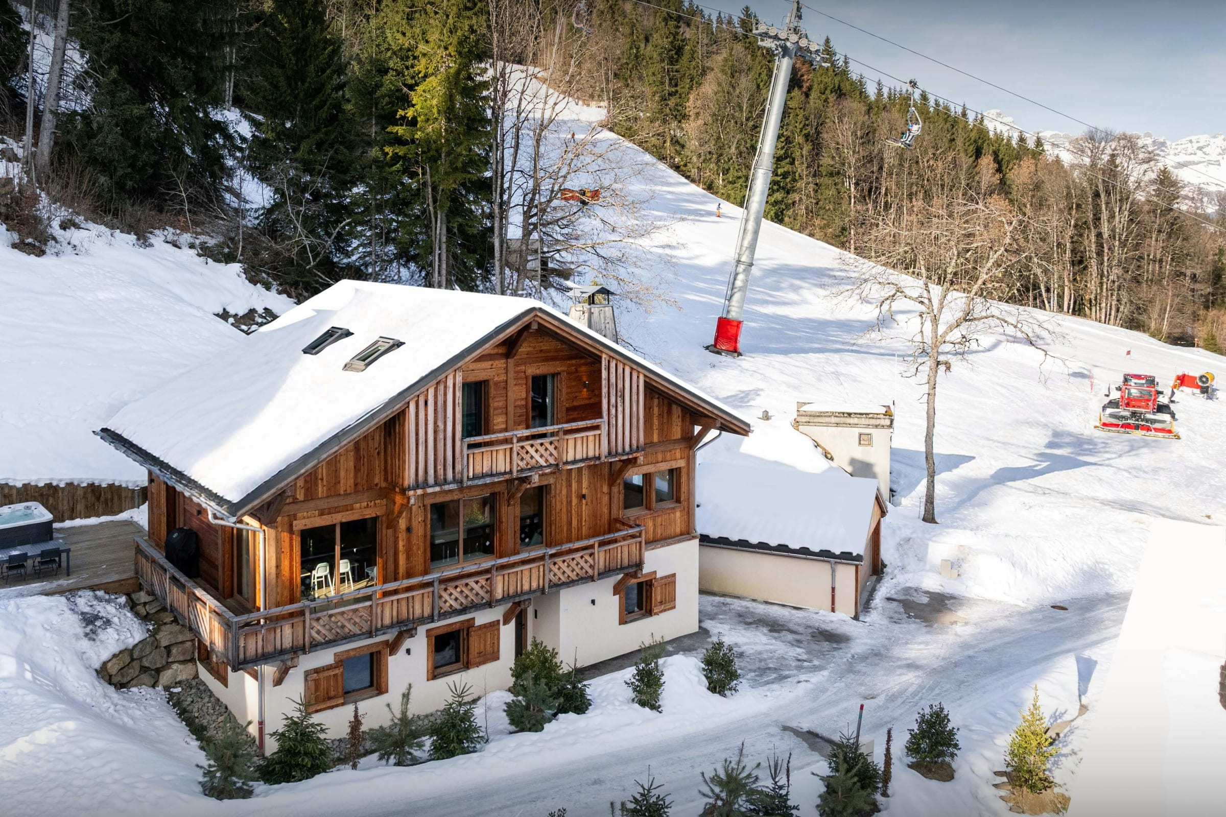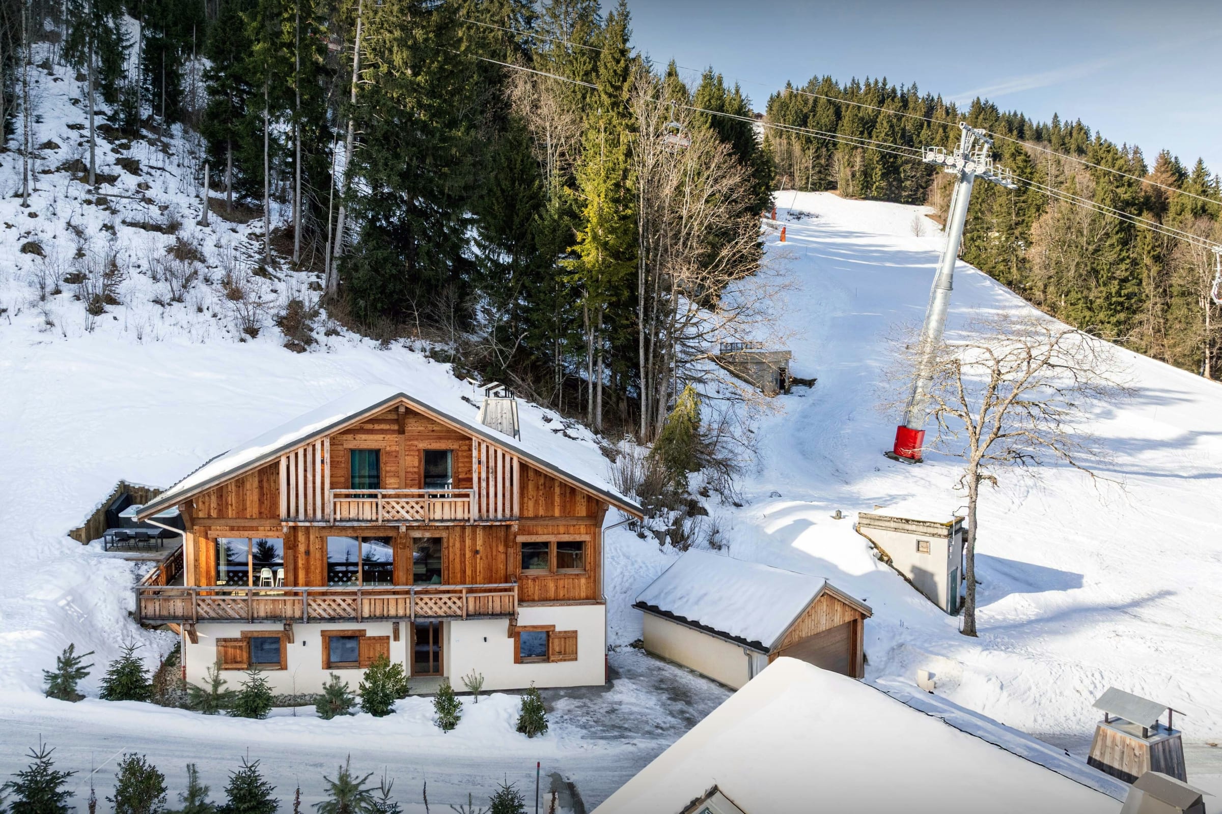 Bâti sur une piste de ski surplombant le paisible village de Saint-Nicolas-de-Véroce, c’est le refuge parfait pour une famille ou un groupe d’amis qui souhaite profiter pleinement des sports de glisse. Vous apprécierez néanmoins une atmosphère de sérénité en fin de journée. Il faut compter seulement 150 m jusqu'à la remontée mécanique qui relie Megève et Saint-Gervais. Toutefois, lorsque les conditions d’enneigement sont bonnes, vous pourrez quitter le chalet directement à skis.