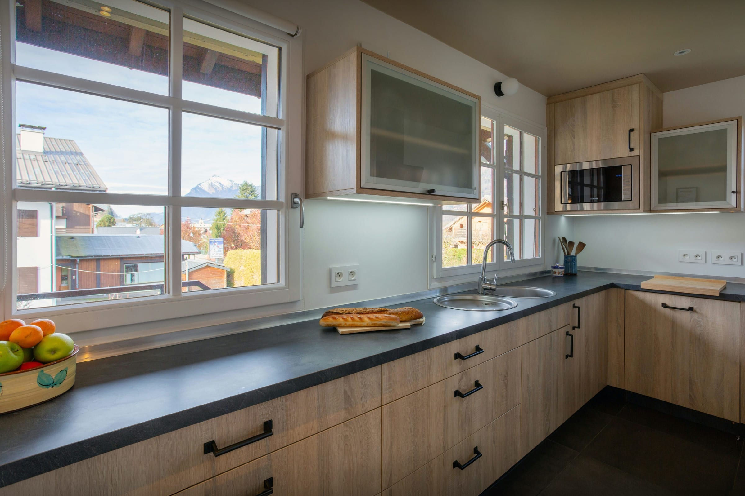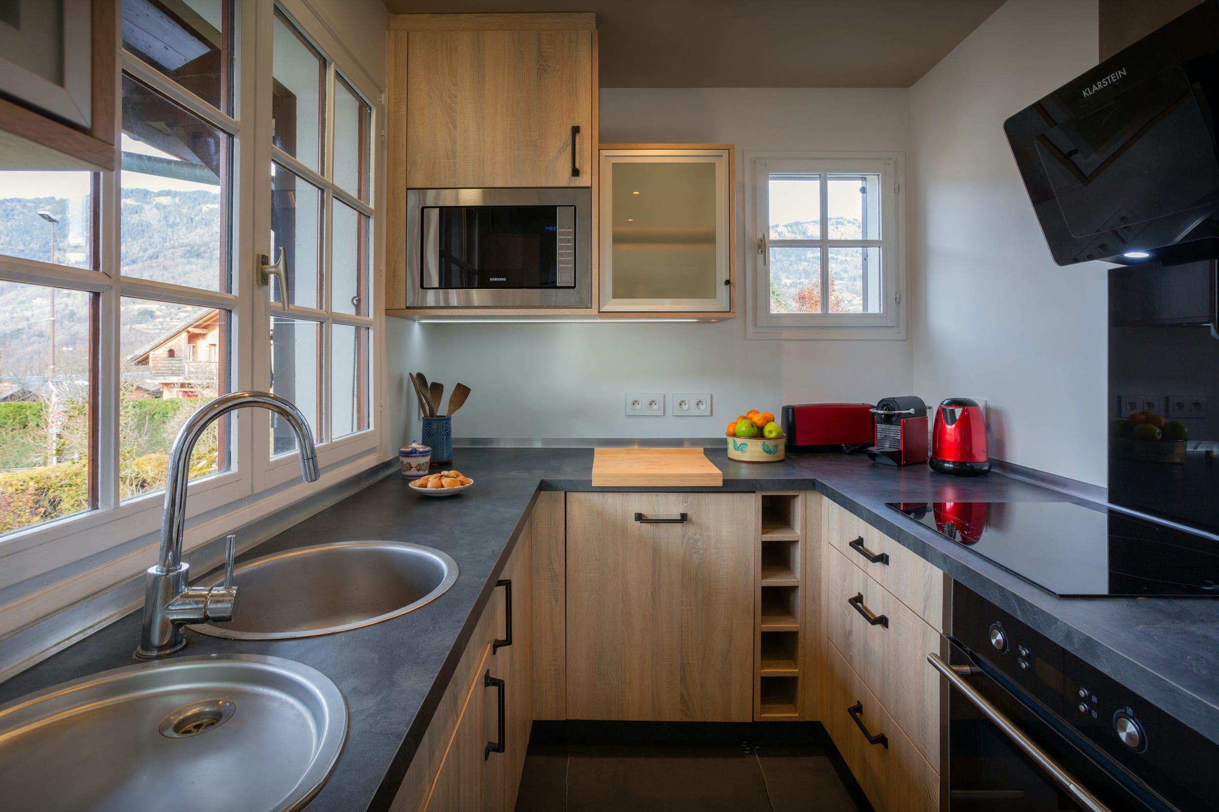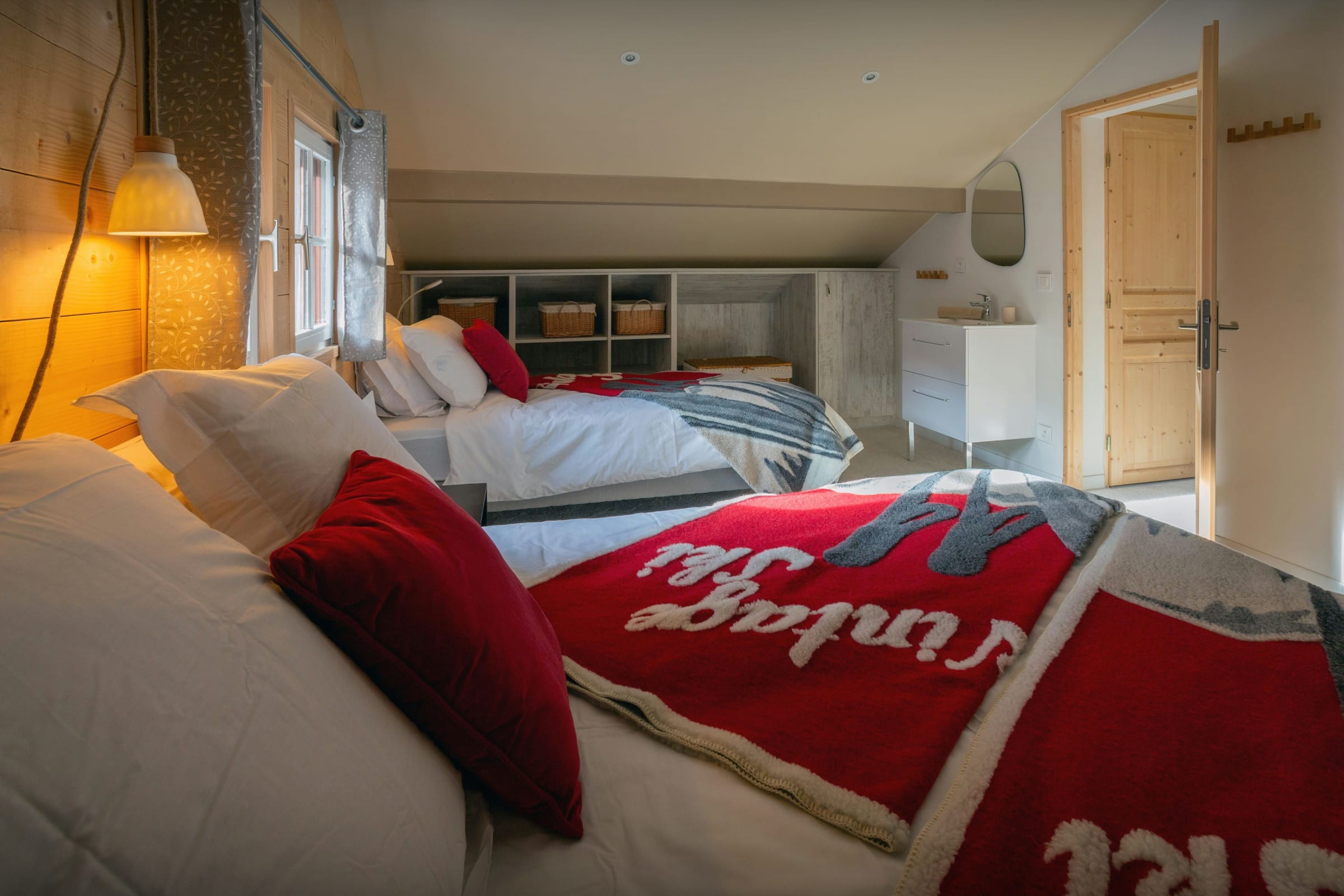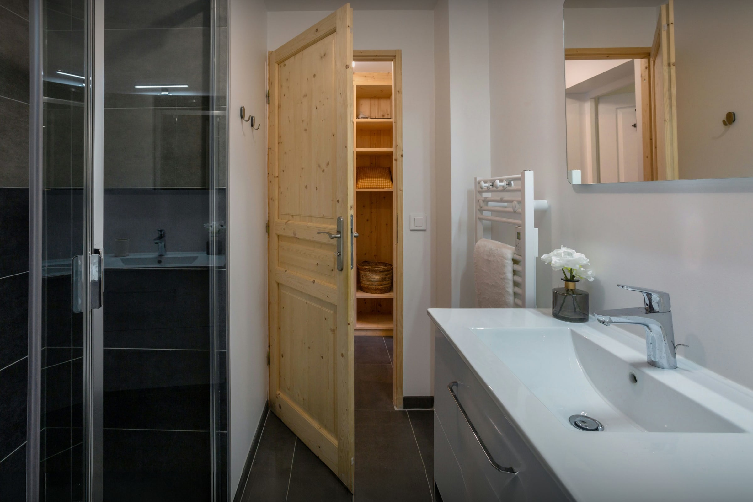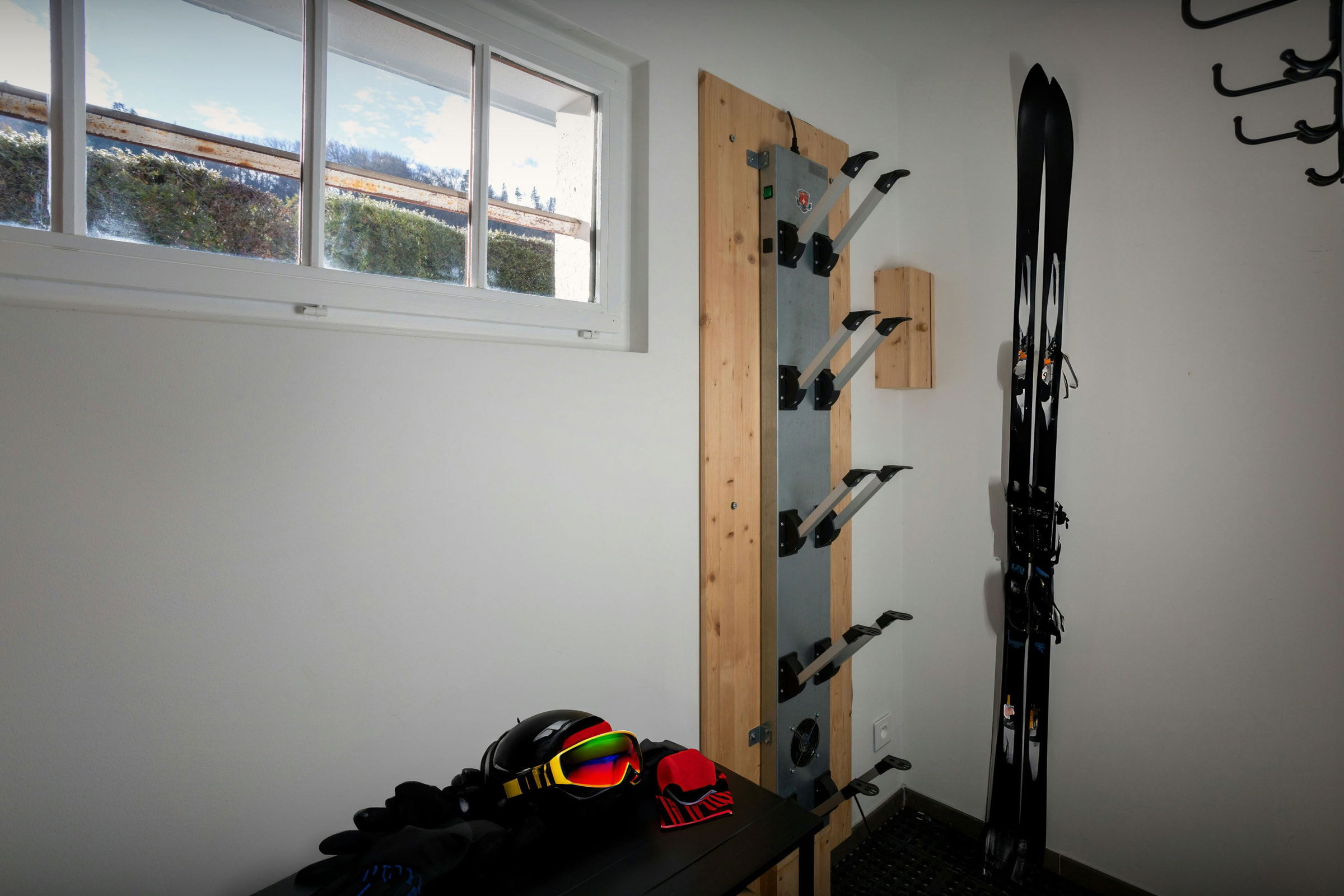 Le rez-de-chaussée abrite enfin un local à skis avec sèche-chaussures chauffant, une buanderie équipée d’un lave-linge et d’un sèche-linge, ainsi qu'un garage pour deux voitures et un emplacement extérieur.