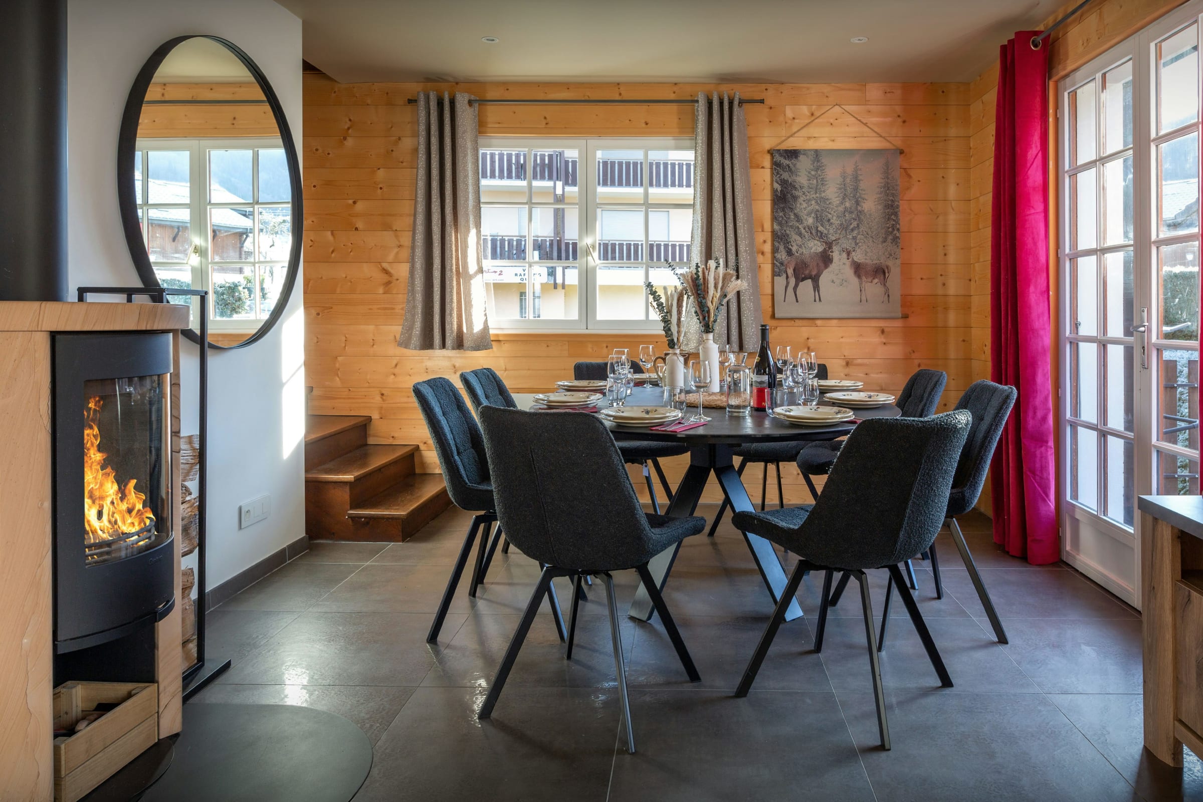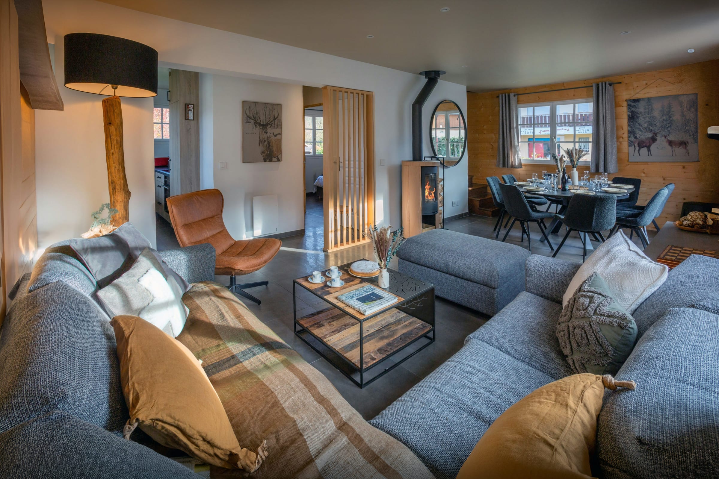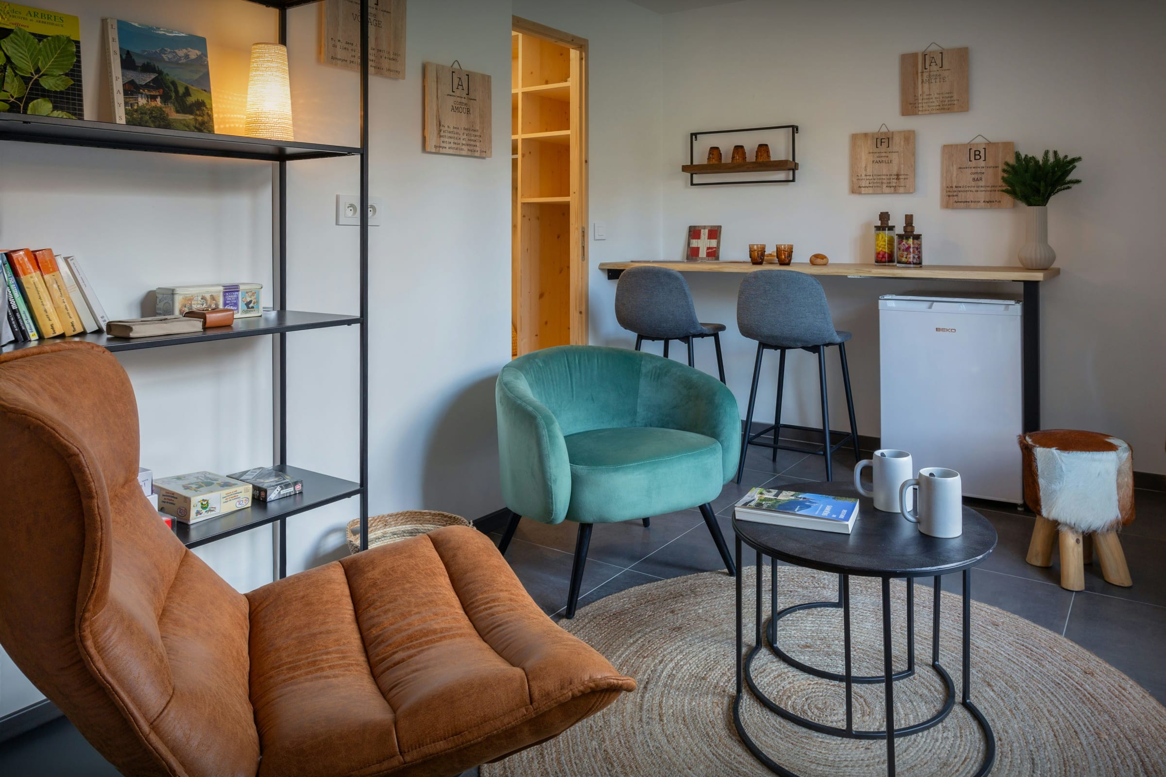 Au premier étage se trouvent la cuisine lumineuse et le salon, qui est meublé d’un canapé en L, d'une télévision, d'une table à manger et d’un poêle à bois, créant une atmosphère conviviale. Ce salon ouvre sur une terrasse orientée sud, avec petite table et barbecue. Le rez-de-chaussée dispose d’une agréable salle de lecture, équipée de jeux de société et d'un réfrigérateur, offrant un espace idéal pour se détendre après une journée d’activités.