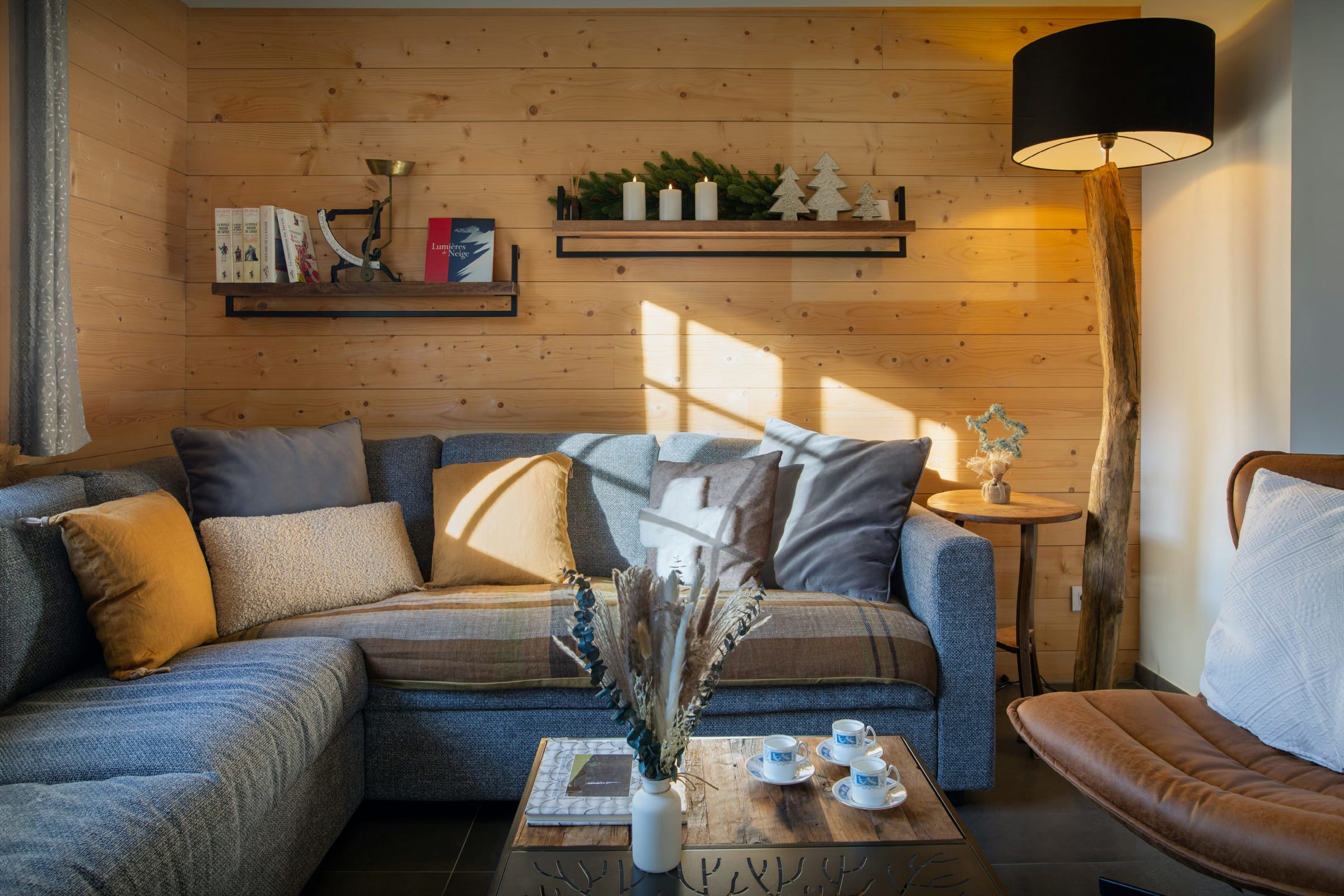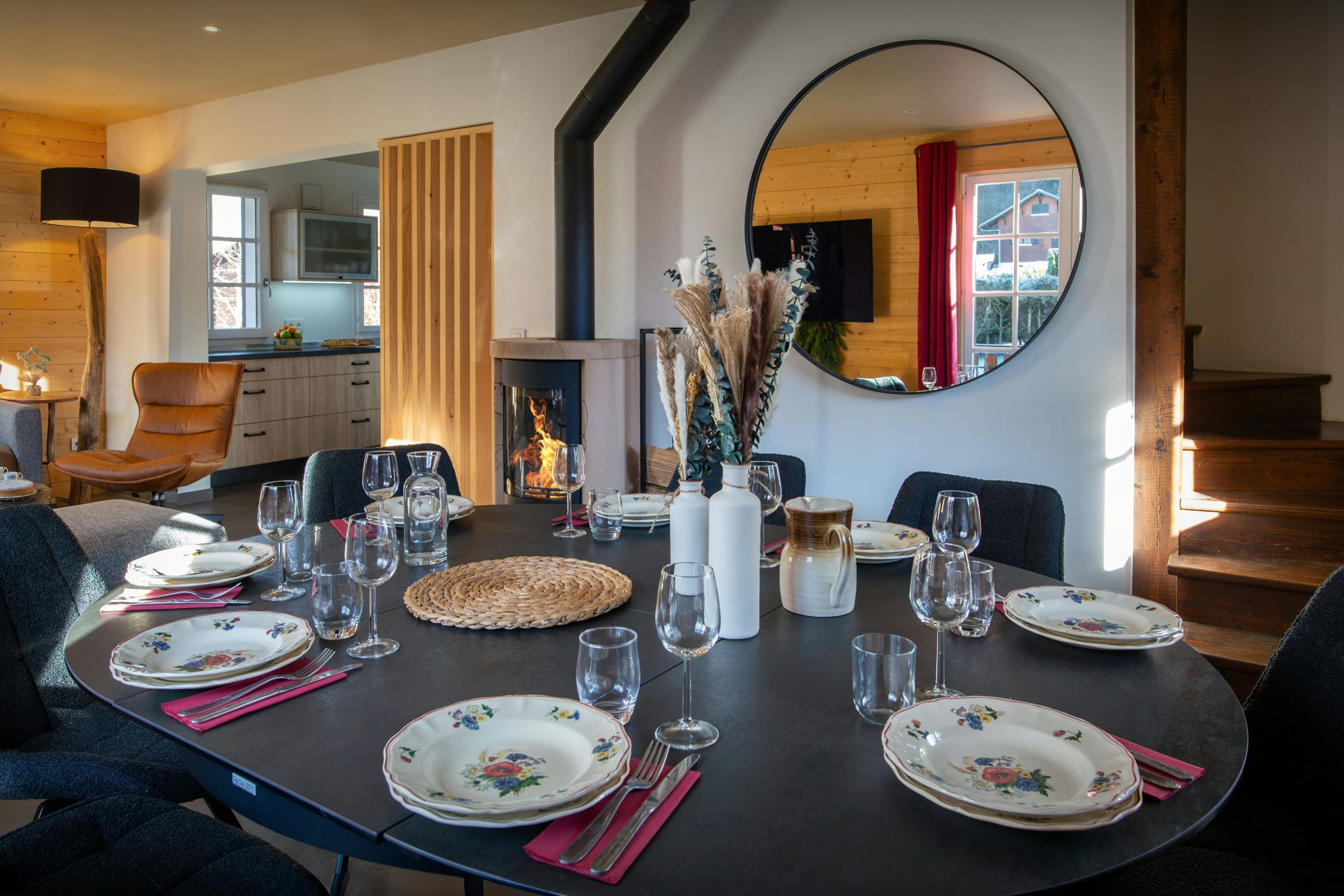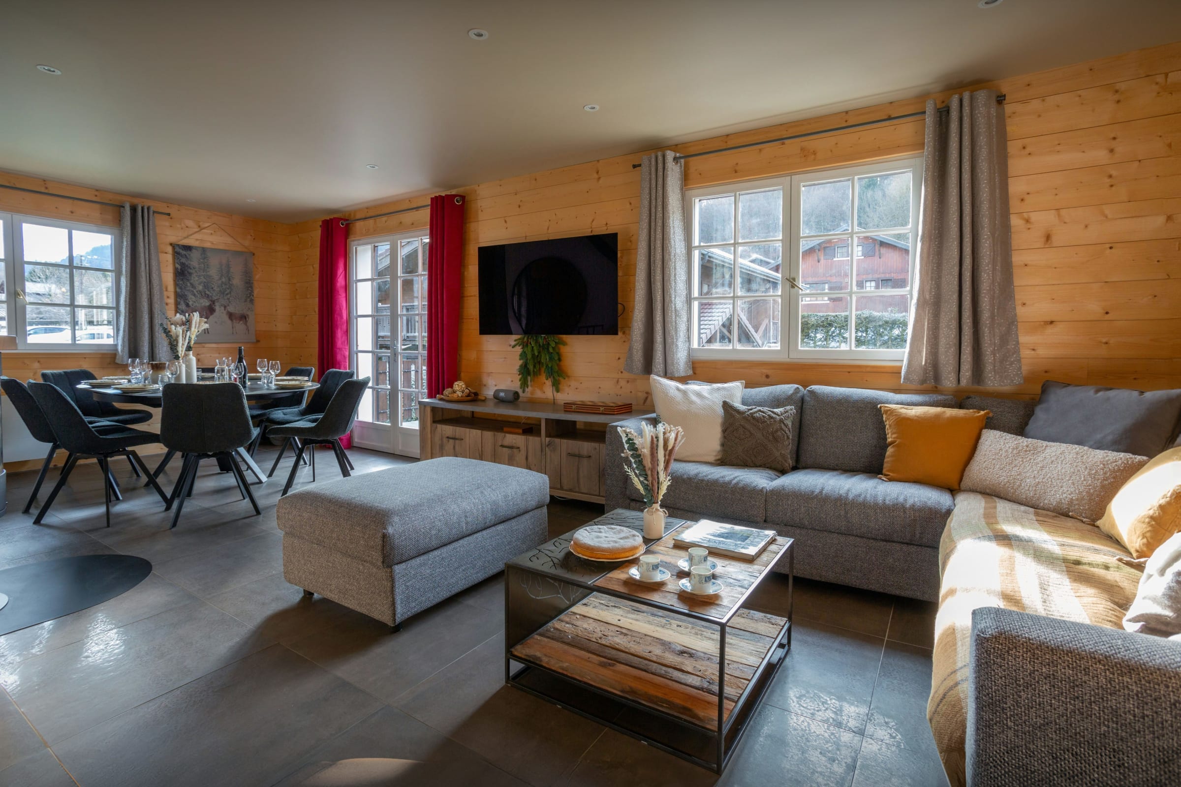 Au premier étage se trouvent la cuisine lumineuse et le salon, qui est meublé d’un canapé en L, d'une télévision, d'une table à manger et d’un poêle à bois, créant une atmosphère conviviale. Ce salon ouvre sur une terrasse orientée sud, avec petite table et barbecue. Le rez-de-chaussée dispose d’une agréable salle de lecture, équipée de jeux de société et d'un réfrigérateur, offrant un espace idéal pour se détendre après une journée d’activités.