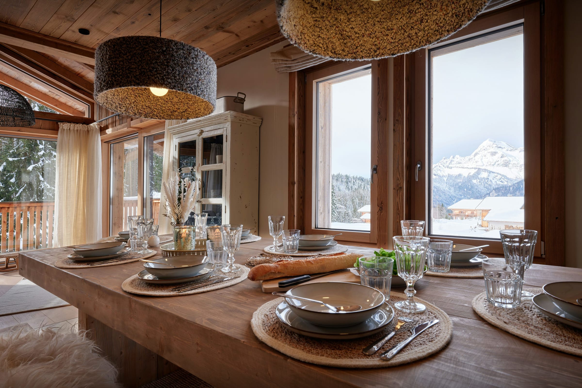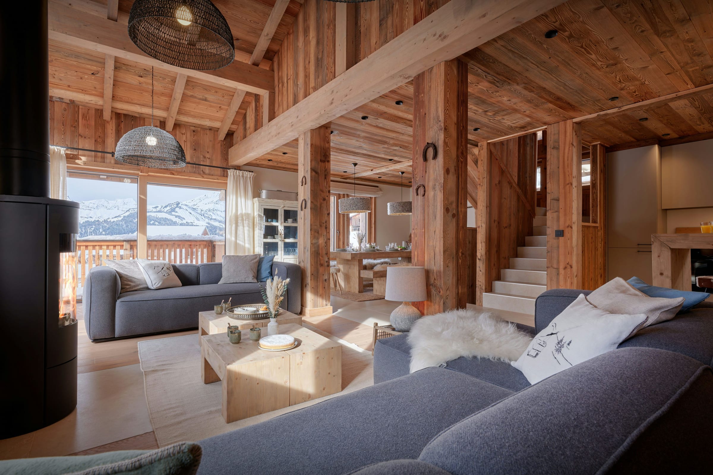 La pièce de vie aménagée au premier étage est baignée de lumière, grâce à de hautes baies vitrées et des portes-fenêtres donnant sur un ravissant balcon d’angle. De là, la vue sur le mont Charvin et les Aravis est absolument sensationnelle. Deux vastes canapés vous permettront de vous rassembler autour du poêle à bois pour vous raconter les aventures de la journée. Vous n’y trouverez pas de télévision, car le Chalet Marmot’Inn mise sur la convivialité.