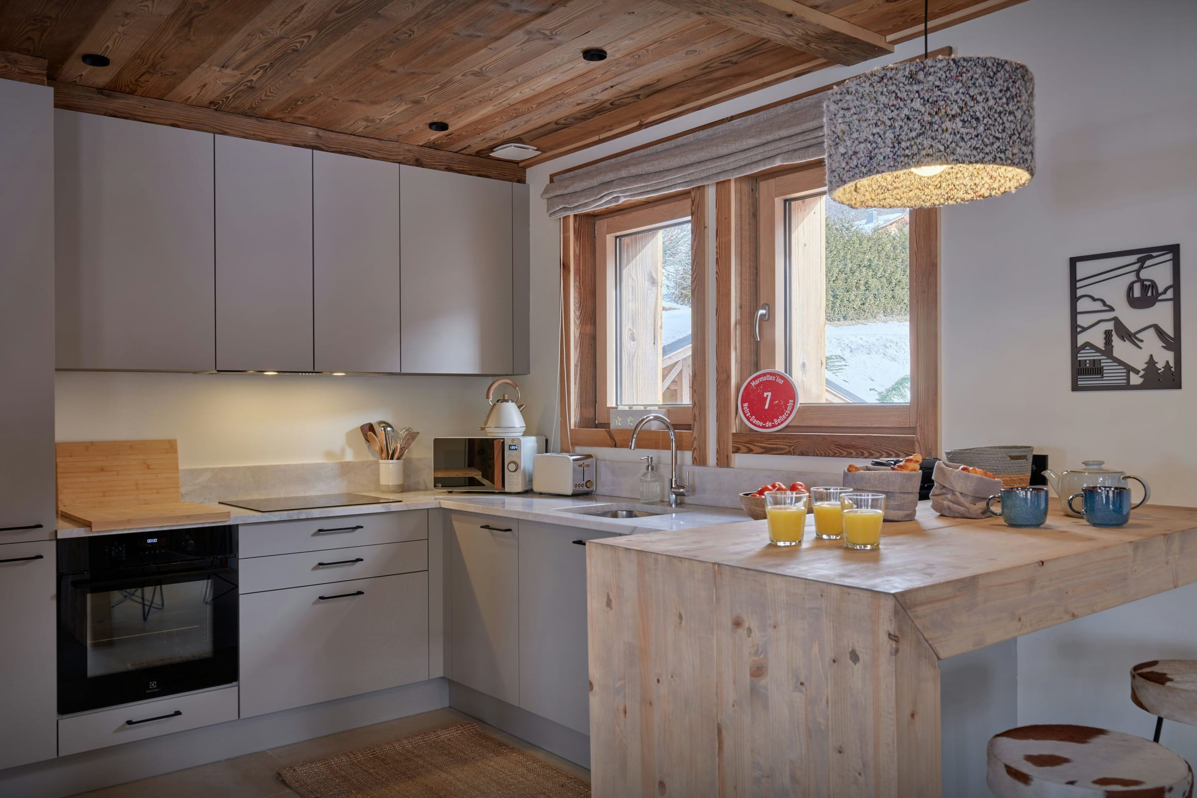 La grande table à manger en bois massif permet de se réunir tous ensemble pour les repas, tandis que le comptoir qui sépare le salon de la cuisine est idéal pour le café du matin. Cette cuisine est équipée de tous les ustensiles nécessaires, qui sont de la plus haute qualité.