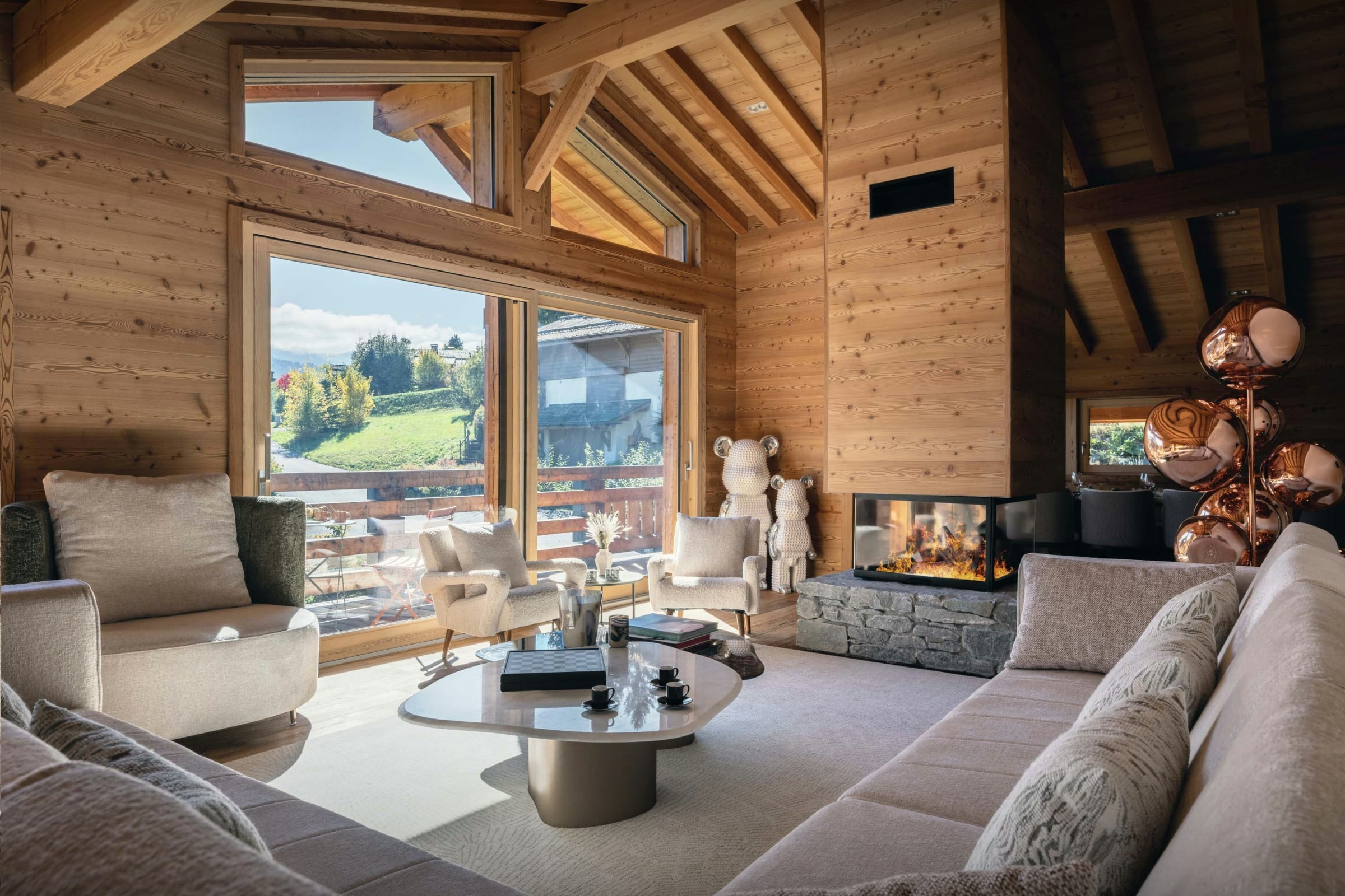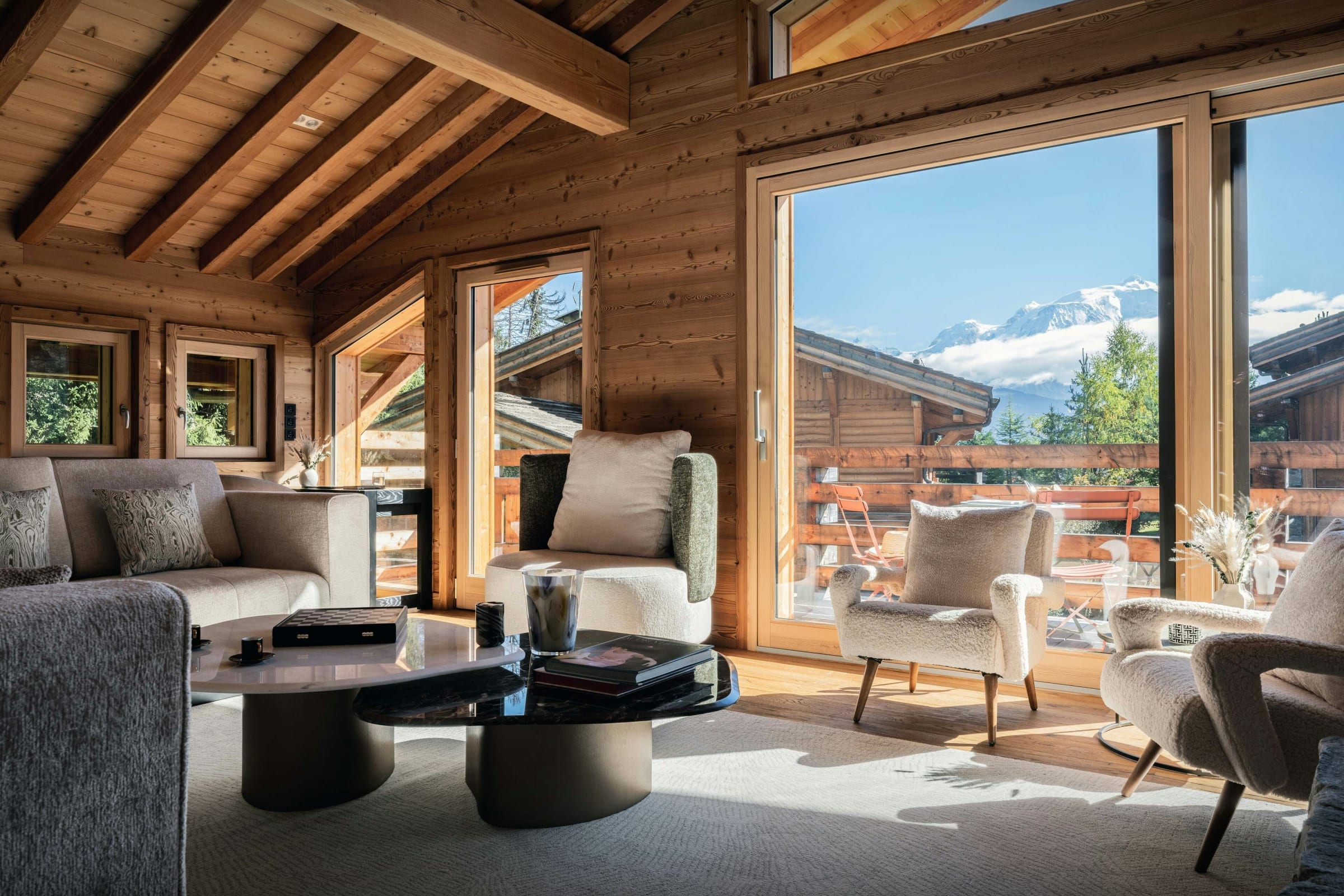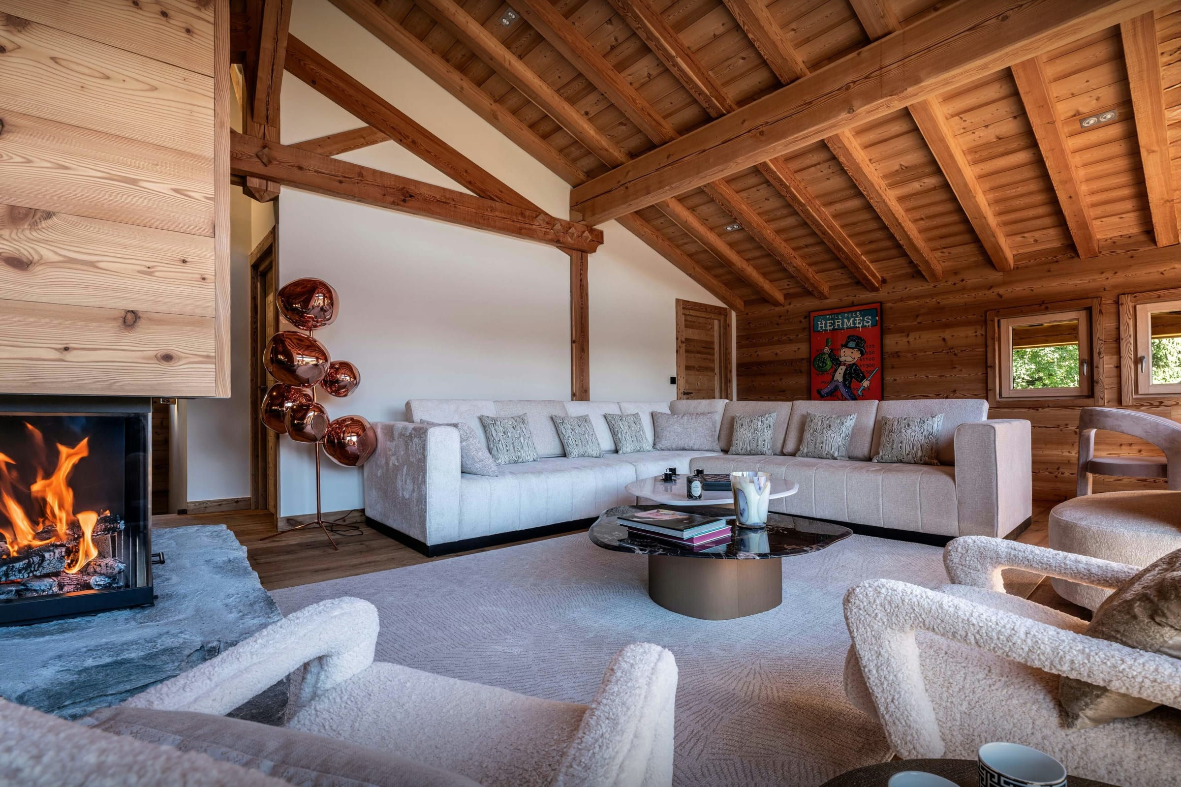 Aménagée au dernier étage, sa spacieuse pièce de vie est particulièrement accueillante, grâce à ses fauteuils et canapés confortables, sa cheminée centrale et sa belle luminosité. De grandes baies vitrées donnent sur un balcon avec vue sur le massif du Mont-Blanc.