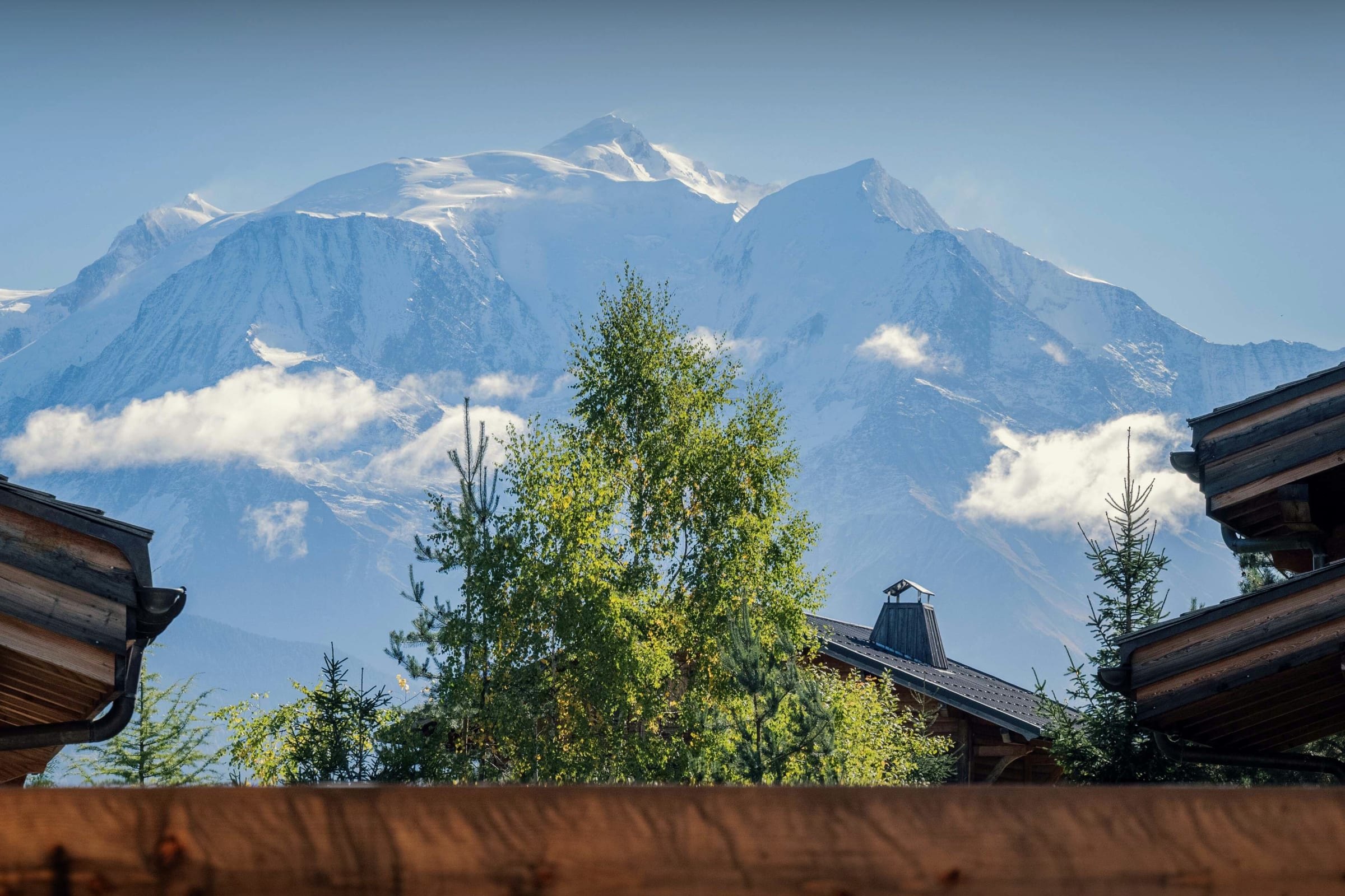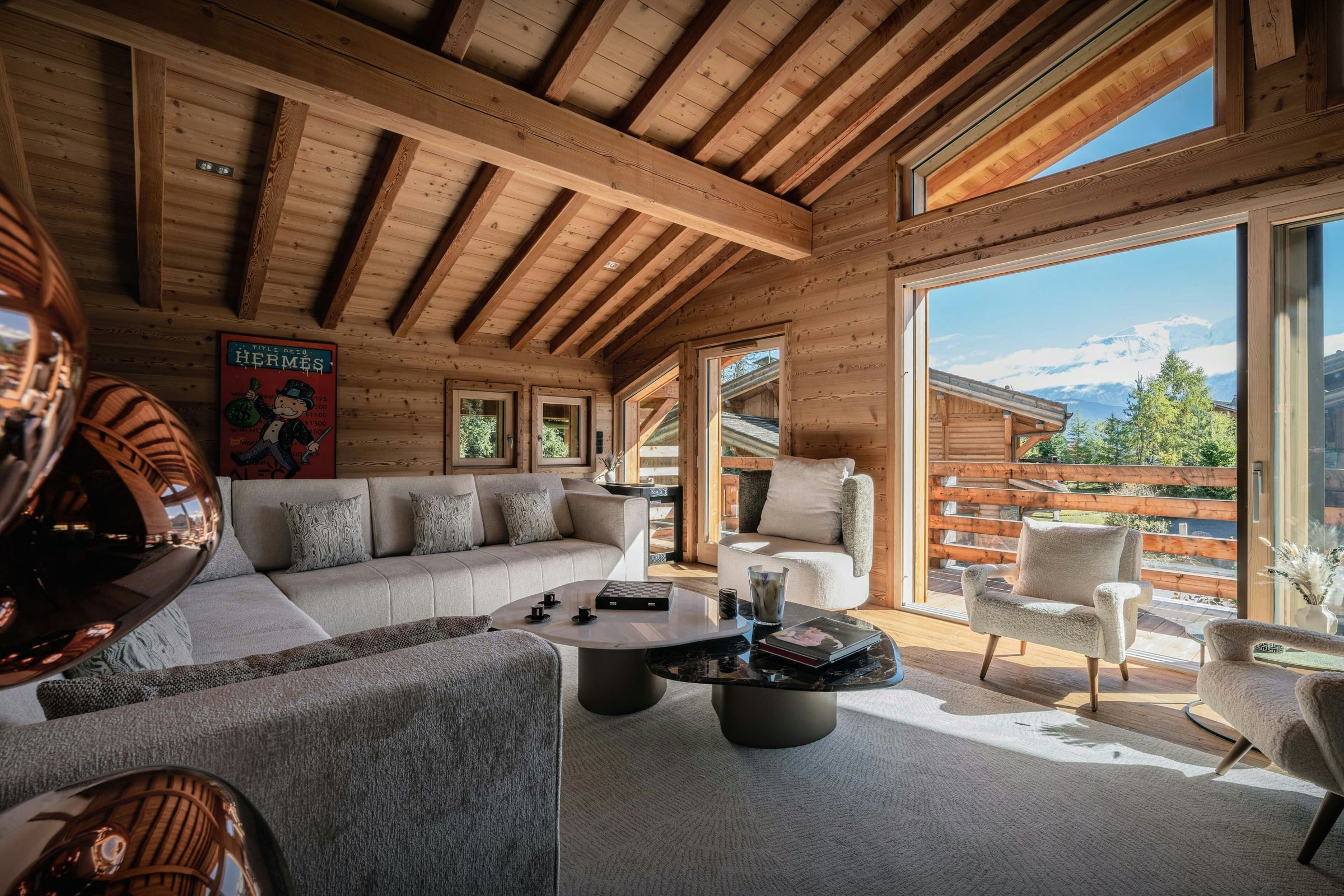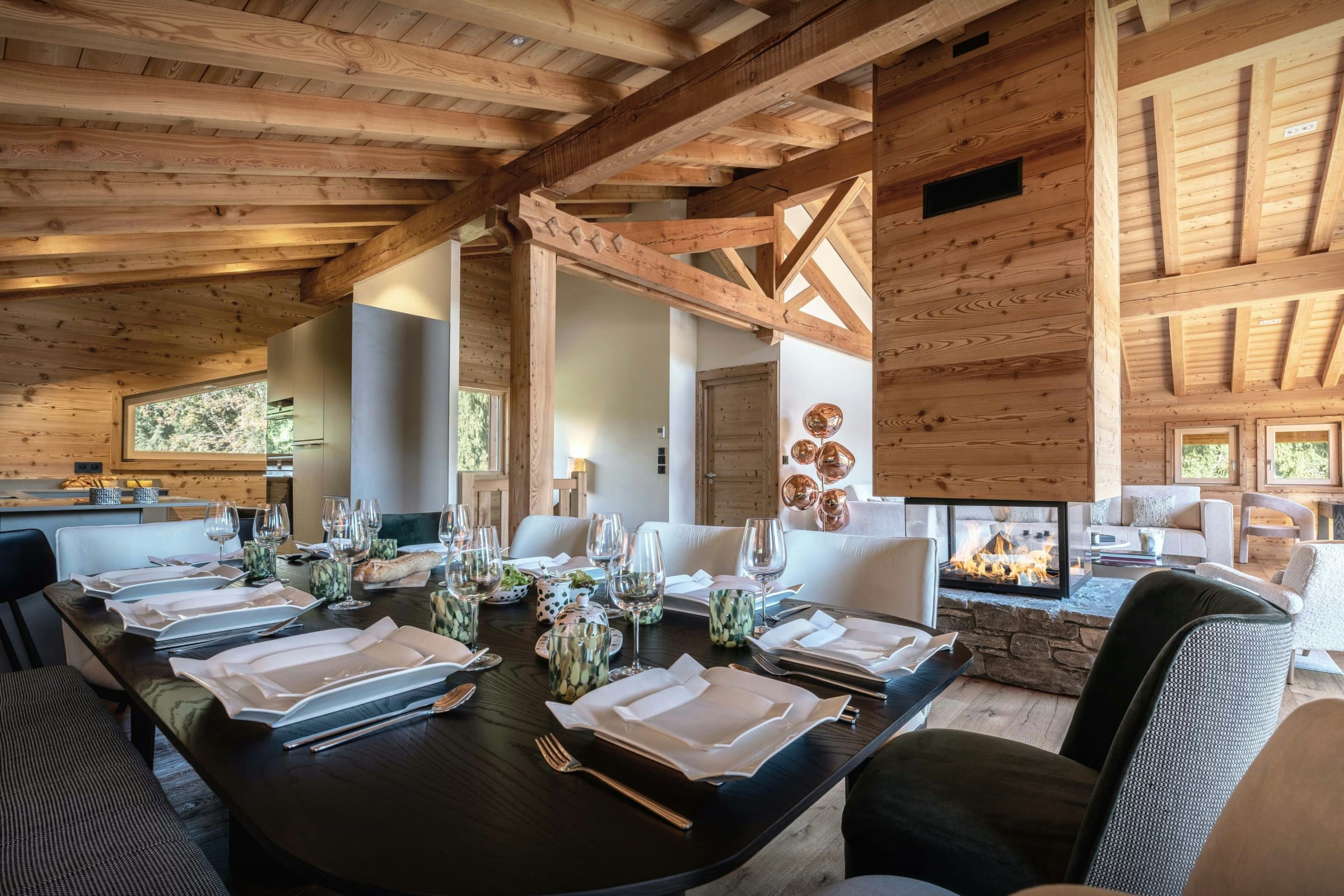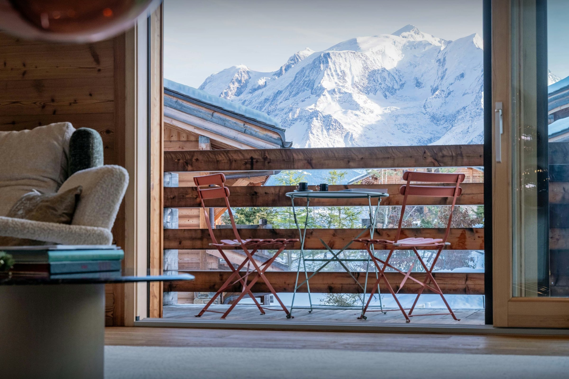 Aménagée au dernier étage, sa spacieuse pièce de vie est particulièrement accueillante, grâce à ses fauteuils et canapés confortables, sa cheminée centrale et sa belle luminosité. De grandes baies vitrées donnent sur un balcon avec vue sur le massif du Mont-Blanc.