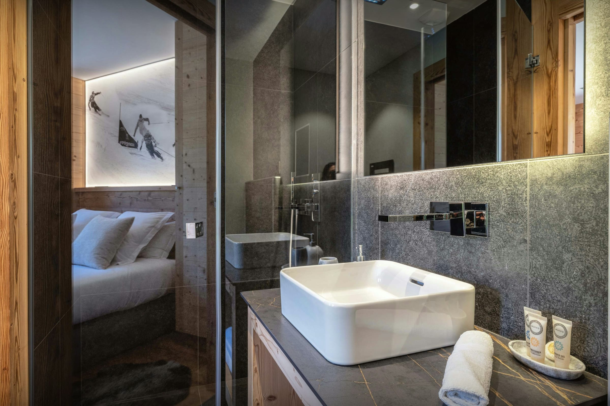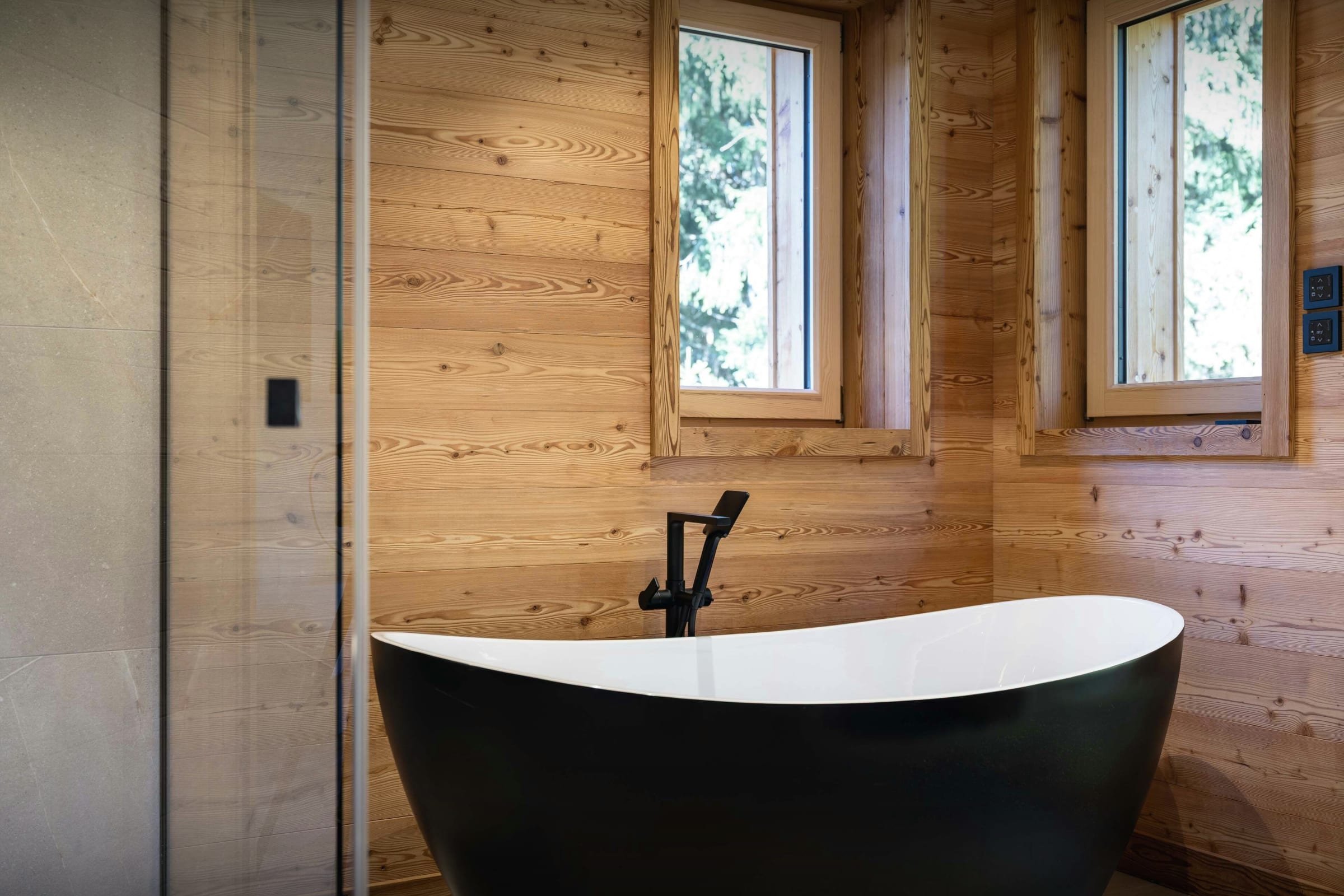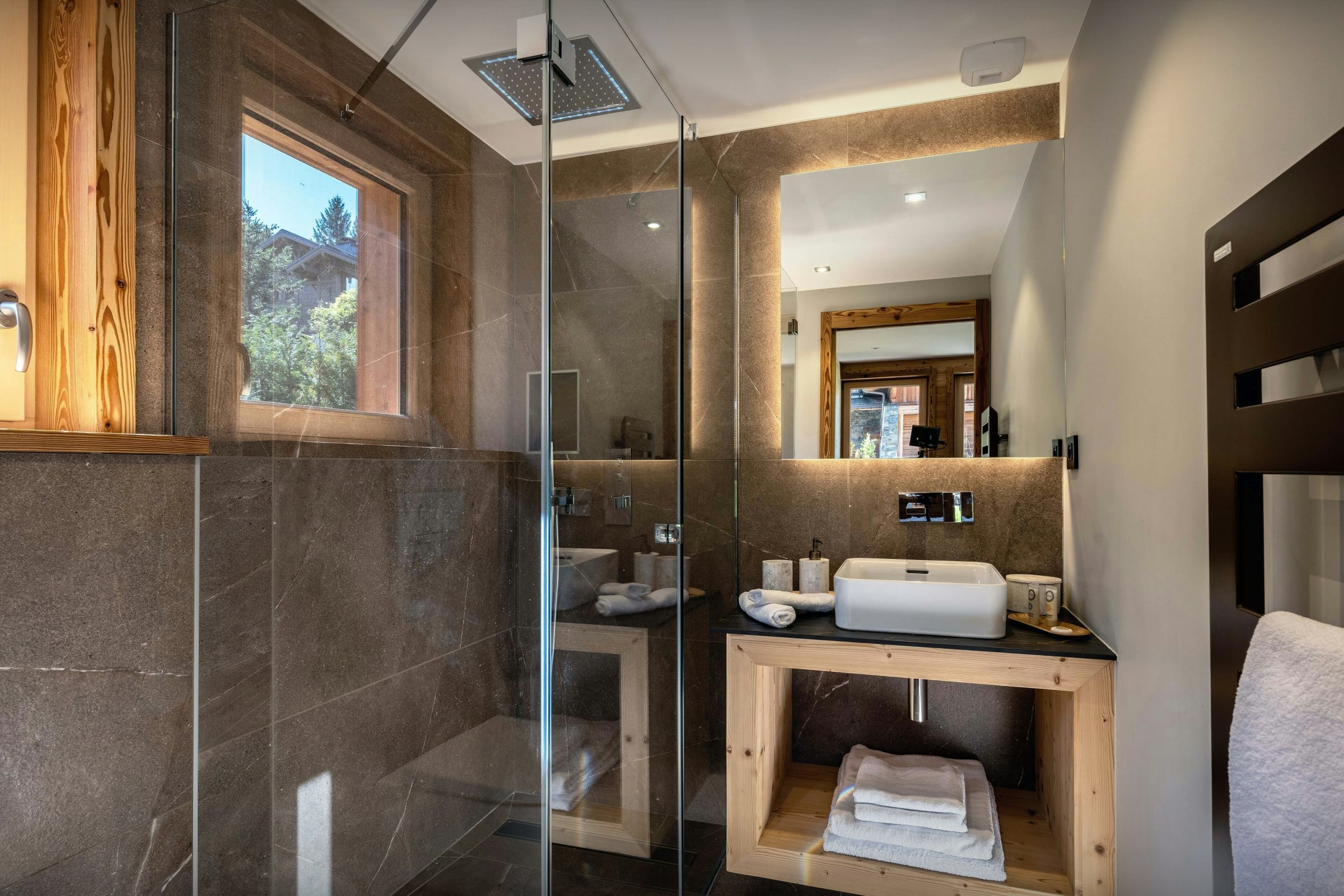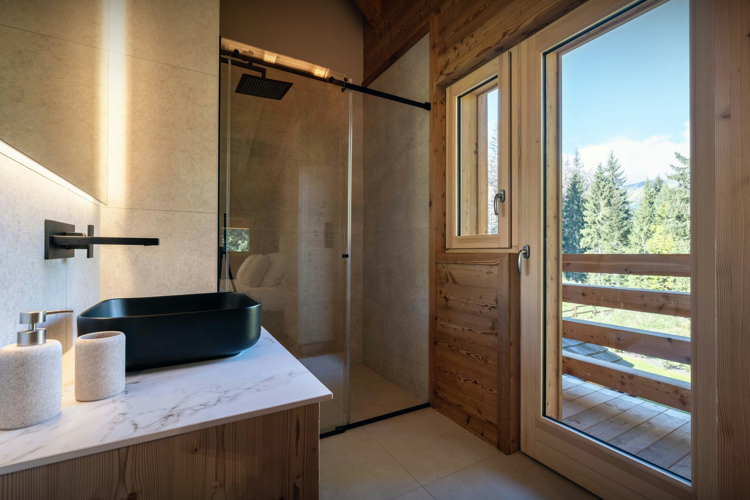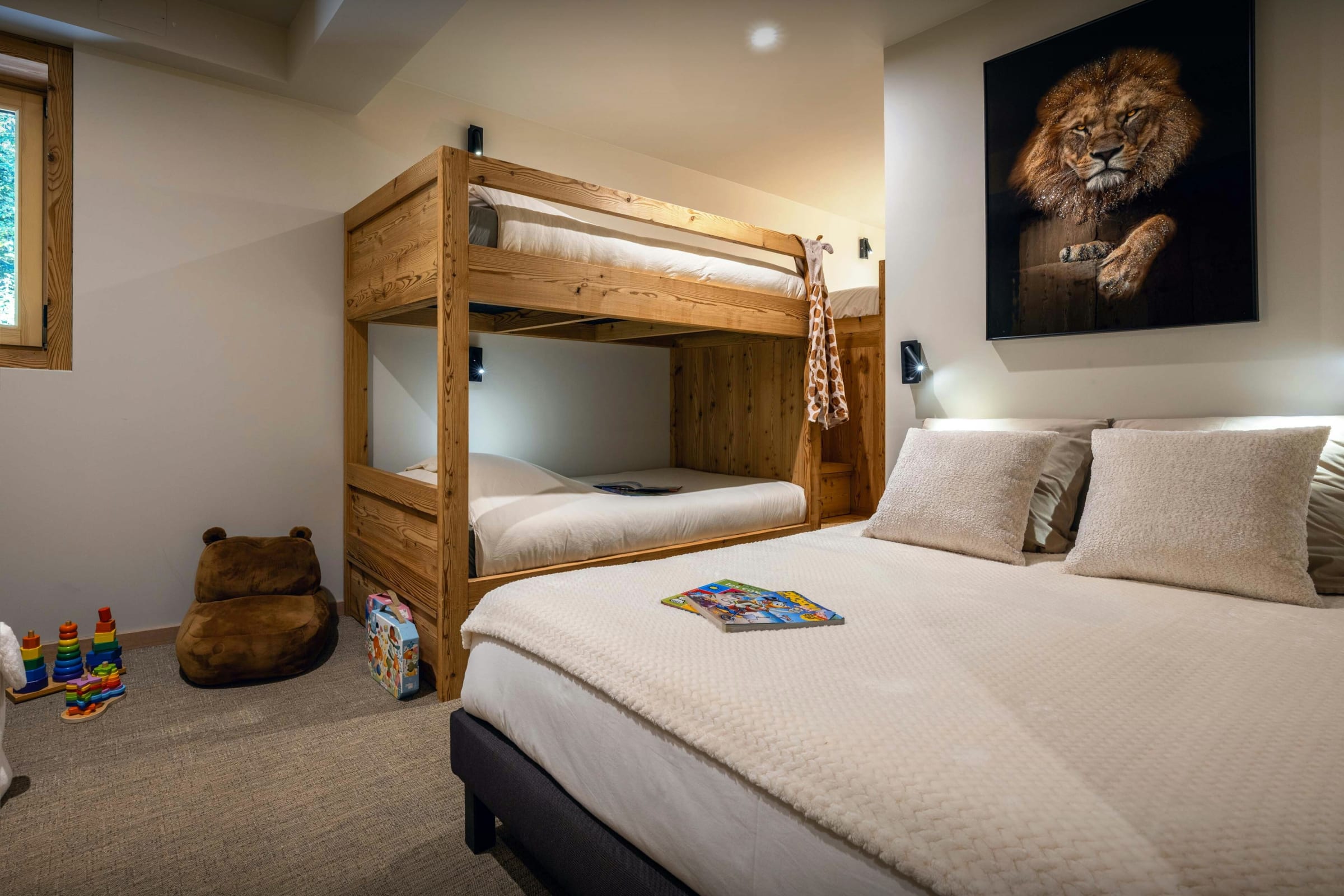 Quatre des cinq chambres réparties sur les trois niveaux disposent d’une salle d’eau attenante. Les trois chambres situées à l’étage intermédiaire offrent également accès à une terrasse en bois. La dernière, un ravissant dortoir pour six situé au rez-de-jardin – comprenant un lit double et deux lits superposés – est connectée par un couloir à une salle de douche et à des toilettes séparées. Pour votre commodité, chaque étage du chalet dispose d’ailleurs de toilettes.