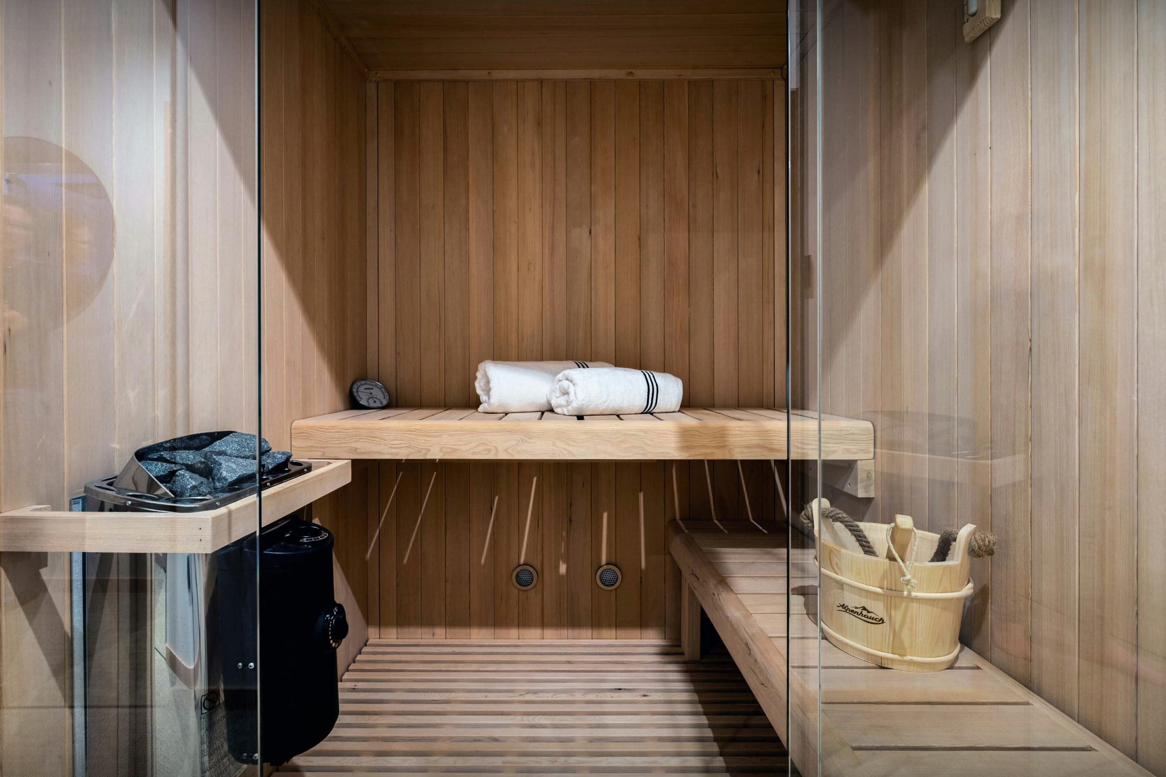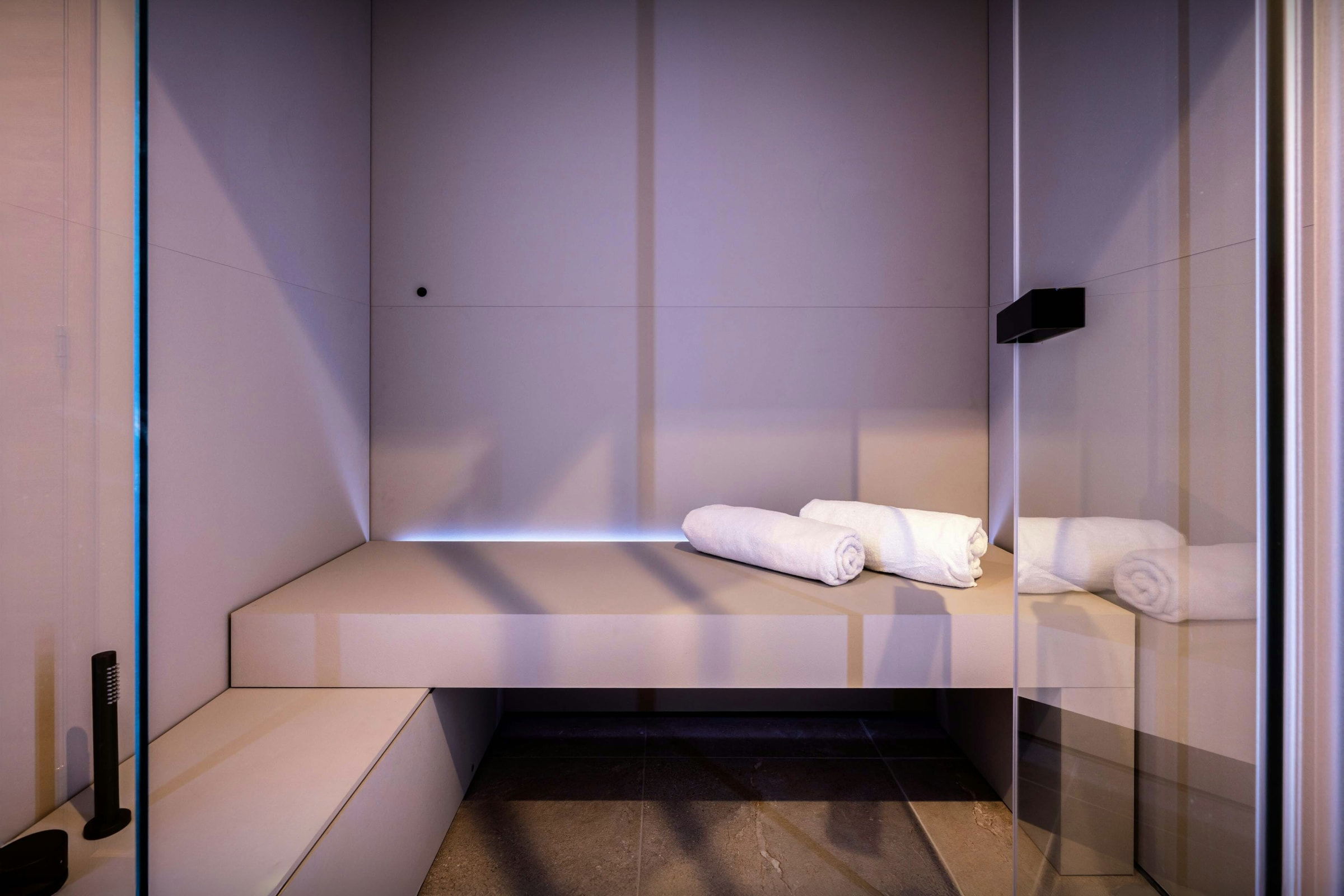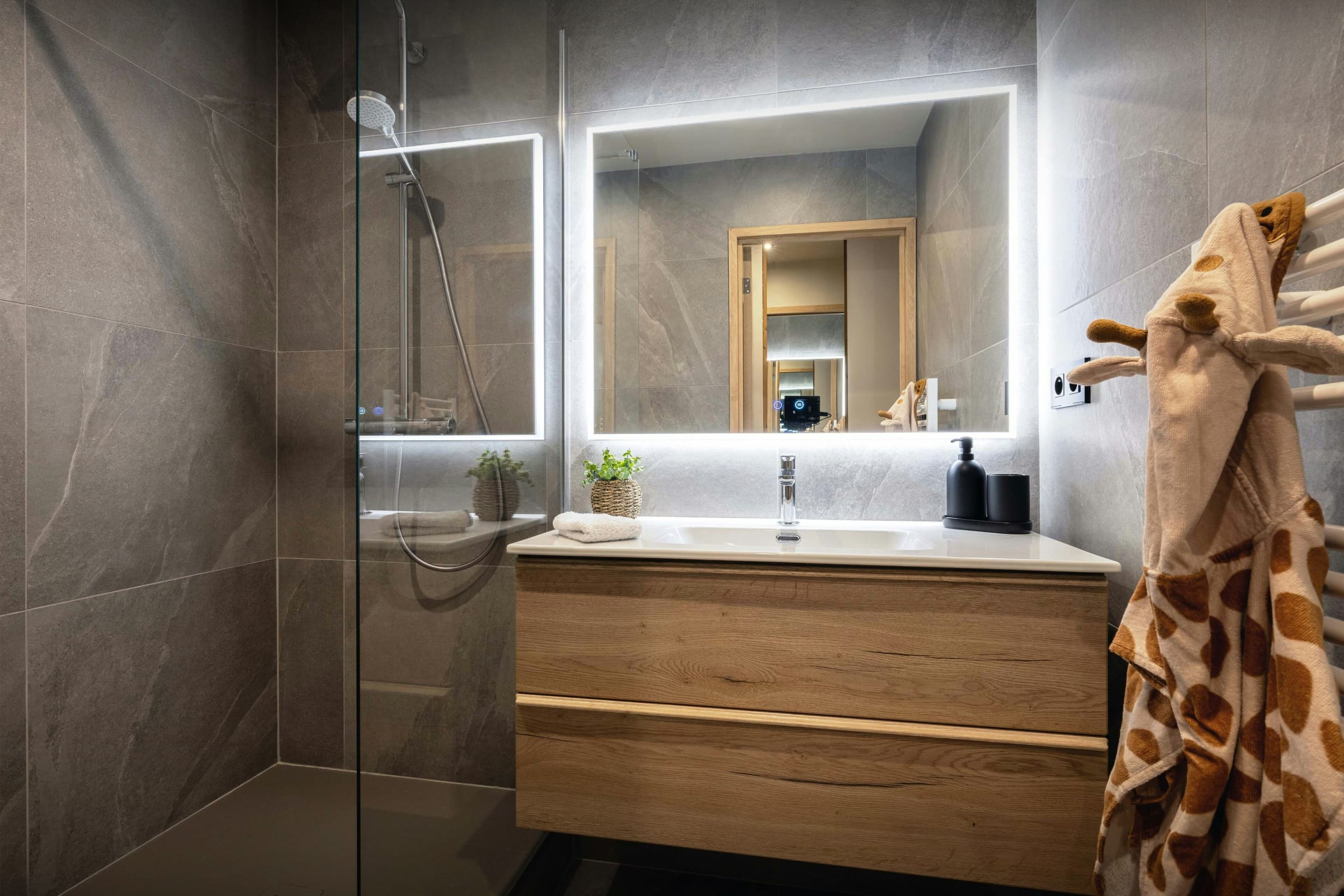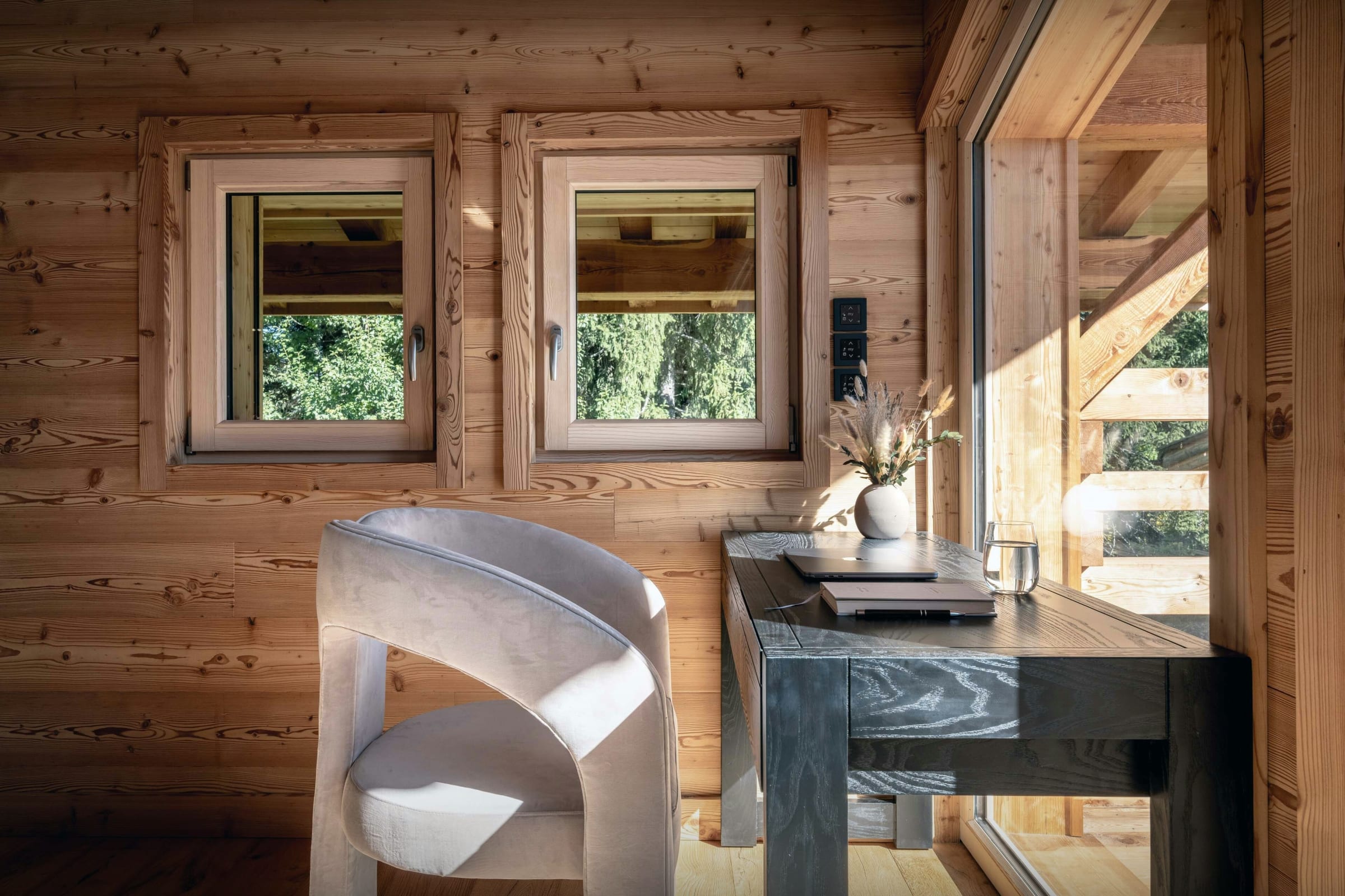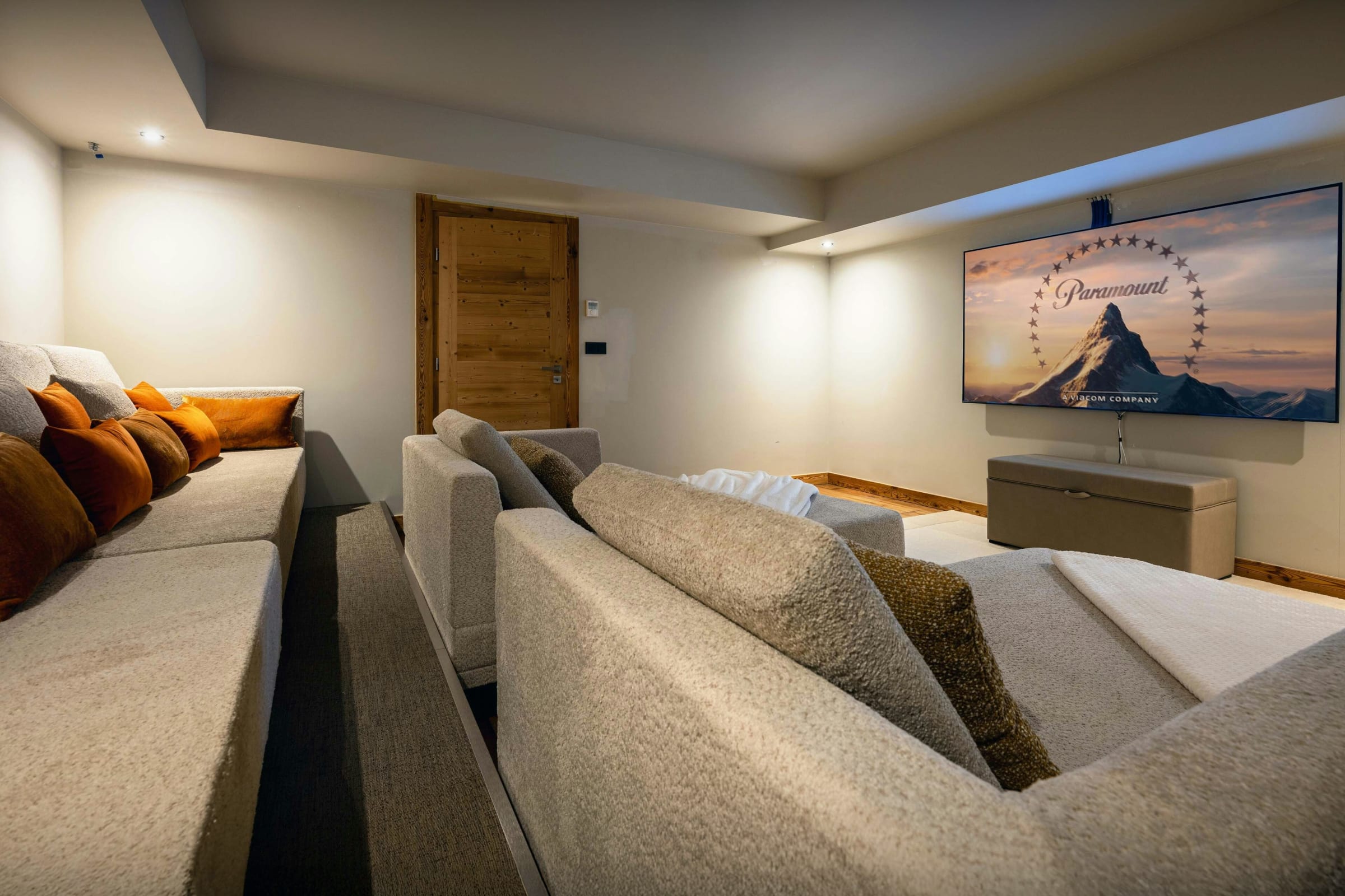 Vous ne trouverez pas de télévision dans le salon, mais une confortable salle de cinéma a été aménagée au rez-de-jardin. Ce niveau comprend également l’espace bien-être, composé d’un sauna et d’un hammam pour se détendre en fin de journée, ainsi qu’un local à skis fonctionnel et une buanderie avec lave-linge et sèche-linge.