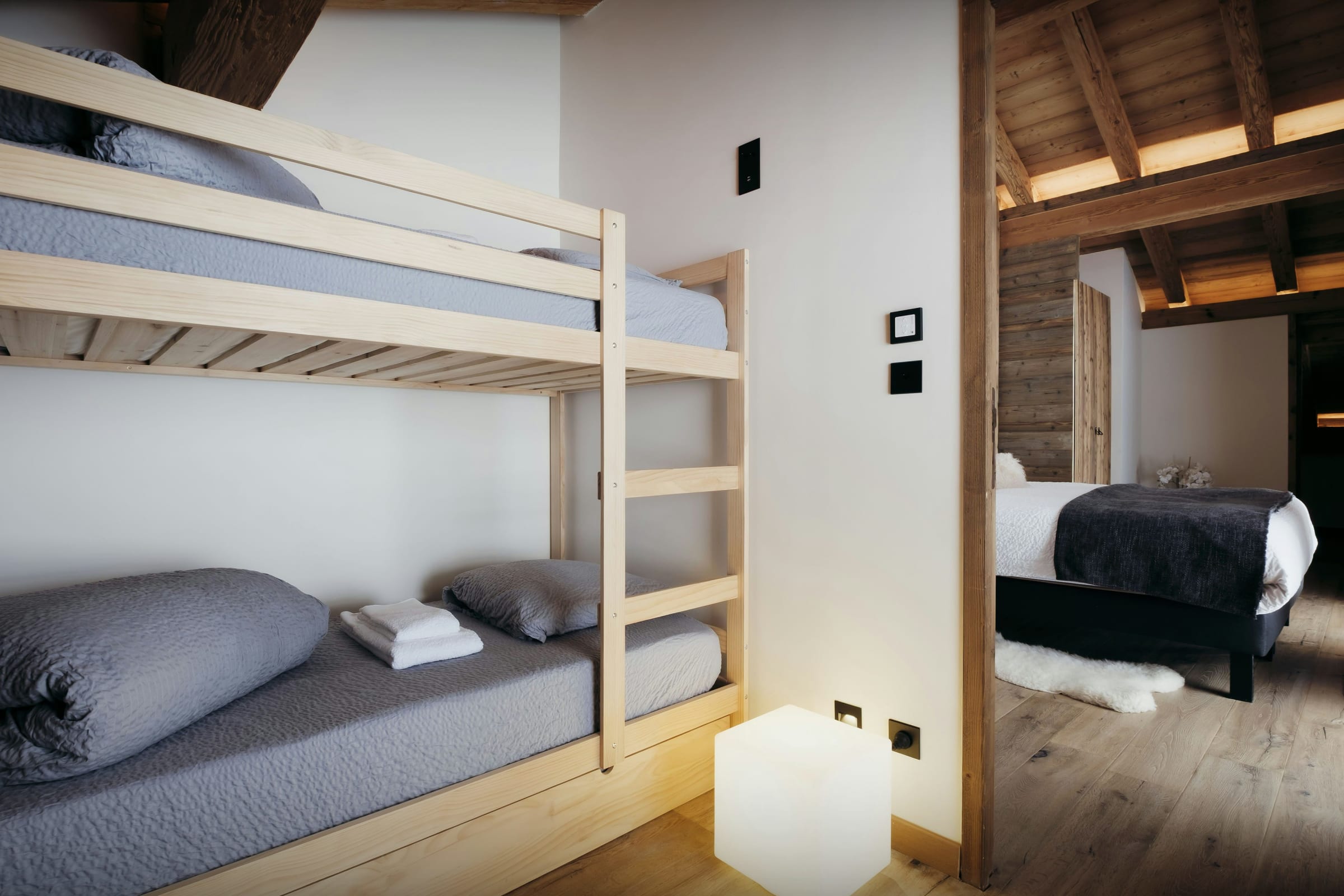 La dernière chambre est un dortoir qui peut accueillir un maximum de trois enfants, mais l’espace est alors plutôt restreint. Cette pièce agit comme un prolongement de la deuxième chambre, véritable suite parentale.