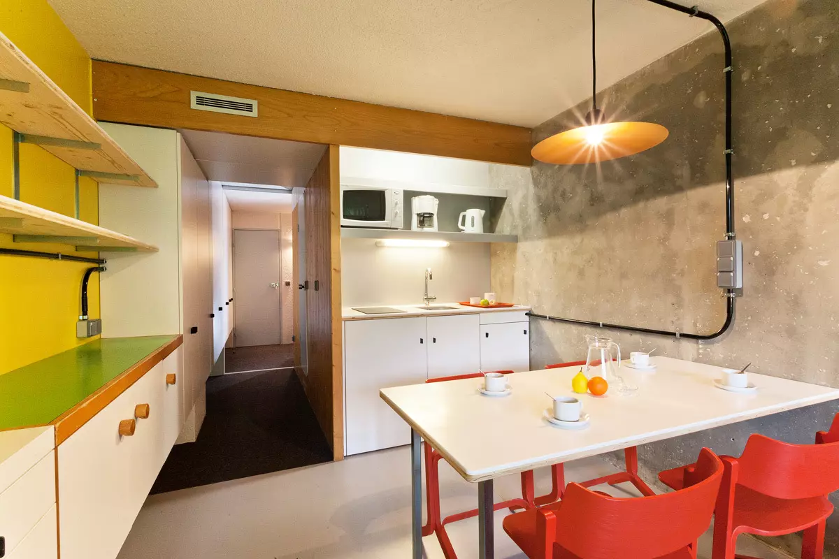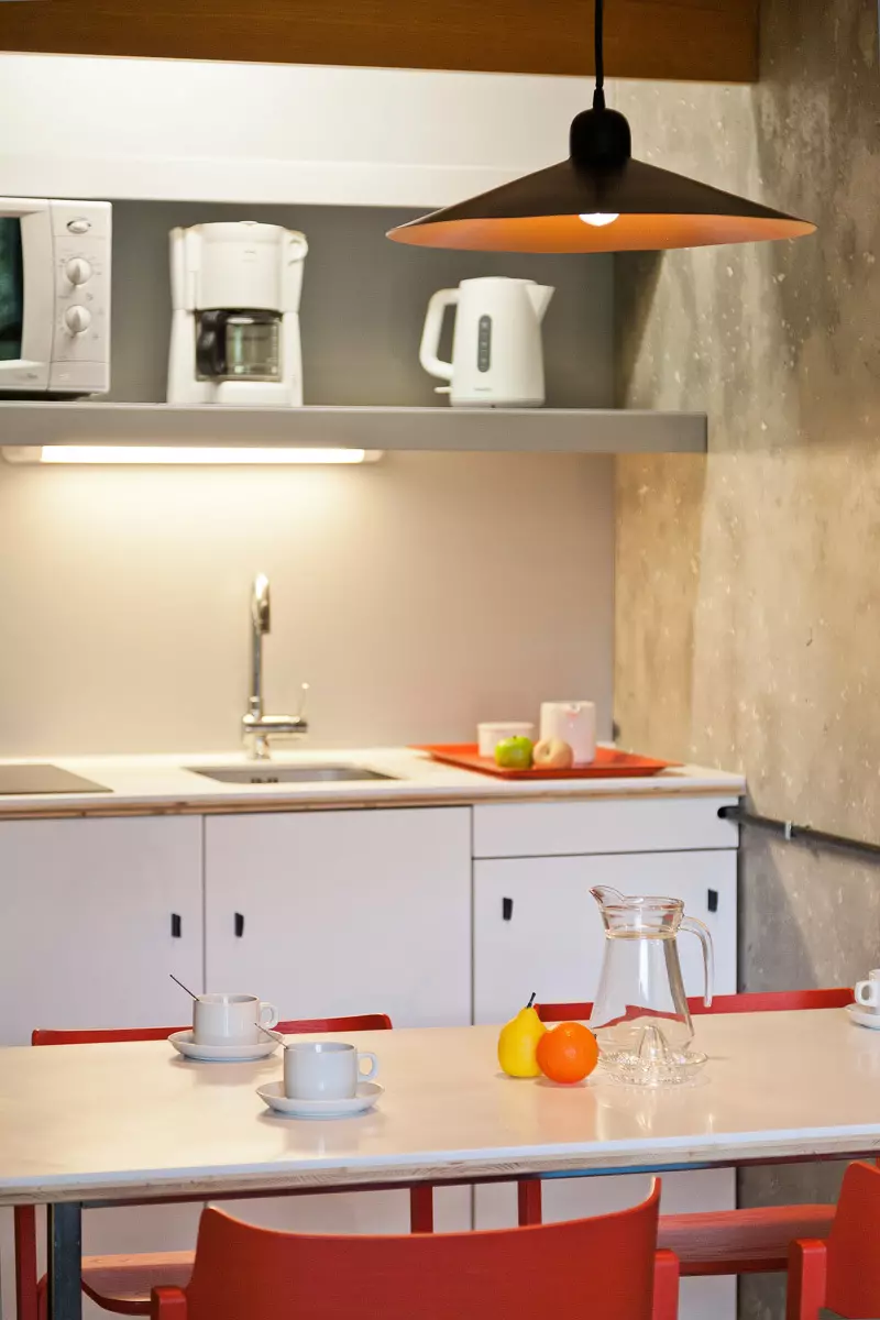 Coin cuisine comprenant : 2 plaques vitrocéramique, four combiné (grill + micro-ondes) , réfrigérateur/freezer, lave vaisselle, bouilloire, cafetière électrique à filtre, et grille pain.
