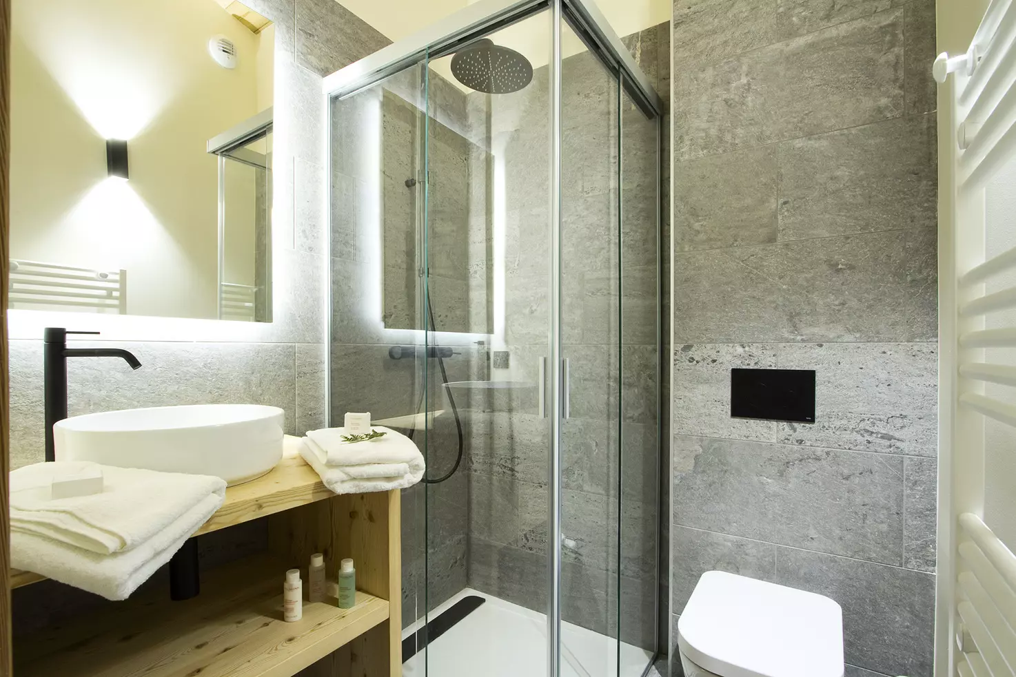 Une chambre avec un lit double et une salle de douche privative donnant sur la terrasse