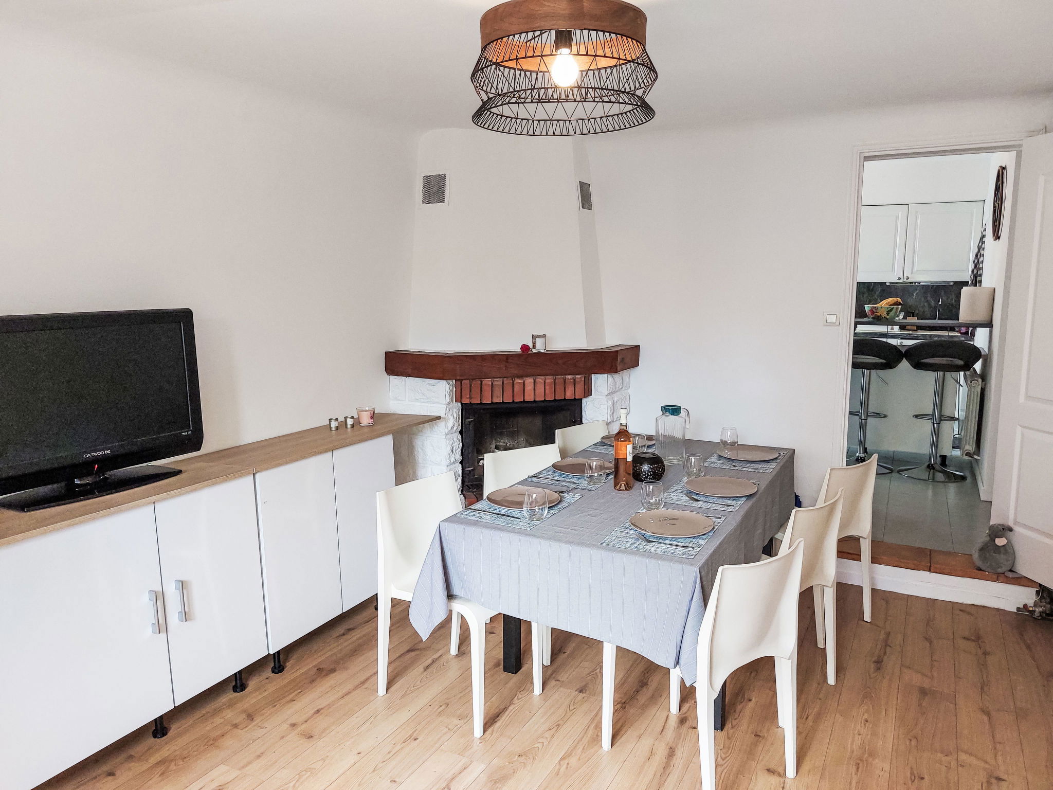 "Villeneuve Plage", maison 4 pièces 90 m2. Aménagement confortable: séjour/salle à manger avec TV. Sortie sur la terrasse. 1 chambre avec 1 grand-lit (140 cm, longueur 200 cm). 1 chambre avec 2 lits (90 cm, longueur 190 cm). Studio avec 1 grand-lit (140 cm, longueur 190 cm), douche/WC. Sortie sur la terrasse. Cuisine dans l'entrée (four, lave-vaisselle, 4 feux, grille-pain, bouilloire électrique, micro-ondes, congélateur, cafetière électrique). Sortie sur le jardin. Douche/WC, WC séparé. Chauffage au gaz. Terrasse 25 m2 partiellement couverte, situation sud. Meubles de terrasse. Vue sur le jardin. A disposition: lave-linge. Internet (Connexion WIFI, gratuit). Place de parking (2 Voitures). Veuillez noter: maison non-fumeur. 1 animal/ chien autorisé. Détecteur de fumée. Pas de liaison interne entre les différentes unités. Annonce d'un professionnel (art 155, IV du CGI) 06161001634HM