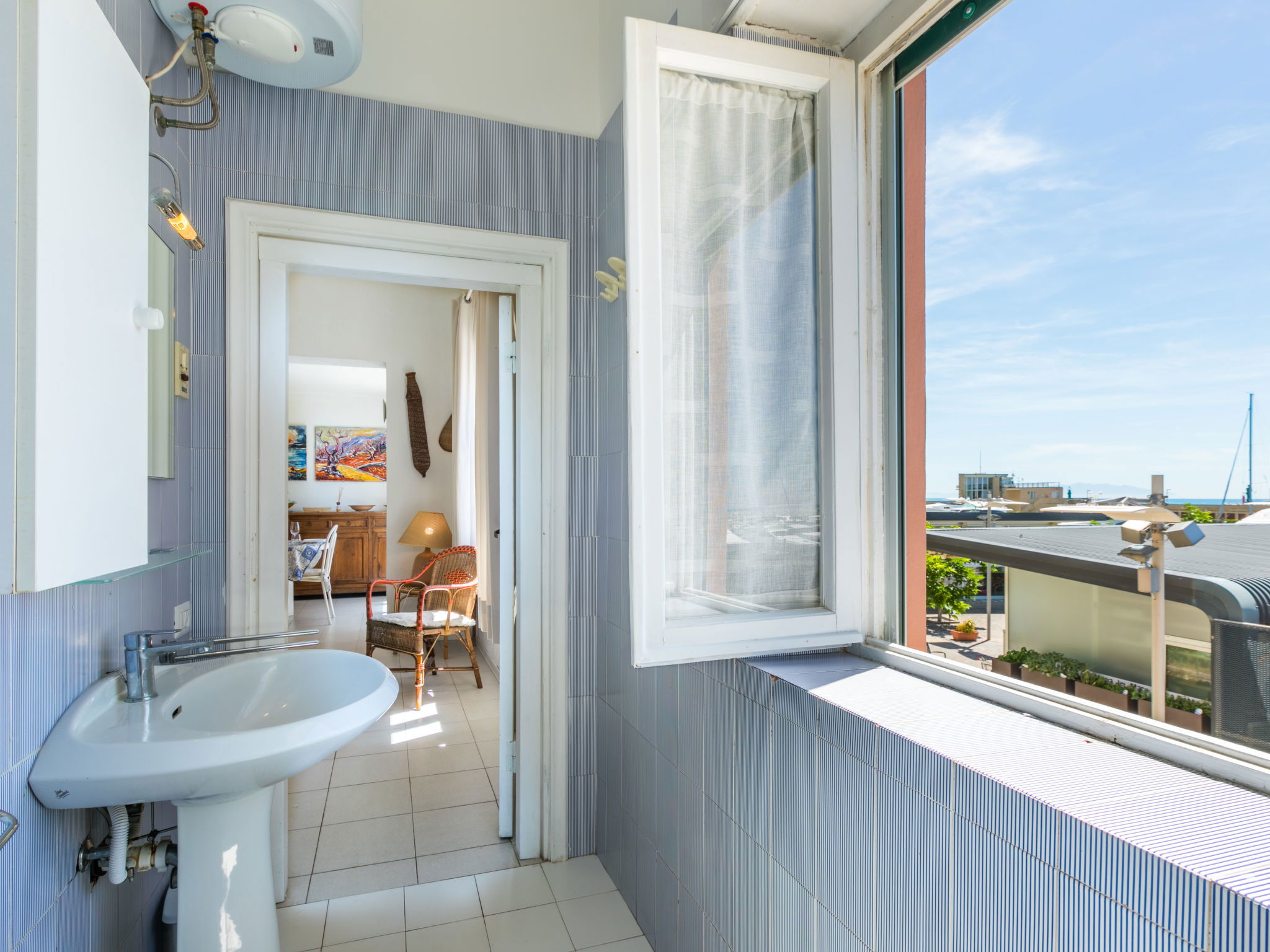 "Harbour", maison 2 pièces 55 m2, au rez-de-chaussée. Spacieux et clair, aménagement simple et fonctionnel: séjour/chambre à coucher avec 1 divan-lit double. Sortie sur le jardinet. 1 chambre double avec 1 lit double. Cuisine ouverte (lave-vaisselle, 4 plaques vitrocéramiques, grille-pain, bouilloire électrique, micro-ondes) avec table pour les repas et TV. Douche/bidet/WC. Chauffage électrique, air-conditionné. Jardinet. Meubles de terrasse. Très belle vue sur la mer et le port. Place de parking. Veuillez noter: maximum 1 animal/ chien autorisé. Entrée privée, extincteur. IT049018B425WZ96NT