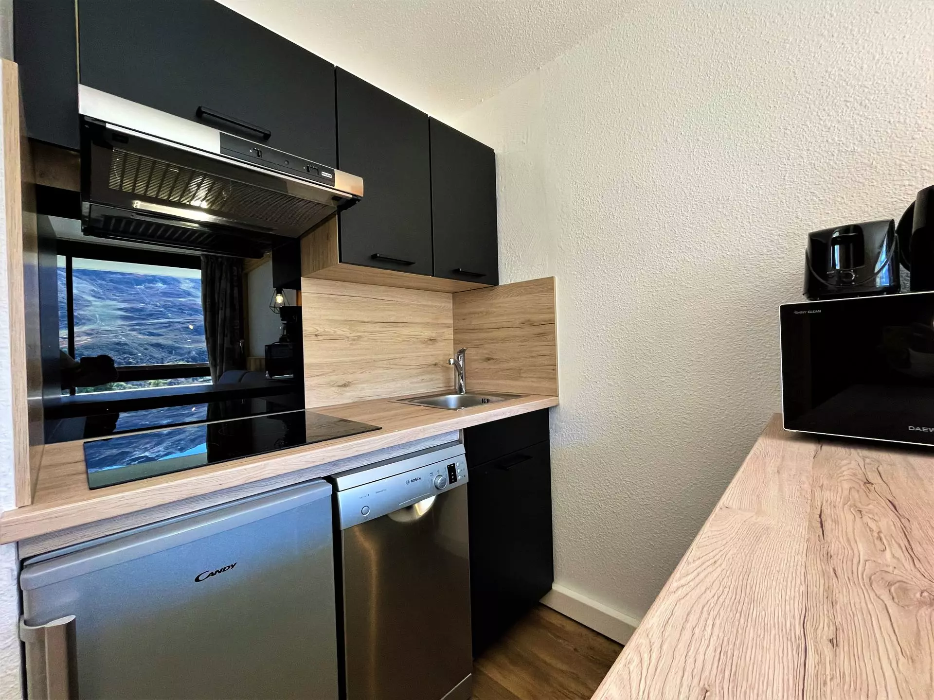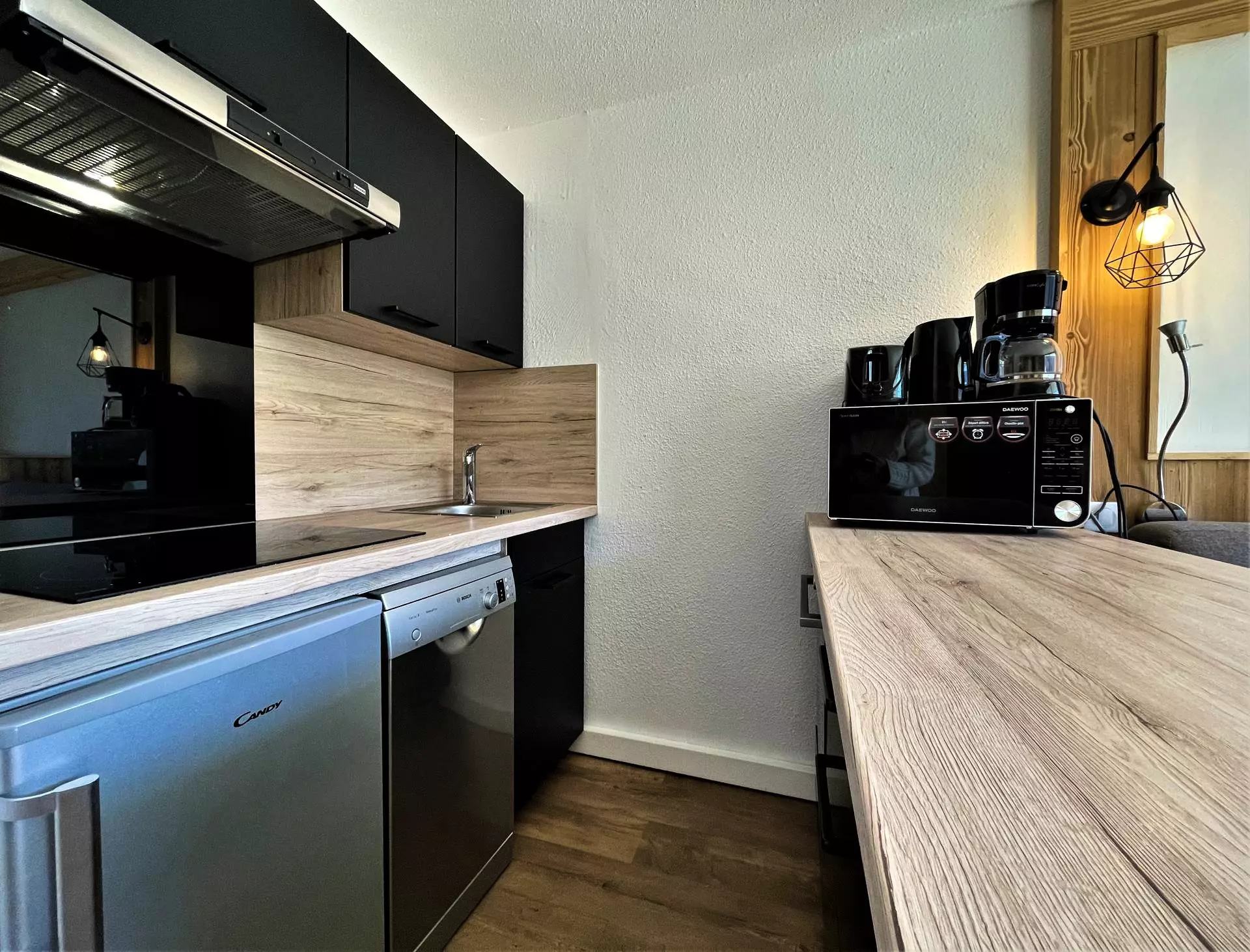 Cuisine : plaques induction (x2), réfrigérateur avec bac à glaçons de 5L, four, cafetière, lave vaisselle, bouilloire, grille pain