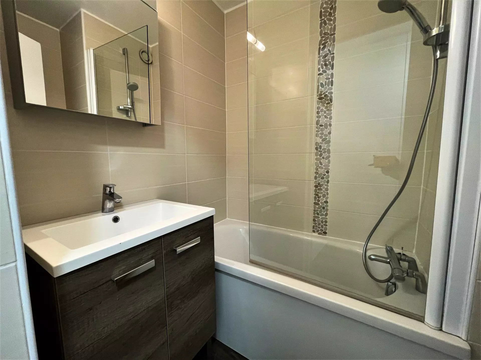 Salle de bain : lavabo, baignoire, sèche serviette, pare douche