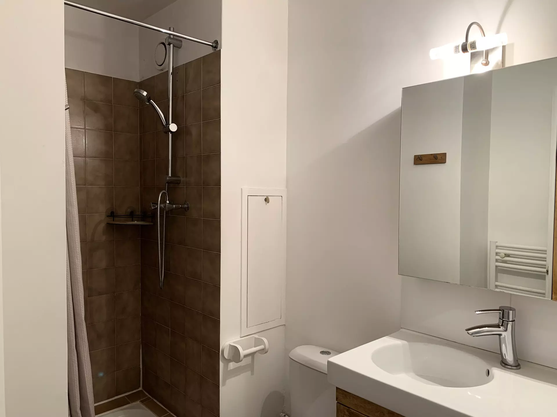 Salle de bains : lavabo, douche, sèche-serviettes, sèche-cheveux, toilettes