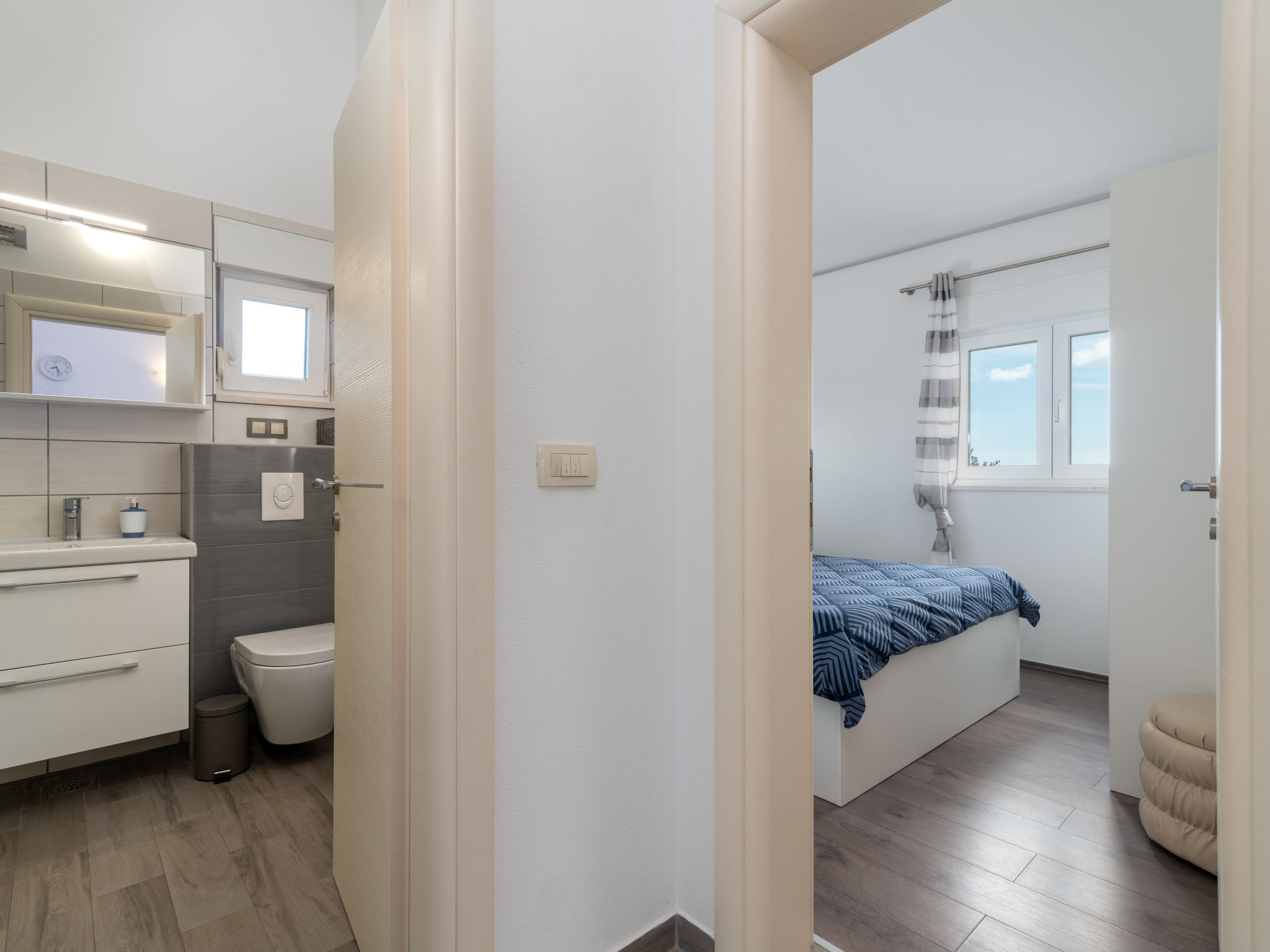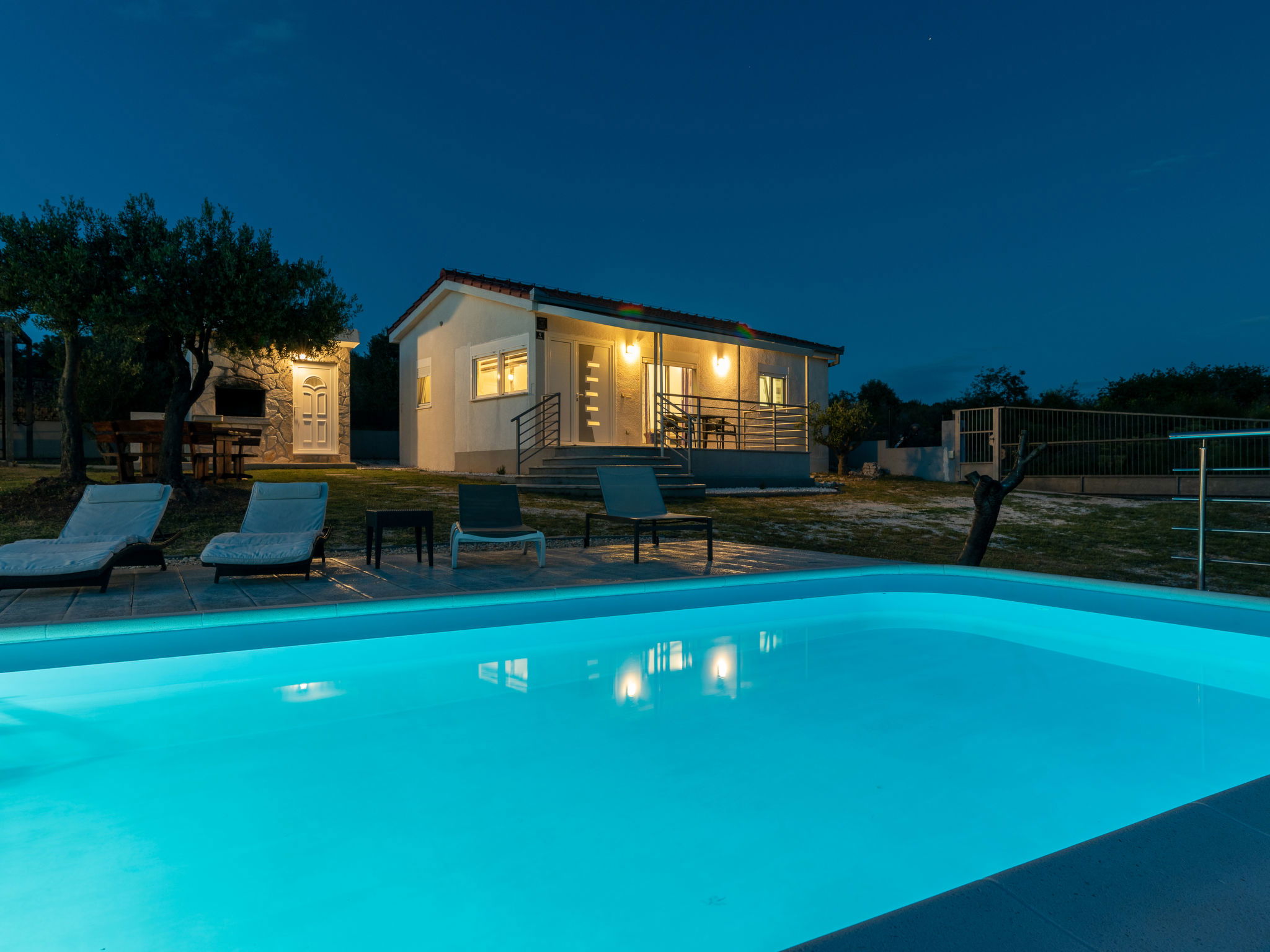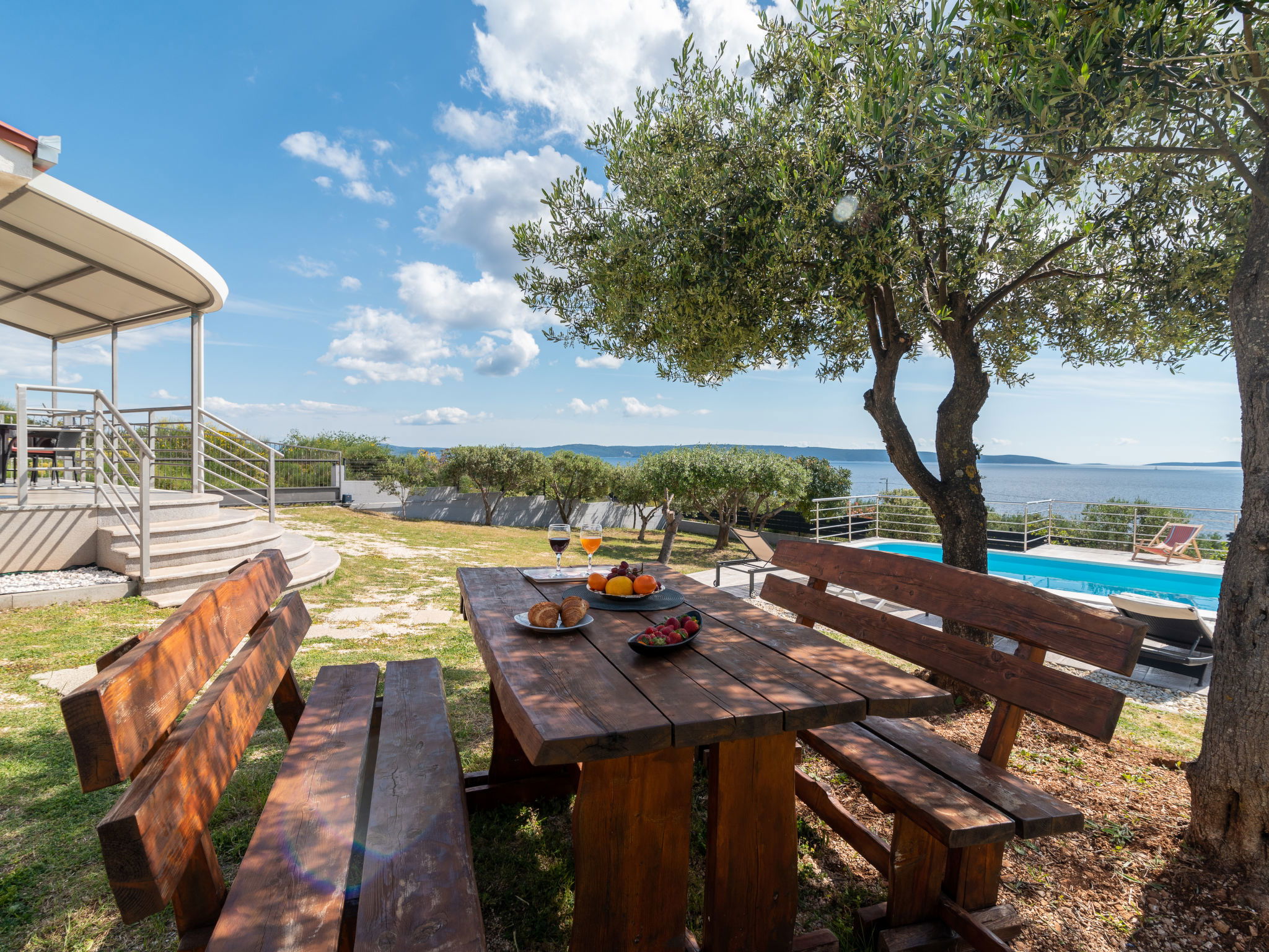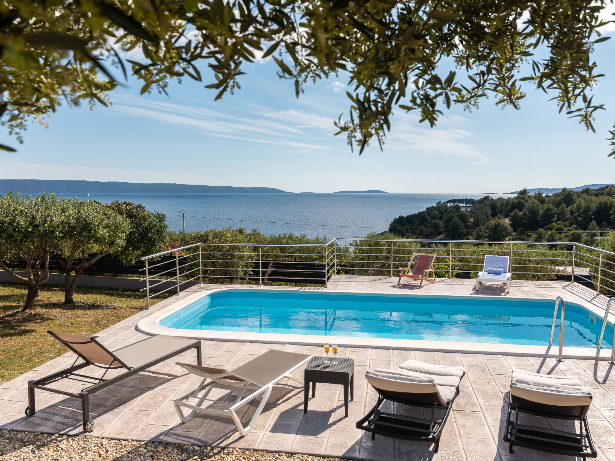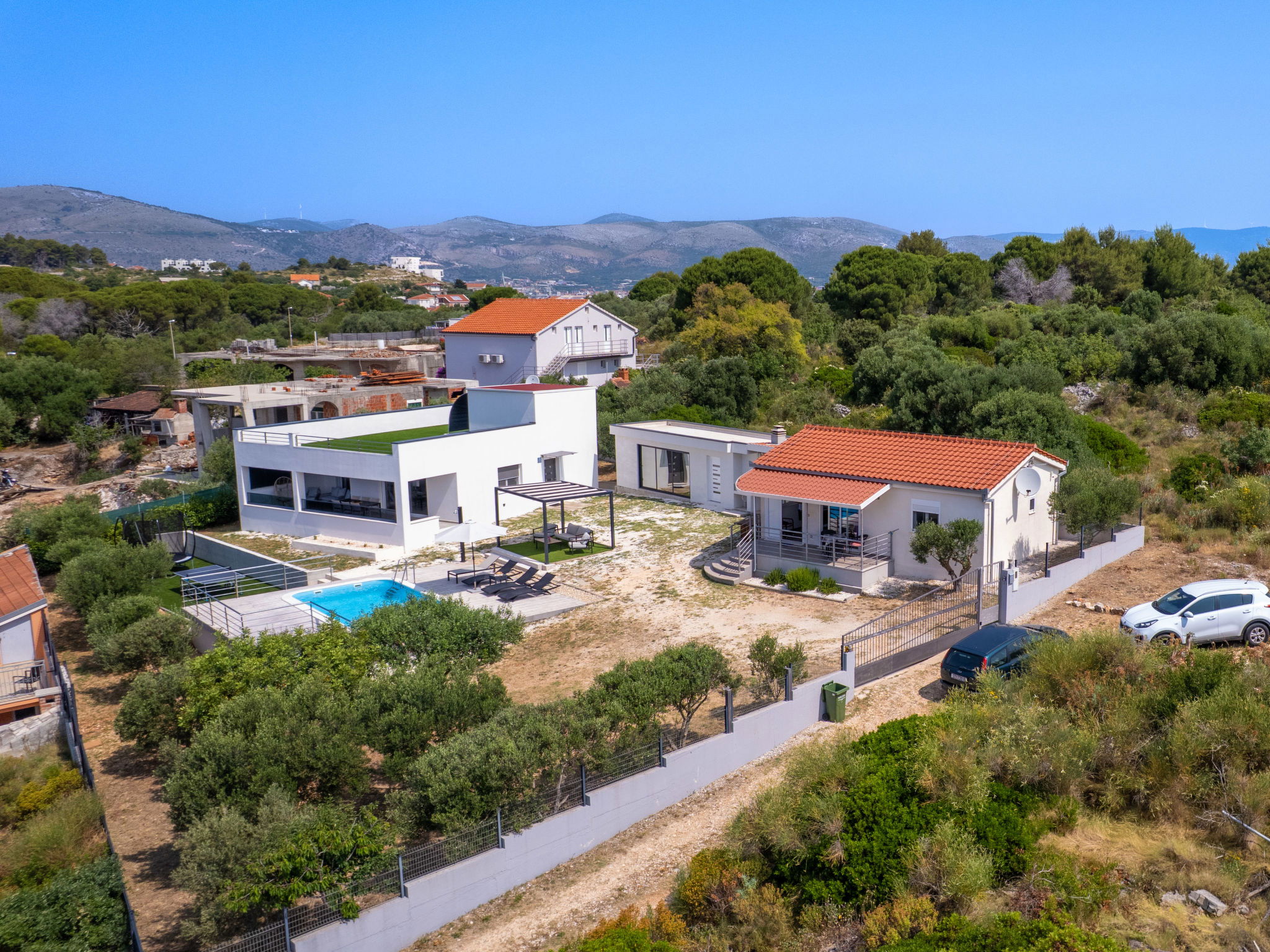 Okrug Gornji (Čiovo): Maison "Ria with heated pool". À 1.5 km du centre d'Okrug Gornji, à 5 km du centre de Trogir, situation tranquille, ensoleillée, à 180 m de la mer, à 180 m de la plage. A usage privé: terrain 1'200 m2 (clôturé), arbres, piscine chauffée (26 m2, profondeur 150 cm, disponibilité saisonnière: 04.Avr. - 06.Nov.). Douche extérieure, meubles de jardin, barbecue. Infrastructures de la Maison: accès internet, terrasse sur le toit, lave-linge. Accès en voiture jusqu'à la maison (50 m chemin non goudronné). Place de parking (pour 3 voitures) près de la maison sur le terrain. Magasins 500 m, supermarché 1.5 km, restaurant 1.5 km, arrêt de bus 500 m, plage de graviers 180 m. Veuillez noter: Aéroport 10 km de la maison. L‘unité comprend une grande maison (100 m2) et une petite maison (46 m2), louées ensemble.