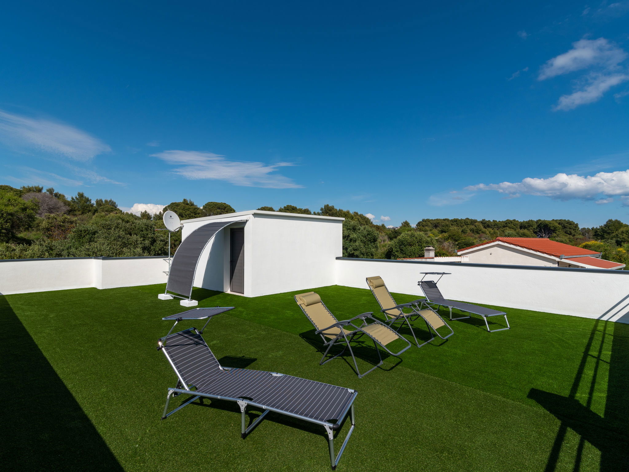 Maison 6 pièces 145 m2. Aménagement moderne: séjour/salle à manger avec 1 divan-lit, coin-cuisine et TV (satellite) (écran plat), air-conditionné. Sortie sur la terrasse. 1 chambre avec 1 lit double. 1 chambre avec 2 lits. Séjour/salle à manger avec 1 divan-lit double (140 cm, longueur 220 cm), TV (satellite) et air-conditionné. Sortie sur la terrasse. 1 chambre avec 1 grand-lit (180 cm, longueur 200 cm), douche/WC et air-conditionné. Sortie sur la terrasse. 1 chambre avec 1 grand-lit (180 cm, longueur 200 cm), douche/WC et air-conditionné. Cuisine ouverte (four, lave-vaisselle, 4 plaques vitrocéramiques, grille-pain, bouilloire électrique, congélateur, cafetière électrique). Douche/WC, WC séparé. Pas de chauffage. Terrasse 16 m2, couverte, terrasse 35 m2, couverte. Meubles de terrasse, chaises longues. Vue panoramique sur la mer. A disposition: coffre-fort, moustiquaire. Internet (Connexion WIFI, gratuit).