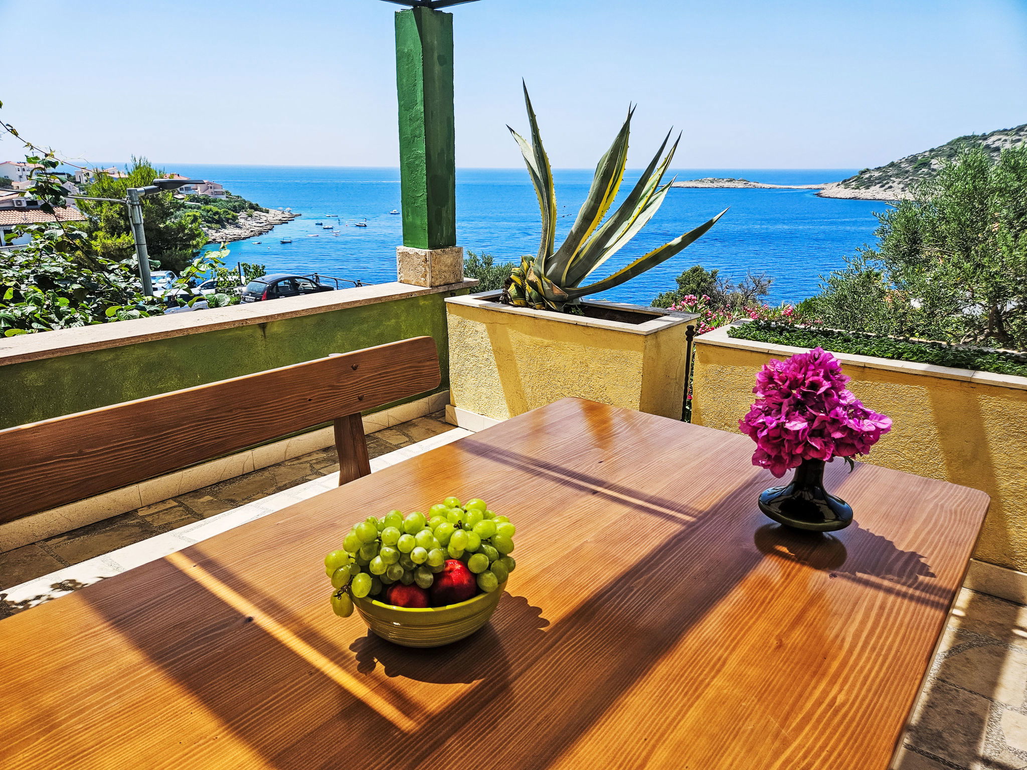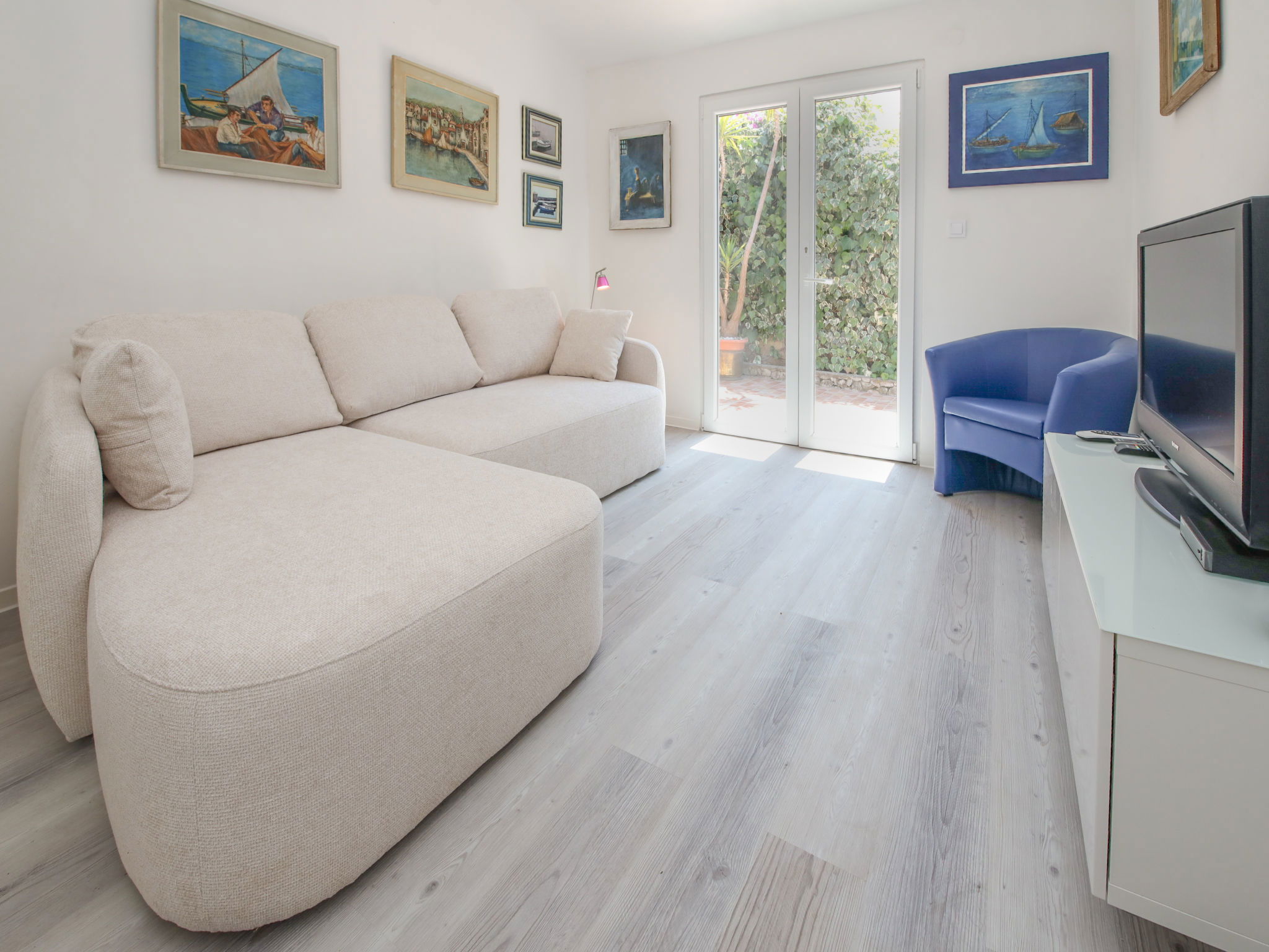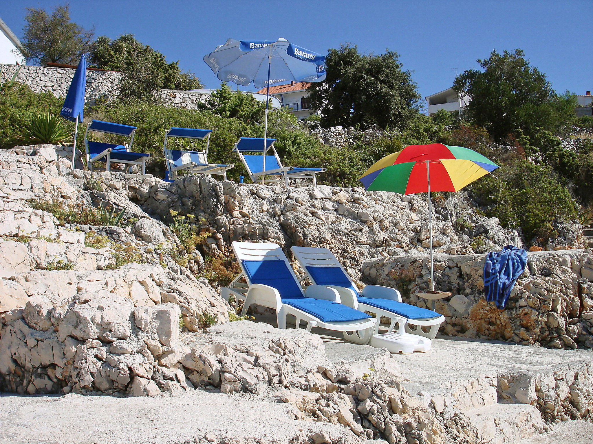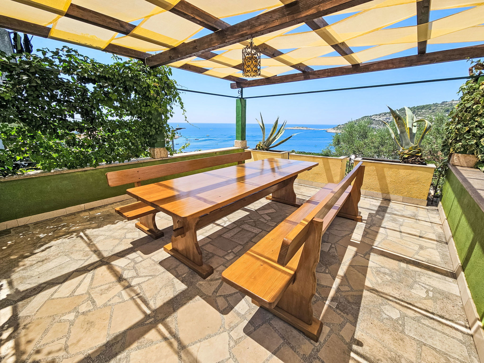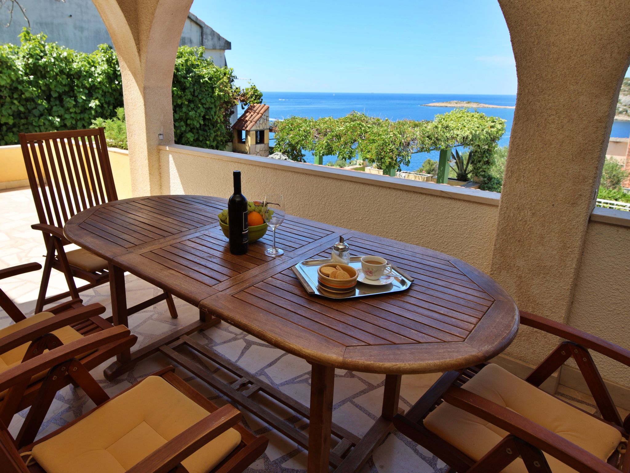 Maison 6 pièces 150 m2 sur 3 niveaux. Séjour avec TV (satellite) (écran plat), DVD et air-conditionné. Sortie sur la terrasse. Salle à manger. Cuisine ouverte (4 plaques de cuisson, four, lave-vaisselle, micro-ondes, congélateur, cafetière électrique). WC séparé. À l'étage inférieur: (escalier extérieur) petit séjour/chambre à coucher avec TV (satellite) (écran plat). Sortie sur la terrasse. Douche/WC. À l'étage supérieur: 1 chambre double avec douche et air-conditionné. Sortie sur le balcon. 1 chambre double avec douche et air-conditionné. Sortie sur la terrasse. 1 chambre double avec TV (satellite) et air-conditionné. Sortie sur la terrasse. Bain/WC. Balcon, grande terrasse 25 m2, couverte, terrasse 25 m2. Meubles de terrasse, chaises longues. Superbe vue sur la mer. A disposition: coffre-fort. Internet (Connexion WIFI, gratuit). Garage (2 Voitures).