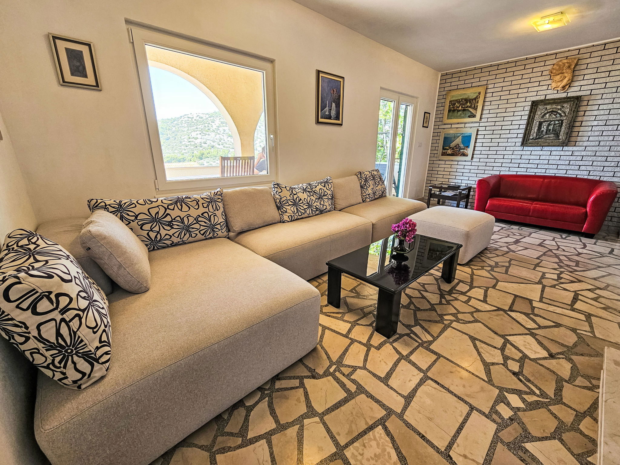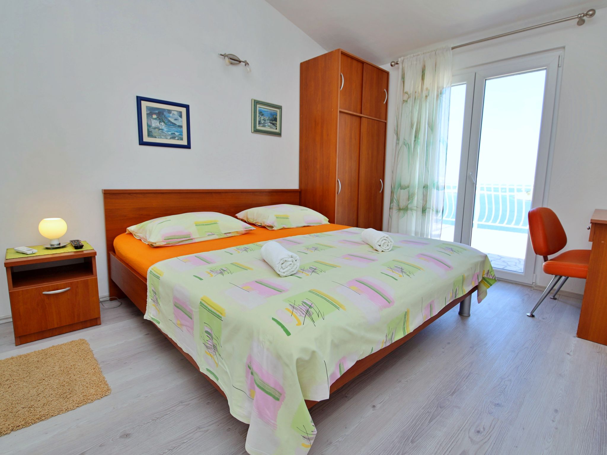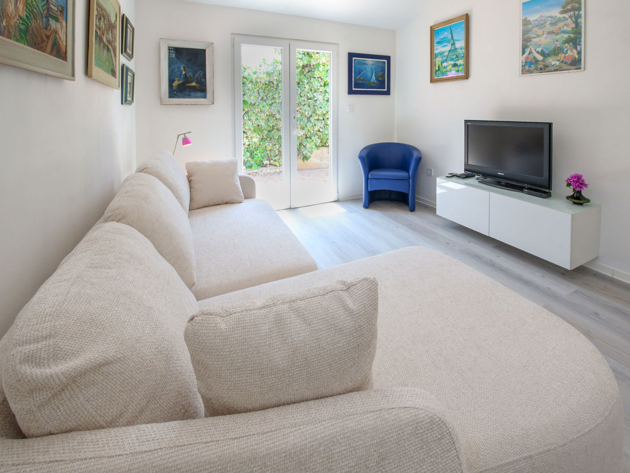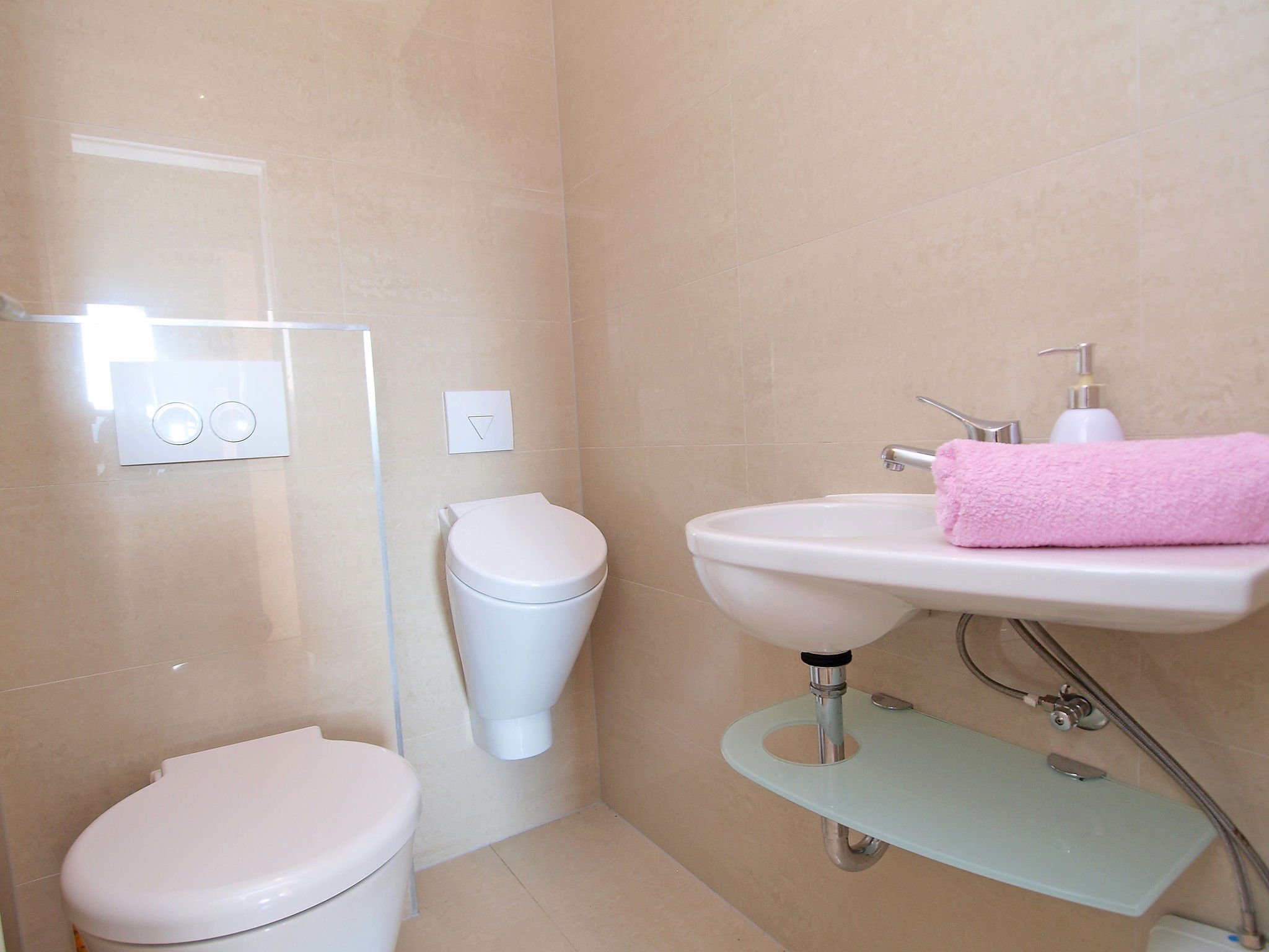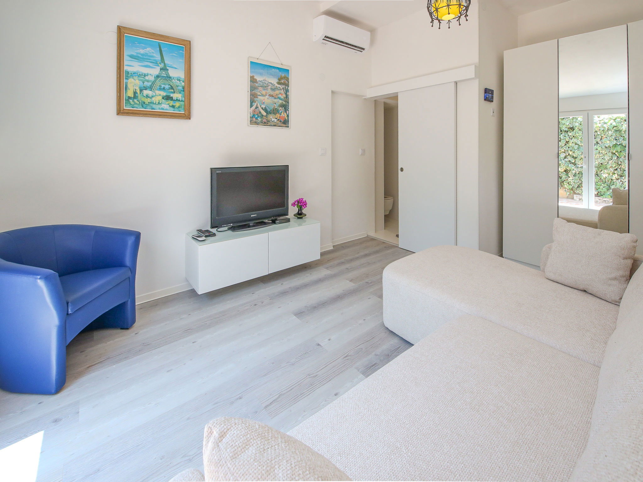 Maison 6 pièces 150 m2 sur 3 niveaux. Séjour avec TV (satellite) (écran plat), DVD et air-conditionné. Sortie sur la terrasse. Salle à manger. Cuisine ouverte (4 plaques de cuisson, four, lave-vaisselle, micro-ondes, congélateur, cafetière électrique). WC séparé. À l'étage inférieur: (escalier extérieur) petit séjour/chambre à coucher avec TV (satellite) (écran plat). Sortie sur la terrasse. Douche/WC. À l'étage supérieur: 1 chambre double avec douche et air-conditionné. Sortie sur le balcon. 1 chambre double avec douche et air-conditionné. Sortie sur la terrasse. 1 chambre double avec TV (satellite) et air-conditionné. Sortie sur la terrasse. Bain/WC. Balcon, grande terrasse 25 m2, couverte, terrasse 25 m2. Meubles de terrasse, chaises longues. Superbe vue sur la mer. A disposition: coffre-fort. Internet (Connexion WIFI, gratuit). Garage (2 Voitures).