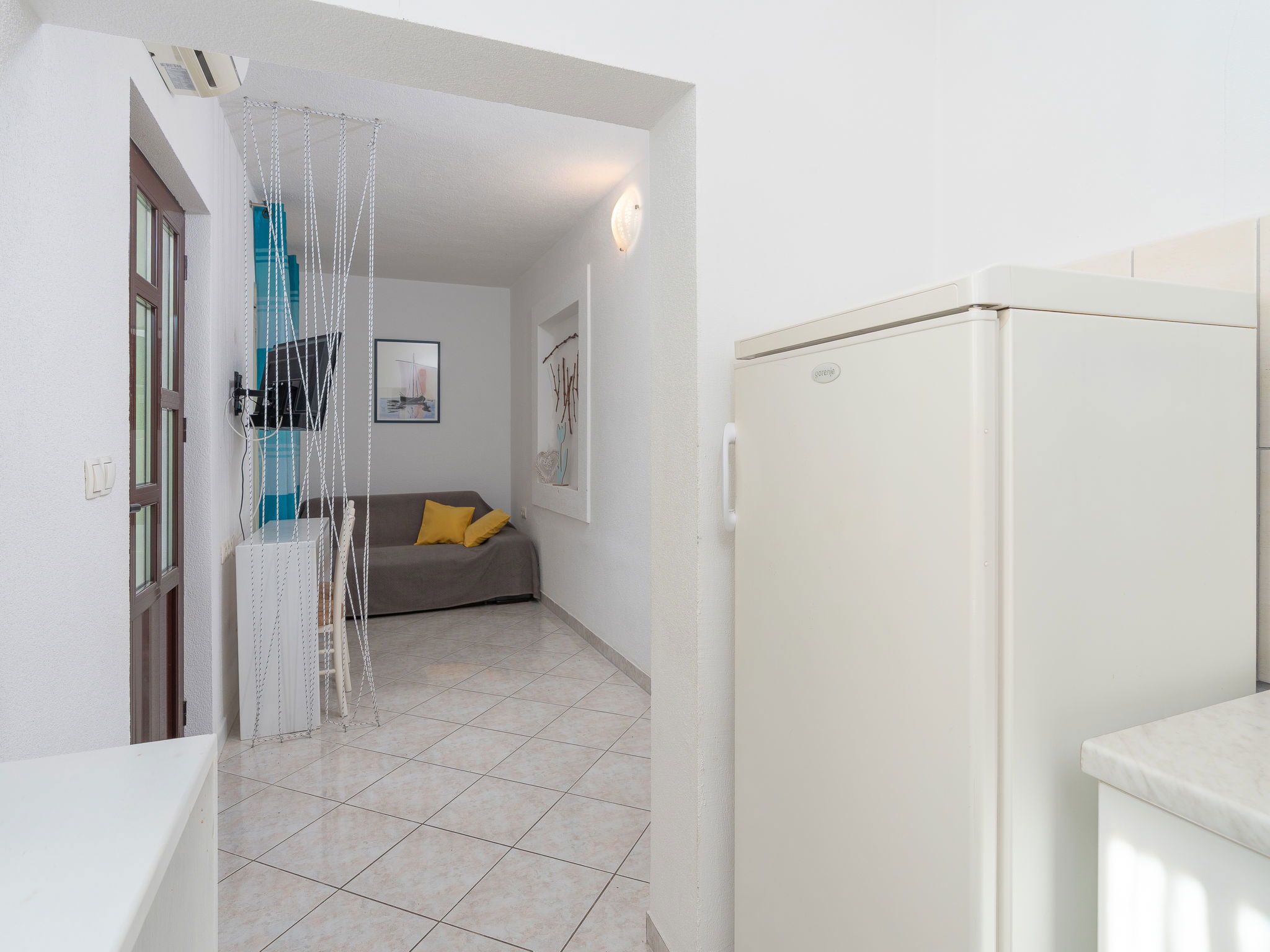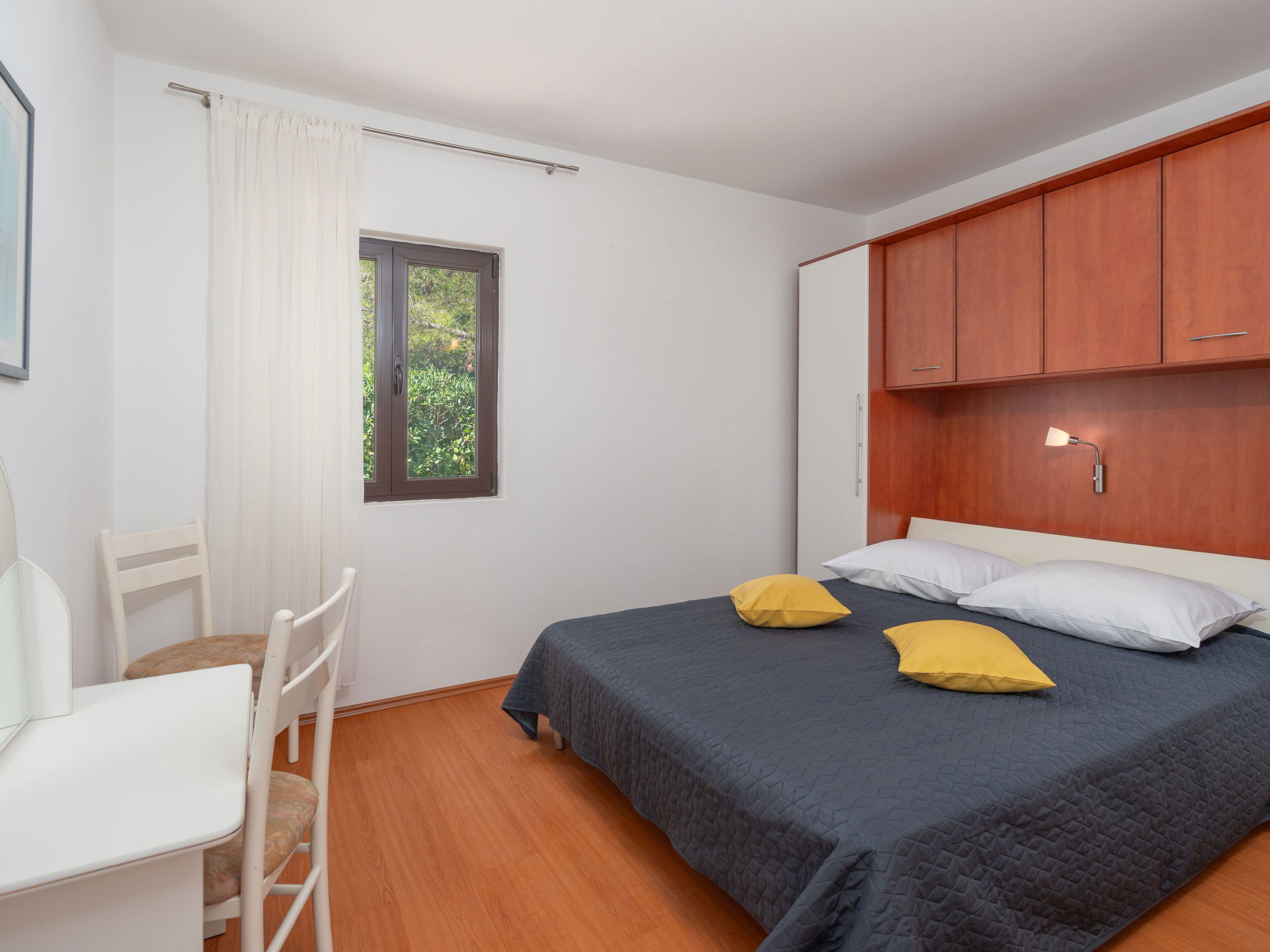 Maison 3 pièces 55 m2. Séjour/salle à manger 16 m2 avec TV (satellite) et air-conditionné. 1 chambre avec 1 grand-lit (160 cm, longueur 200 cm). 1 chambre avec 2 lits (90 cm, longueur 200 cm). Petite cuisine ouverte (4 plaques de cuisson, four). Douche/WC. Air-conditionné (en sus). Pas de chauffage. Terrasse 16 m2, couverte. Meubles de terrasse. A disposition: Internet (Connexion WIFI, gratuit). Maximum 1 animal/ chien autorisé.