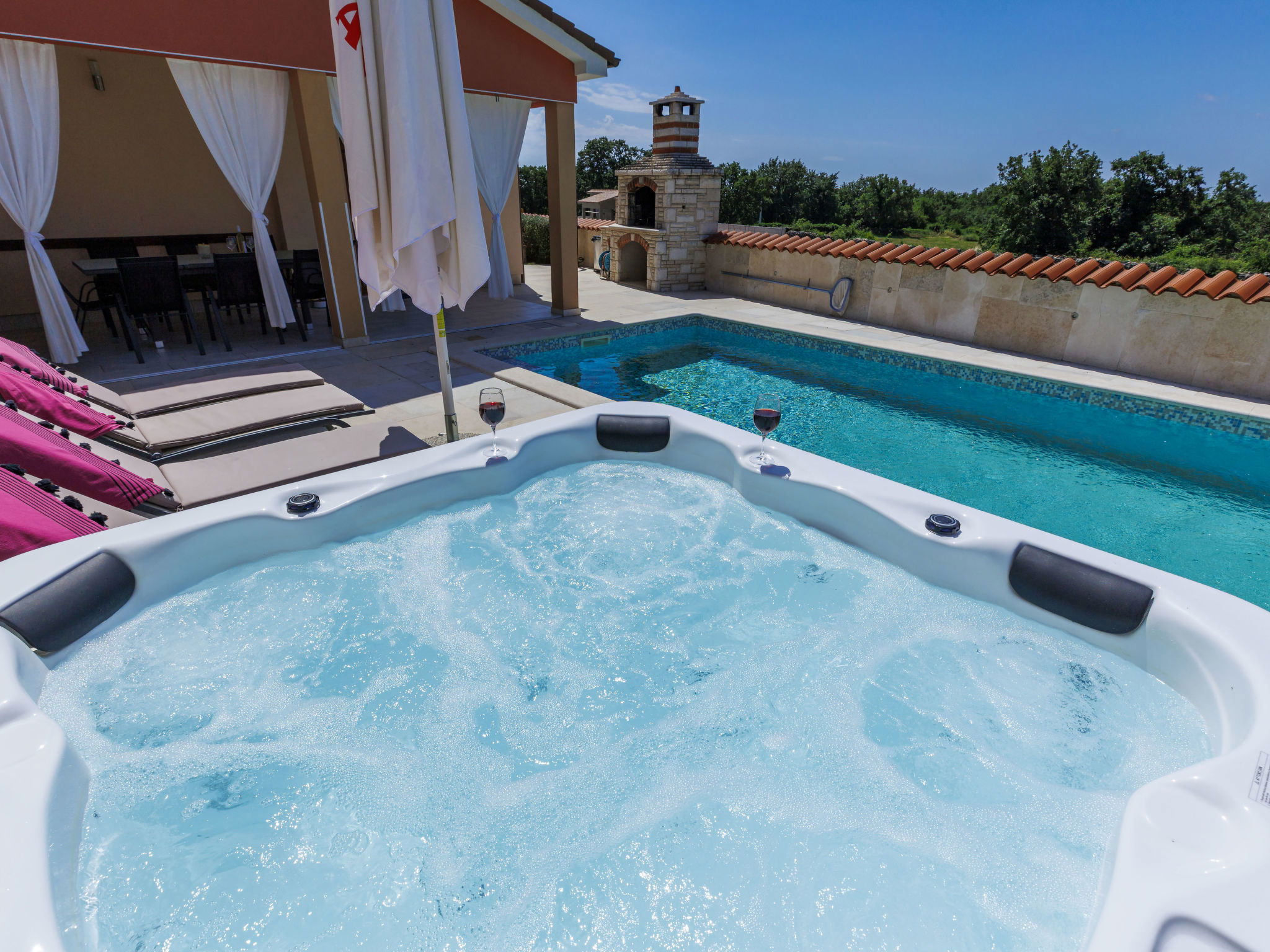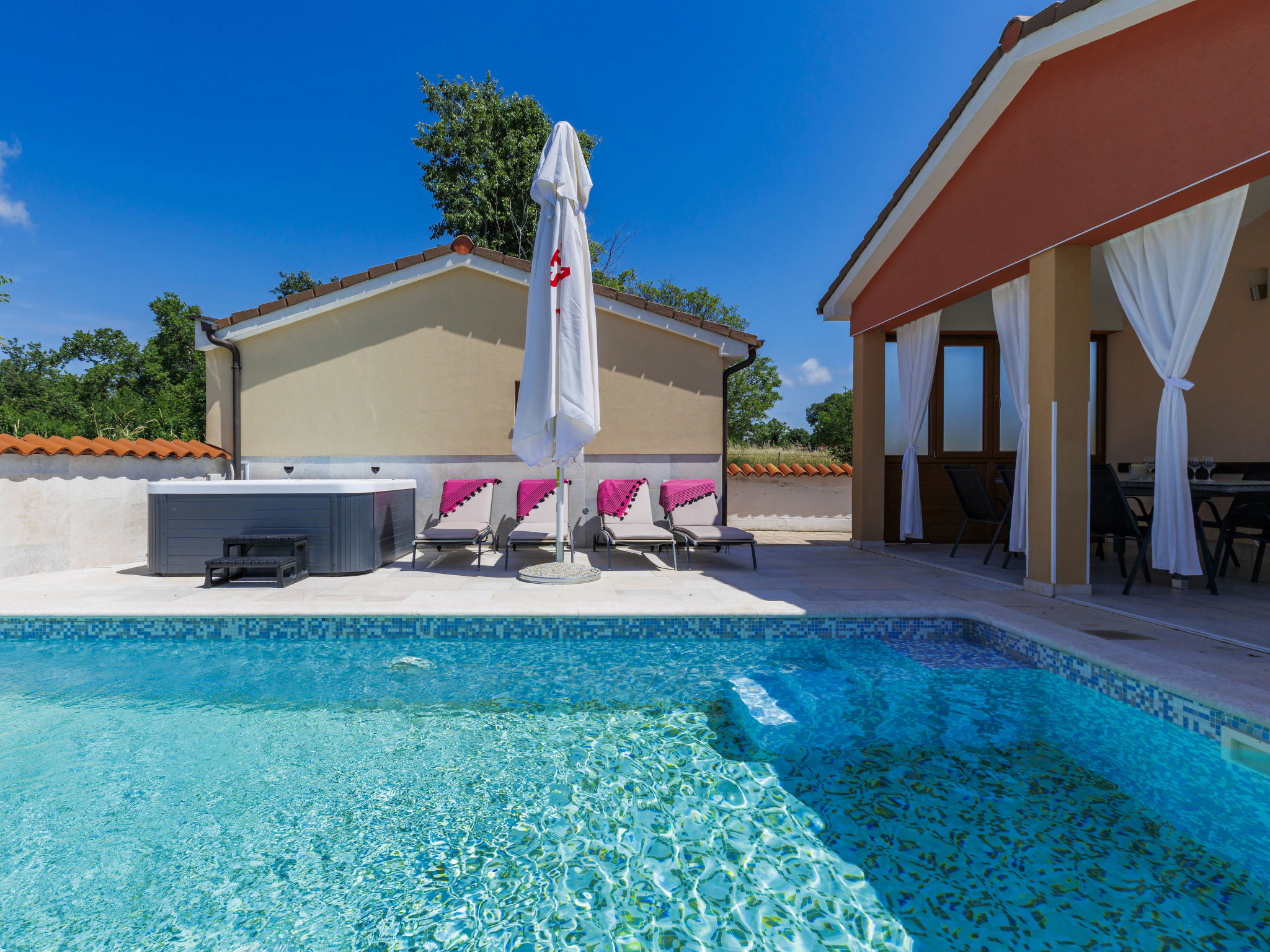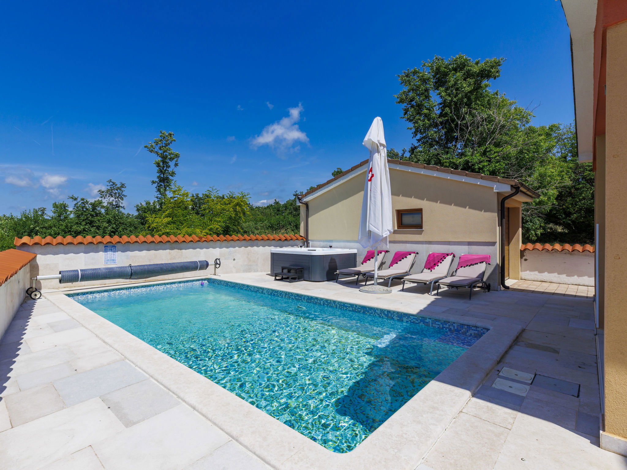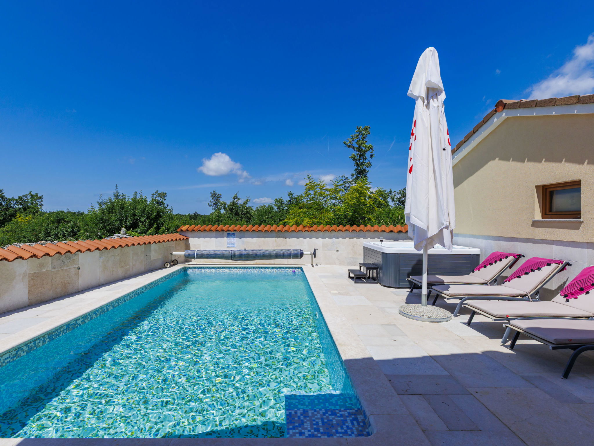 À 15 km de Pula: Maison individuelle accueillante "Manera". Dans le hameau de Krvavići, à 3 km du centre de Marčana, situation ensoleillée, à 10 km de la mer. A usage privé: terrain 400 m2 (clôturé), petit jardin avec pelouse, piscine rectangulaire, chauffée (8 x 4 m, profondeur 140 cm, disponibilité saisonnière: 01.Mar. - 01.Dec.) avec marches intérieures. Douche extérieure, bain à remous , terrasse (20 m2), barbecue, entretien de la piscine par le propriétaire/jardinier. Infrastructures de la Maison: accès internet. Place de parking (pour 4 voitures) près de la maison sur le terrain. Magasins 3 km, restaurant 3 km, arrêt de bus 3 km, plage de graviers 10 km, plage de rochers 10 km.
