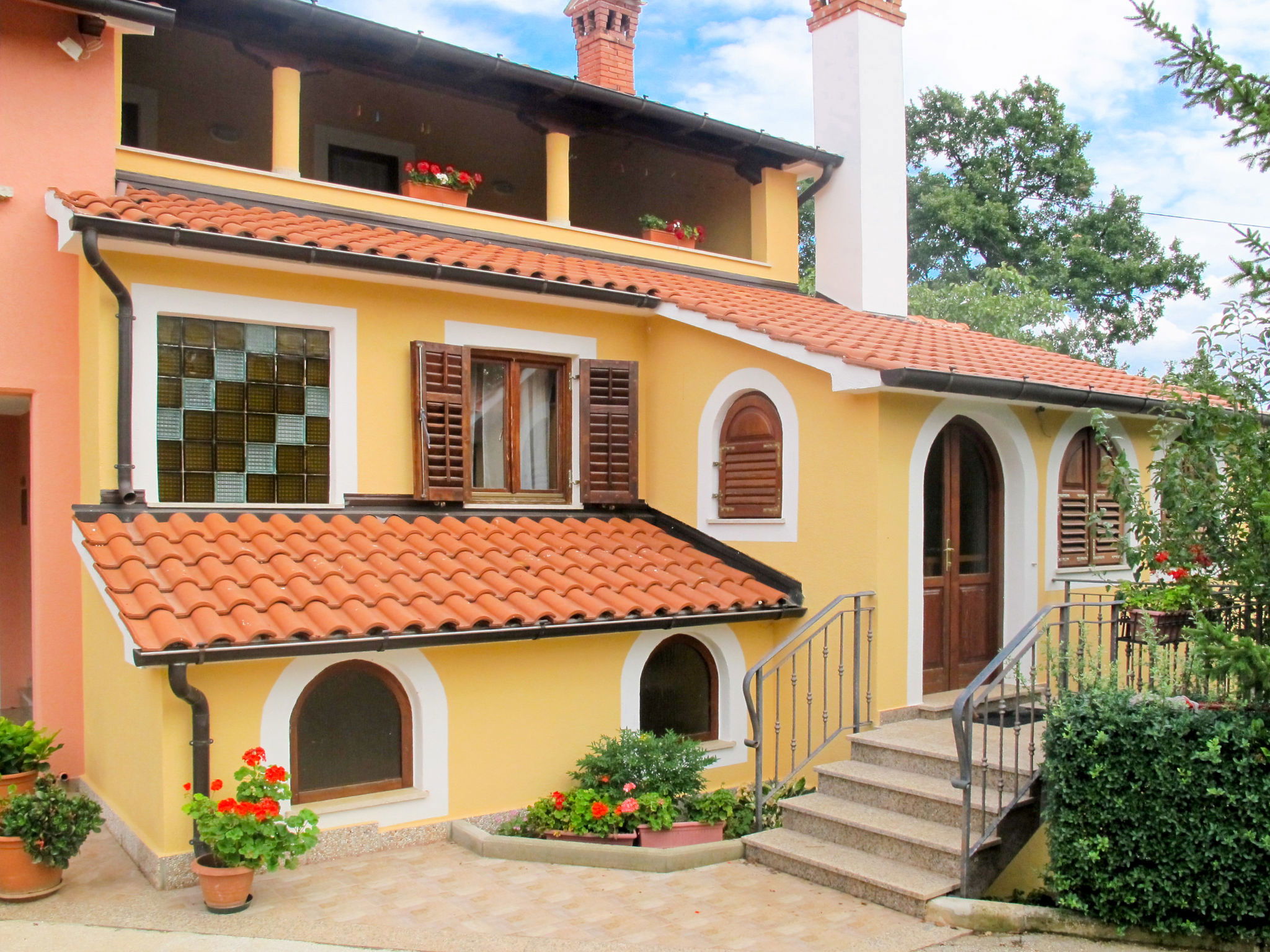 Maison mitoyenne 8 pièces 185 m2 sur 2 niveaux. Séjour/salle à manger avec TV (satellite) et air-conditionné. Sortie sur la terrasse. 2 chambres, chaque chambre avec: 1 lit double. Cuisine ouverte (4 plaques de cuisson, four, lave-vaisselle, grille-pain, bouilloire électrique, micro-ondes, cafetière électrique). 2 douches/WC. À l'étage supérieur: séjour/salle à manger avec TV (satellite) et air-conditionné. Sortie sur le balcon. Séjour. 2 chambres, chaque chambre avec: 1 lit double. 1 chambre avec 2 lits et 1 lit double. Cuisine ouverte (4 plaques de cuisson, four, lave-vaisselle, grille-pain, bouilloire électrique, micro-ondes, congélateur). 2 douches/WC, WC séparé. Chauffage au gaz. 2 terrasses couverte. Meubles de terrasse, chaises longues. A disposition: lave-linge, chaise haute pour enfant, lit bébé. Internet (Connexion WIFI, gratuit). Veuillez noter: maison non-fumeur. Maximum 3 animaux/ chiens autorisés. Entrée privée. Pas de liaison interne entre les différentes unités. Si le nombre d’occupants n’atteint pas le maximum, toutes les maisons ne seront pas disponibles.