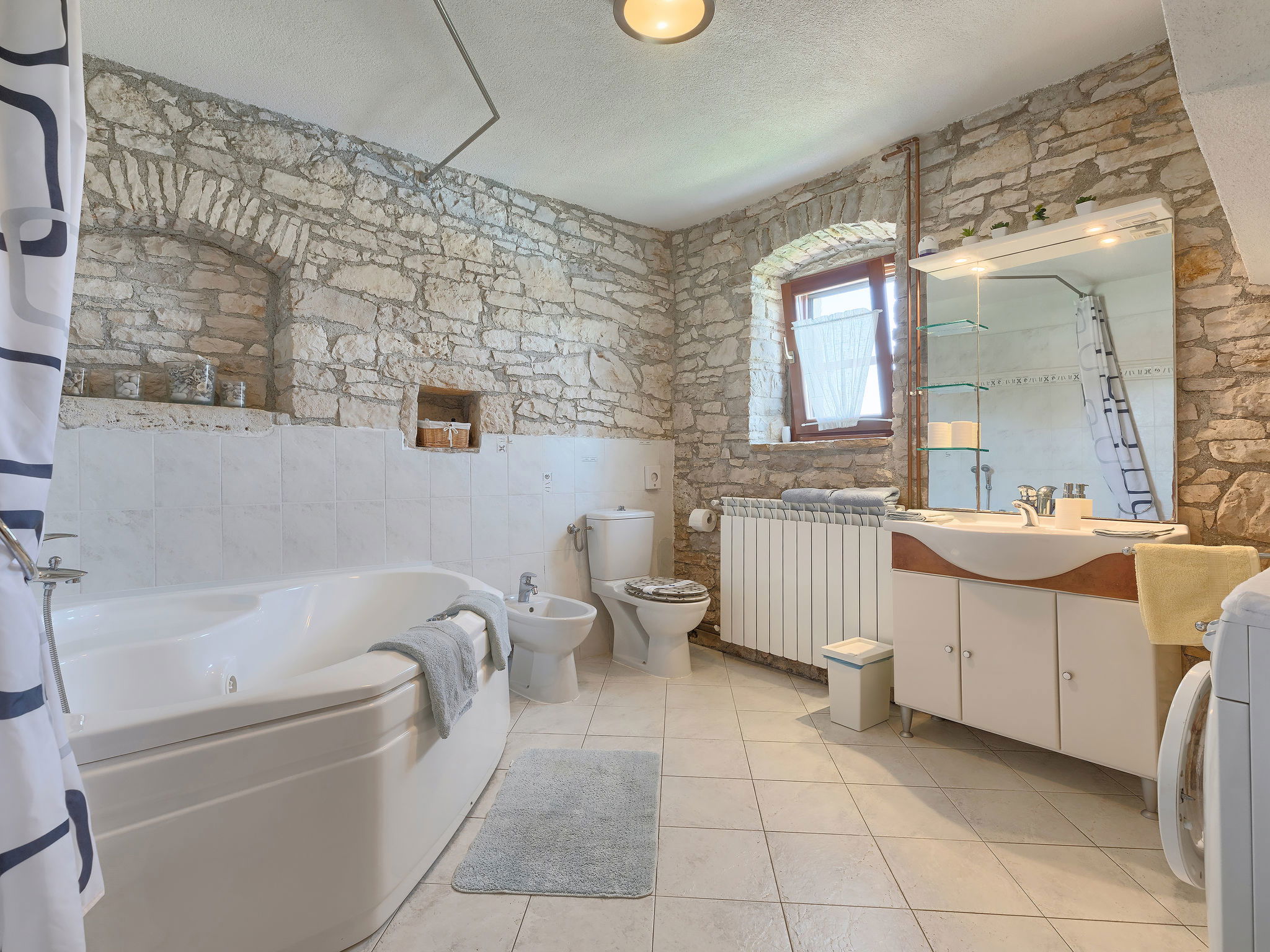 Maison individuelle "Bozac", de 2 étages. Dans le hameau de Festini, à 5 km du centre de Žminj, à 25 km du centre de Rovinj, à 18 km de la mer. A usage privé: terrain 1'500 m2 (clôturé) avec pelouse et arbres, piscine (7 x 3 m, 24 m2, profondeur 155 cm, disponibilité saisonnière: 13.Avr. - 30.Oct.). WC dans l'espace piscine, douche extérieure, badminton, terrasse, meubles de jardin, barbecue (balançoire). Infrastructures de la Maison: accès internet, chauffage central, lave-linge, vélo à disposition (en sus). Place de parking (couvert) sur le terrain. Magasins 1.5 km, restaurant 500 m, arrêt de bus 6.3 km, plage de graviers 18 km.