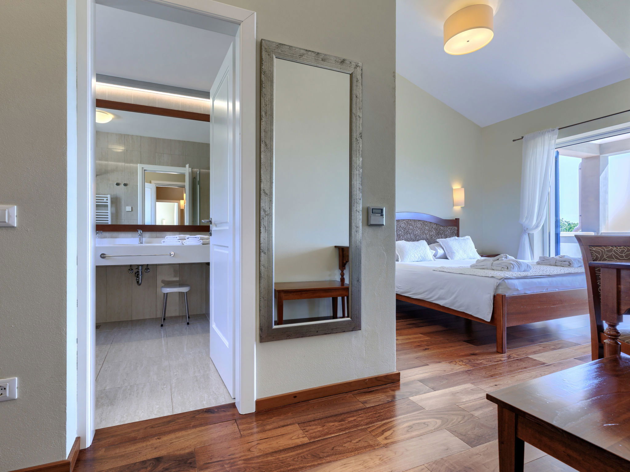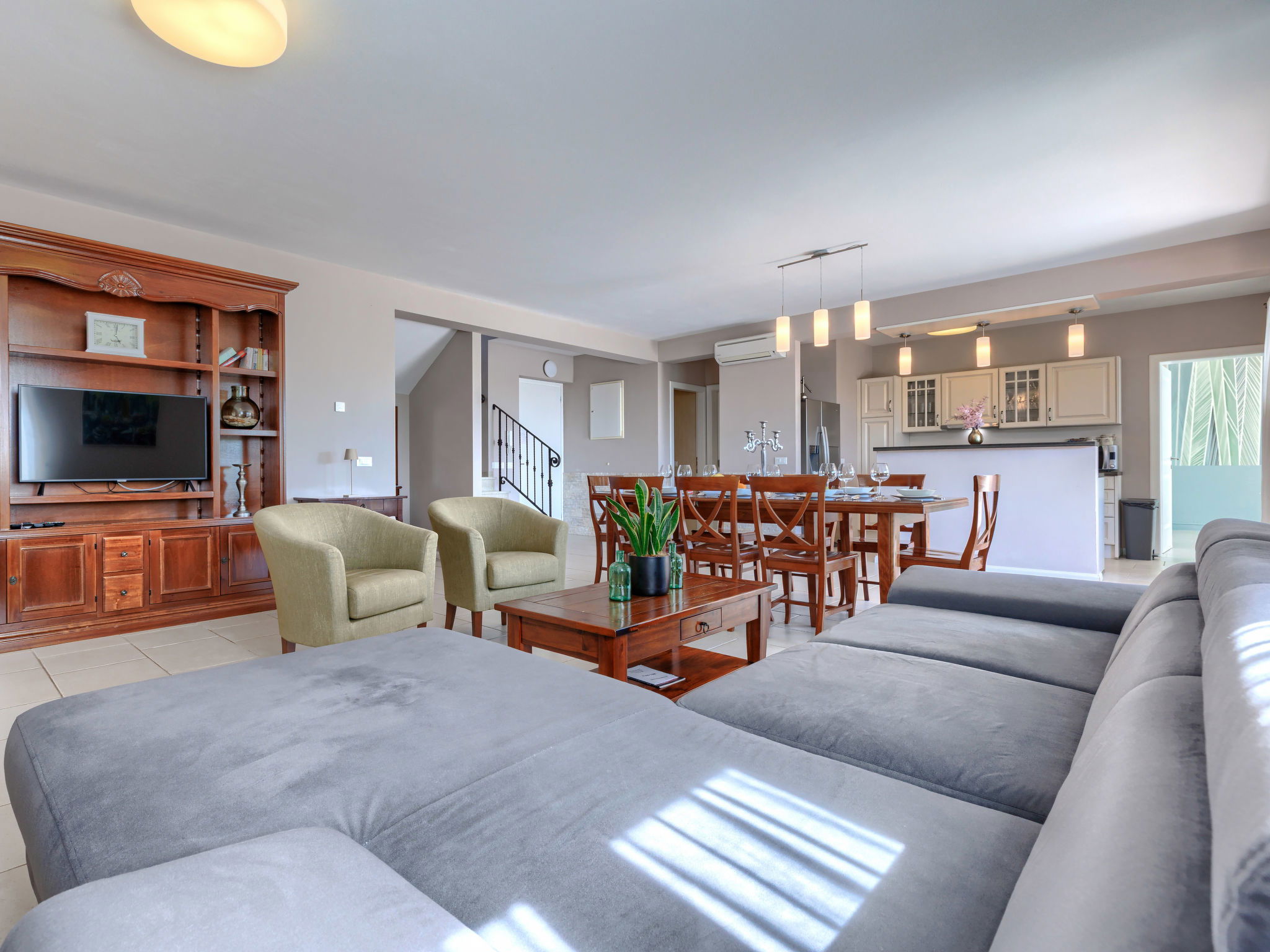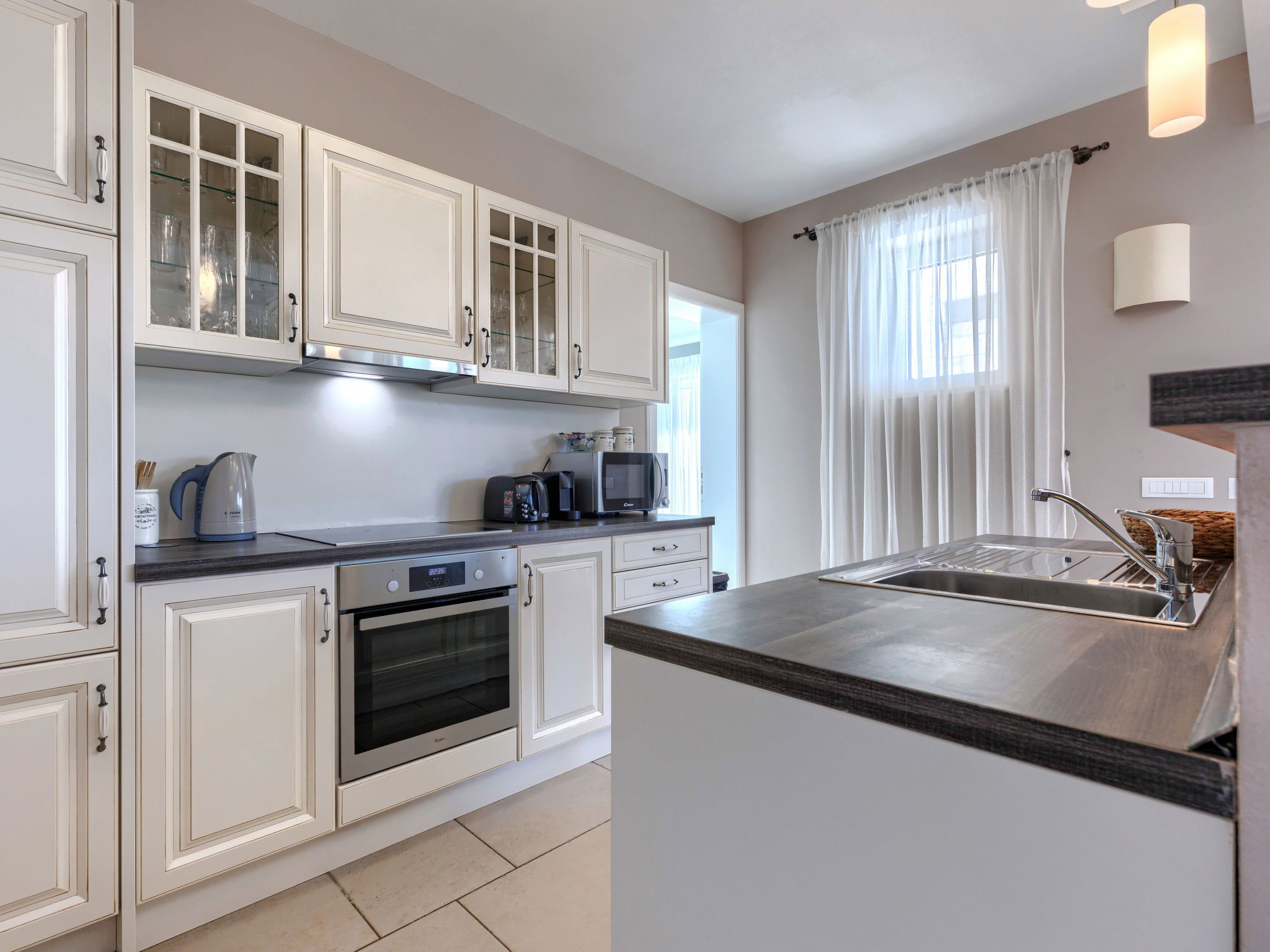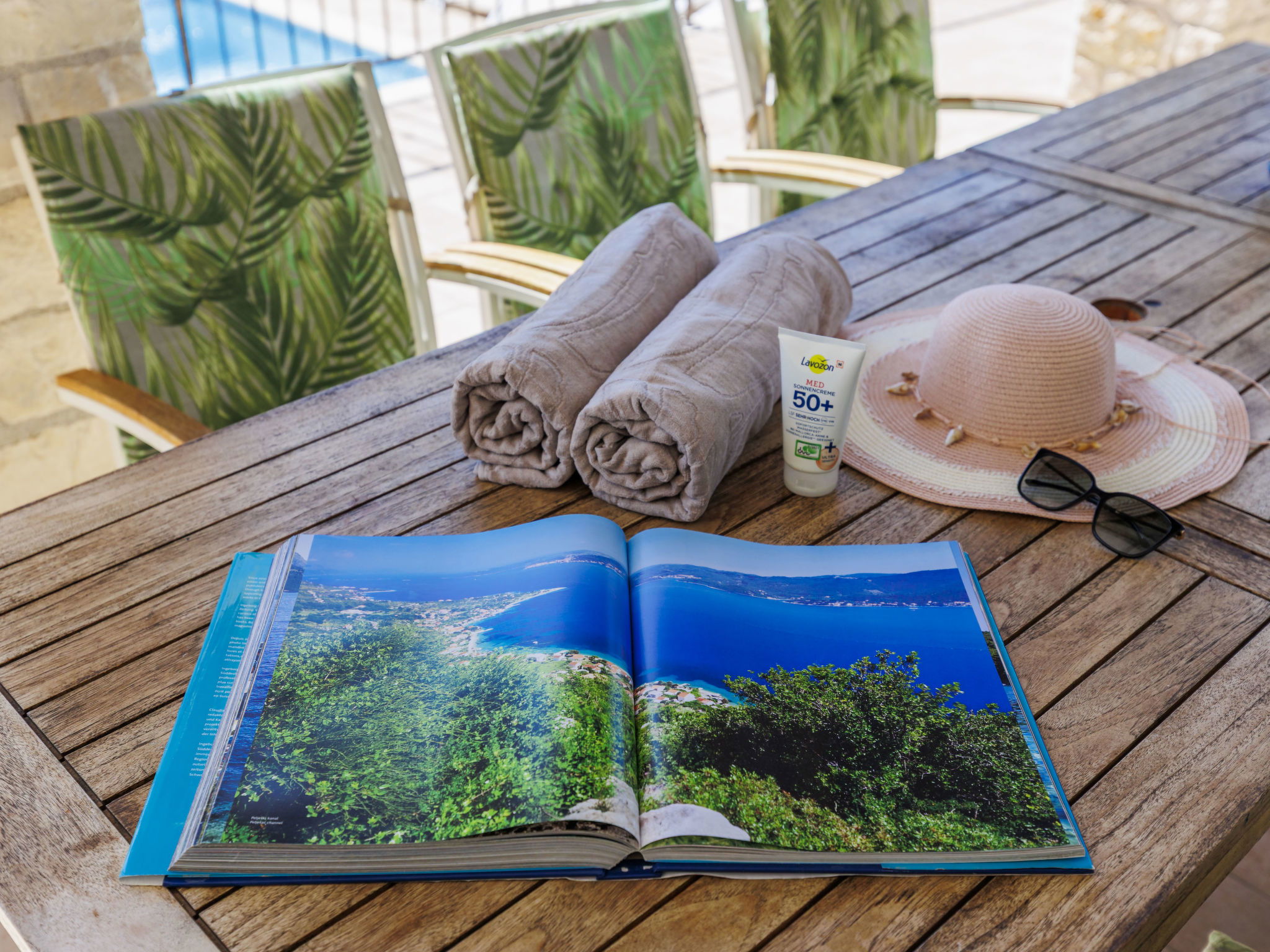 Villa 6 pièces 250 m2 sur 2 niveaux. Aménagement de bon goût et plaisant: séjour/salle à manger avec 1 divan-lit double (180 cm, longueur 200 cm), cheminée (uniquement à titre de décoration), TV (satellite) et air-conditionné. Sortie sur la terrasse. 1 chambre avec 1 grand-lit (200 cm, longueur 210 cm), bain/WC, double vasque, TV (satellite) et air-conditionné. Sortie sur la piscine. Cuisine ouverte (four, lave-vaisselle, 4 plaques vitrocéramiques, bouilloire électrique, micro-ondes, congélateur, cafetière électrique). WC séparé. À l'étage supérieur: 1 chambre avec 1 grand-lit (200 cm, longueur 210 cm), bain/bidet/WC, double vasque, TV (satellite) et air-conditionné. Sortie sur la terrasse. 1 chambre avec 1 grand-lit (200 cm, longueur 210 cm), bain/WC, double vasque, TV (satellite) et air-conditionné. Sortie sur la terrasse. 1 chambre avec 1 grand-lit (200 cm, longueur 210 cm), bain/bidet/WC, double vasque, TV (satellite) et air-conditionné. Sortie sur la terrasse. Chauffage par le sol, chauffage à air chaud. 2 terrasses 3 m2, terrasse 12 m2. Meubles de terrasse, chaises longues. Vue éloignée sur la mer. A disposition: coffre-fort, fer à repasser, moustiquaire, chaise haute pour enfant, lit bébé, sèche-cheveux. Internet (Connexion WIFI, gratuit). Maximum 1 animal/ chien autorisé.