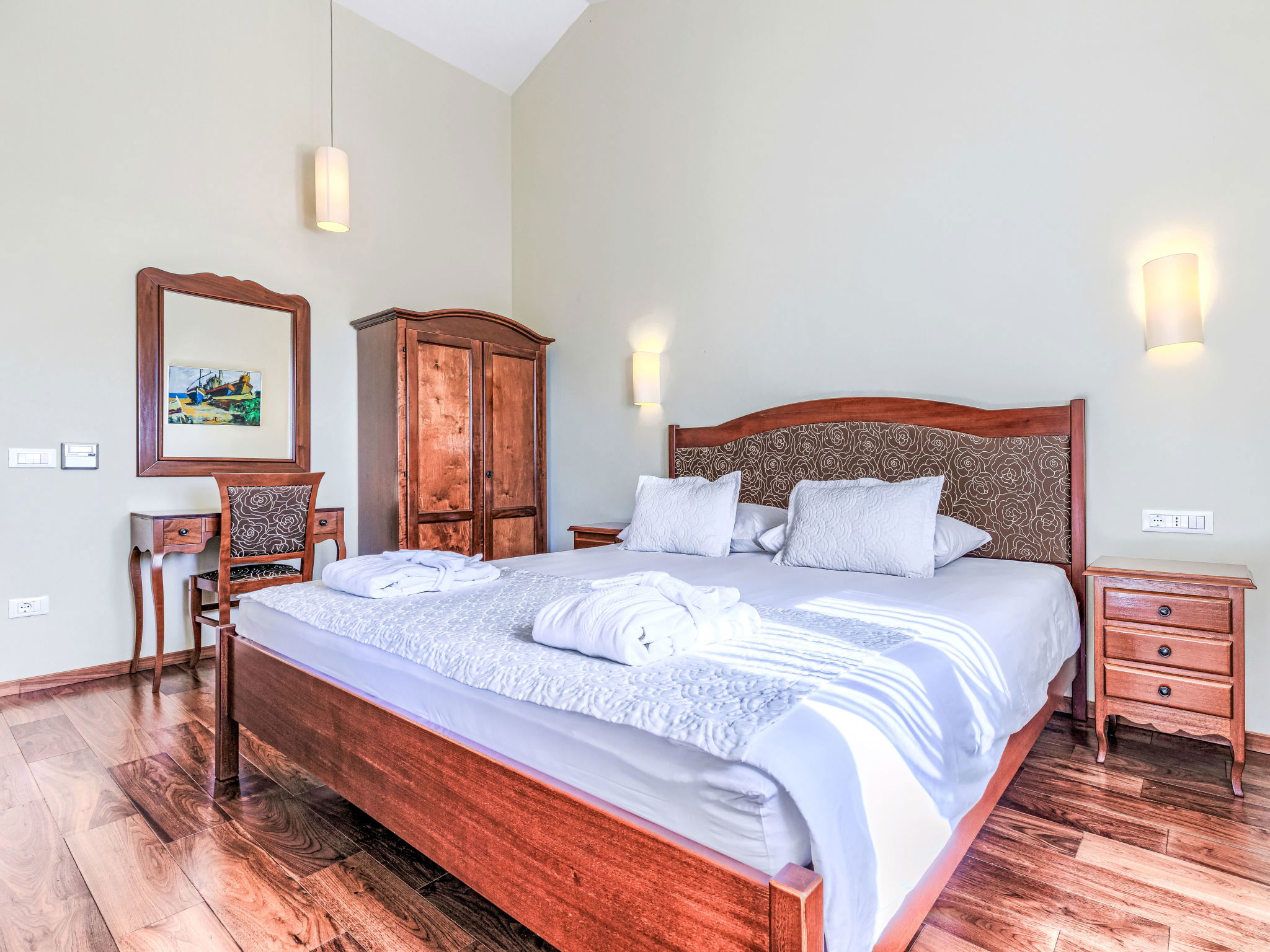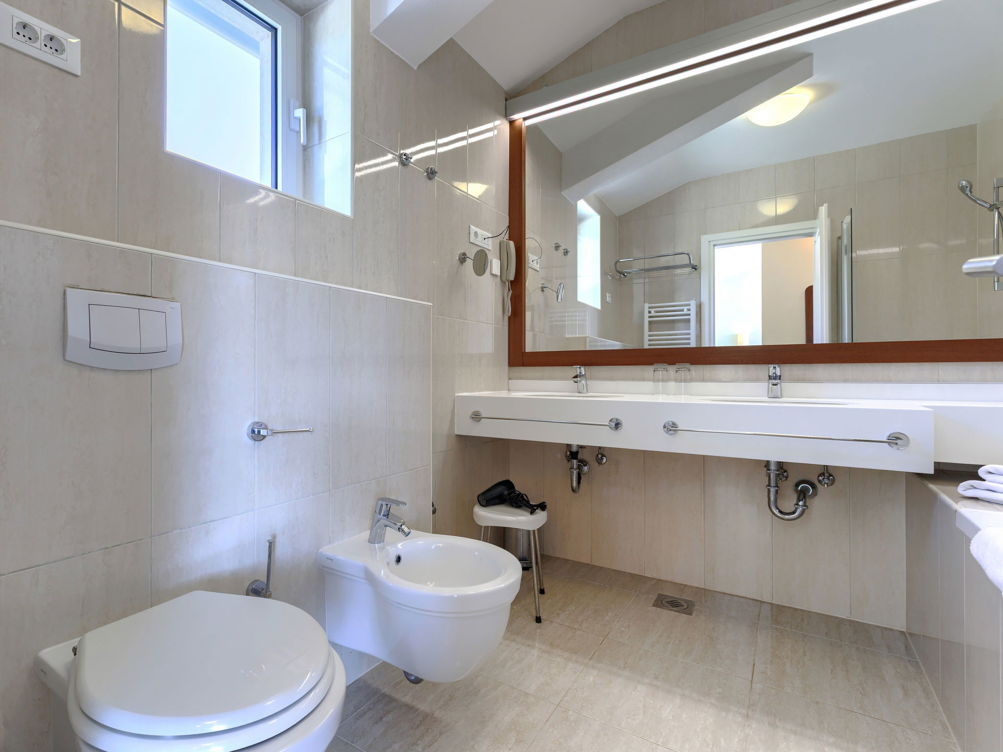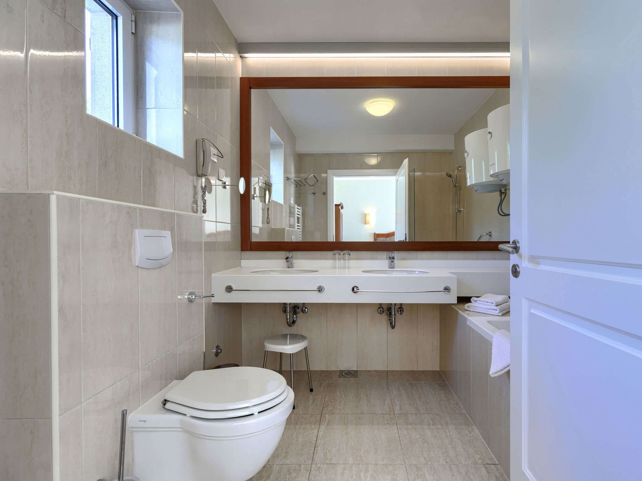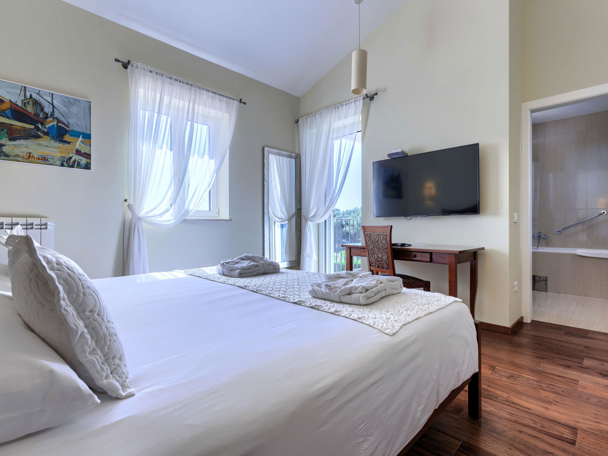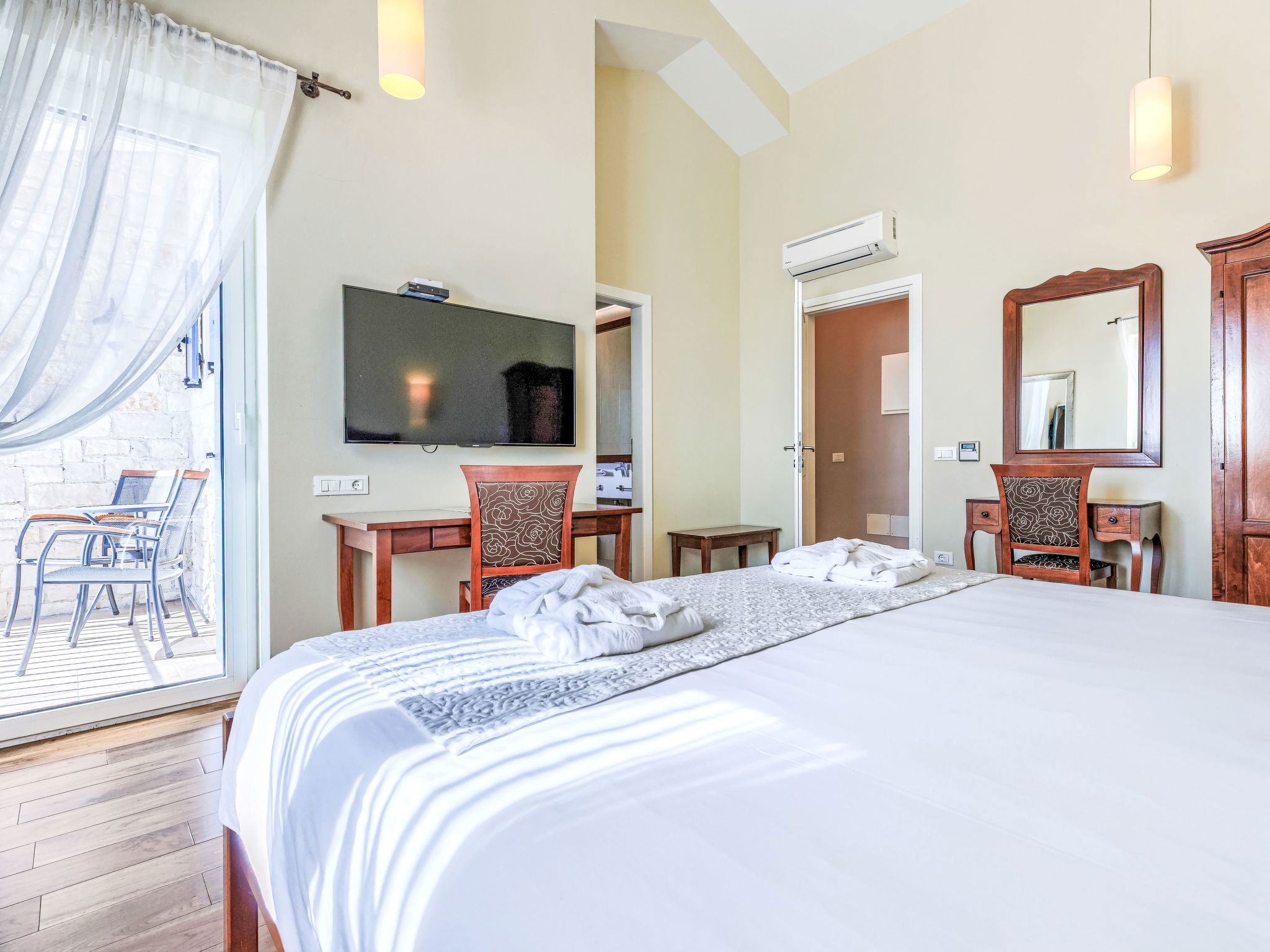 Villa 6 pièces 250 m2 sur 2 niveaux. Aménagement de bon goût et plaisant: séjour/salle à manger avec 1 divan-lit double (180 cm, longueur 200 cm), cheminée (uniquement à titre de décoration), TV (satellite) et air-conditionné. Sortie sur la terrasse. 1 chambre avec 1 grand-lit (200 cm, longueur 210 cm), bain/WC, double vasque, TV (satellite) et air-conditionné. Sortie sur la piscine. Cuisine ouverte (four, lave-vaisselle, 4 plaques vitrocéramiques, bouilloire électrique, micro-ondes, congélateur, cafetière électrique). WC séparé. À l'étage supérieur: 1 chambre avec 1 grand-lit (200 cm, longueur 210 cm), bain/bidet/WC, double vasque, TV (satellite) et air-conditionné. Sortie sur la terrasse. 1 chambre avec 1 grand-lit (200 cm, longueur 210 cm), bain/WC, double vasque, TV (satellite) et air-conditionné. Sortie sur la terrasse. 1 chambre avec 1 grand-lit (200 cm, longueur 210 cm), bain/bidet/WC, double vasque, TV (satellite) et air-conditionné. Sortie sur la terrasse. Chauffage par le sol, chauffage à air chaud. 2 terrasses 3 m2, terrasse 12 m2. Meubles de terrasse, chaises longues. Vue éloignée sur la mer. A disposition: coffre-fort, fer à repasser, moustiquaire, chaise haute pour enfant, lit bébé, sèche-cheveux. Internet (Connexion WIFI, gratuit). Maximum 1 animal/ chien autorisé.