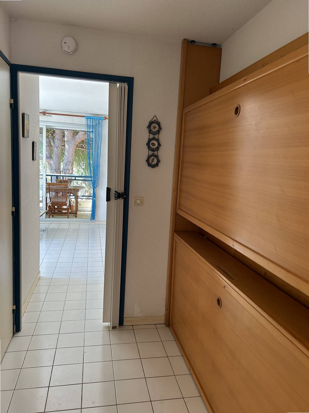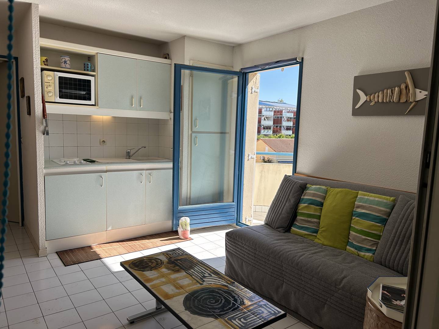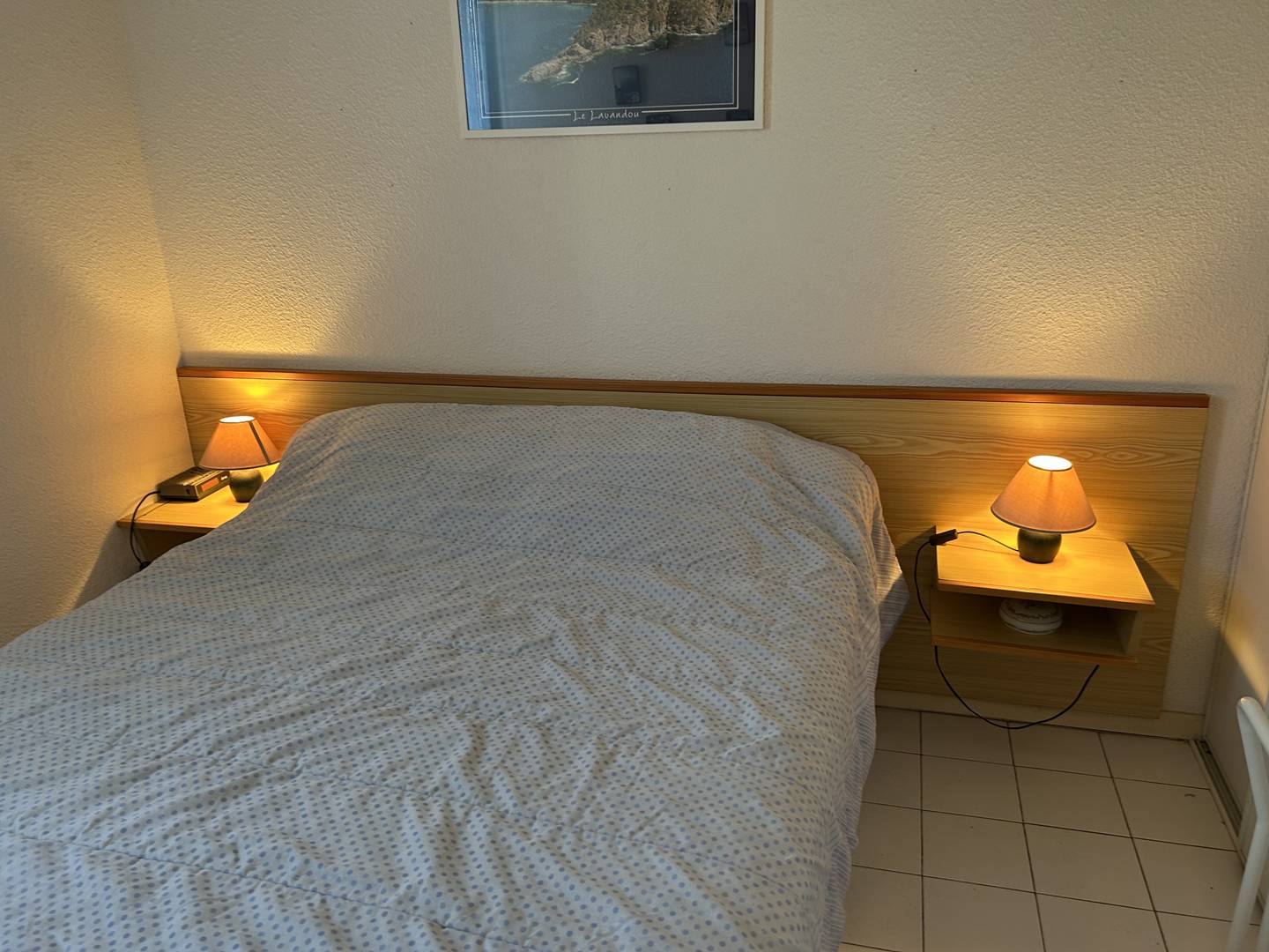L'appartement vous propose une terrasse donnant sur un séjour avec un divan convertible , une kitchenette équipée , un coin nuit avec lits superposés, une chambre avec lit en 140 et une salle d'eau avec et lave-linge .wc indépendant.