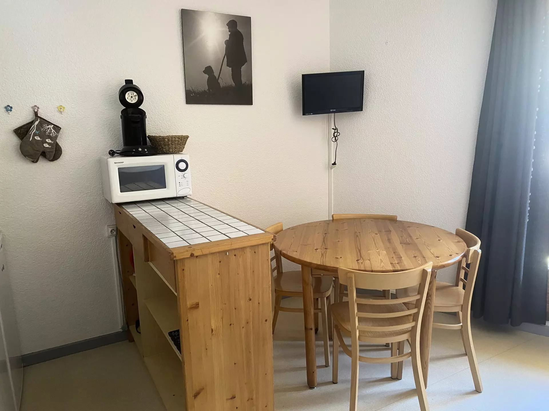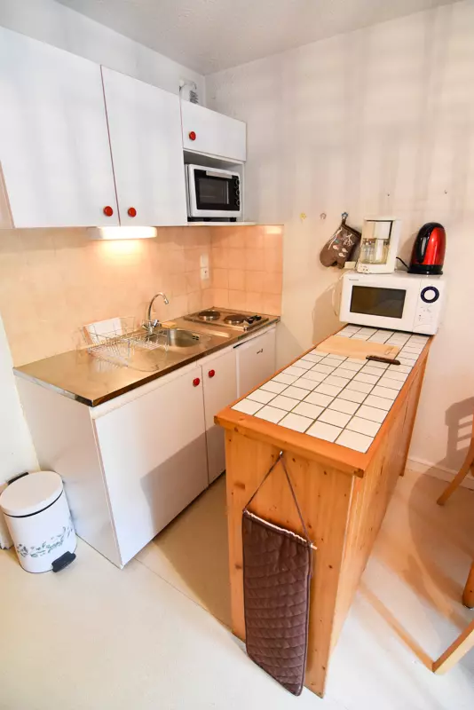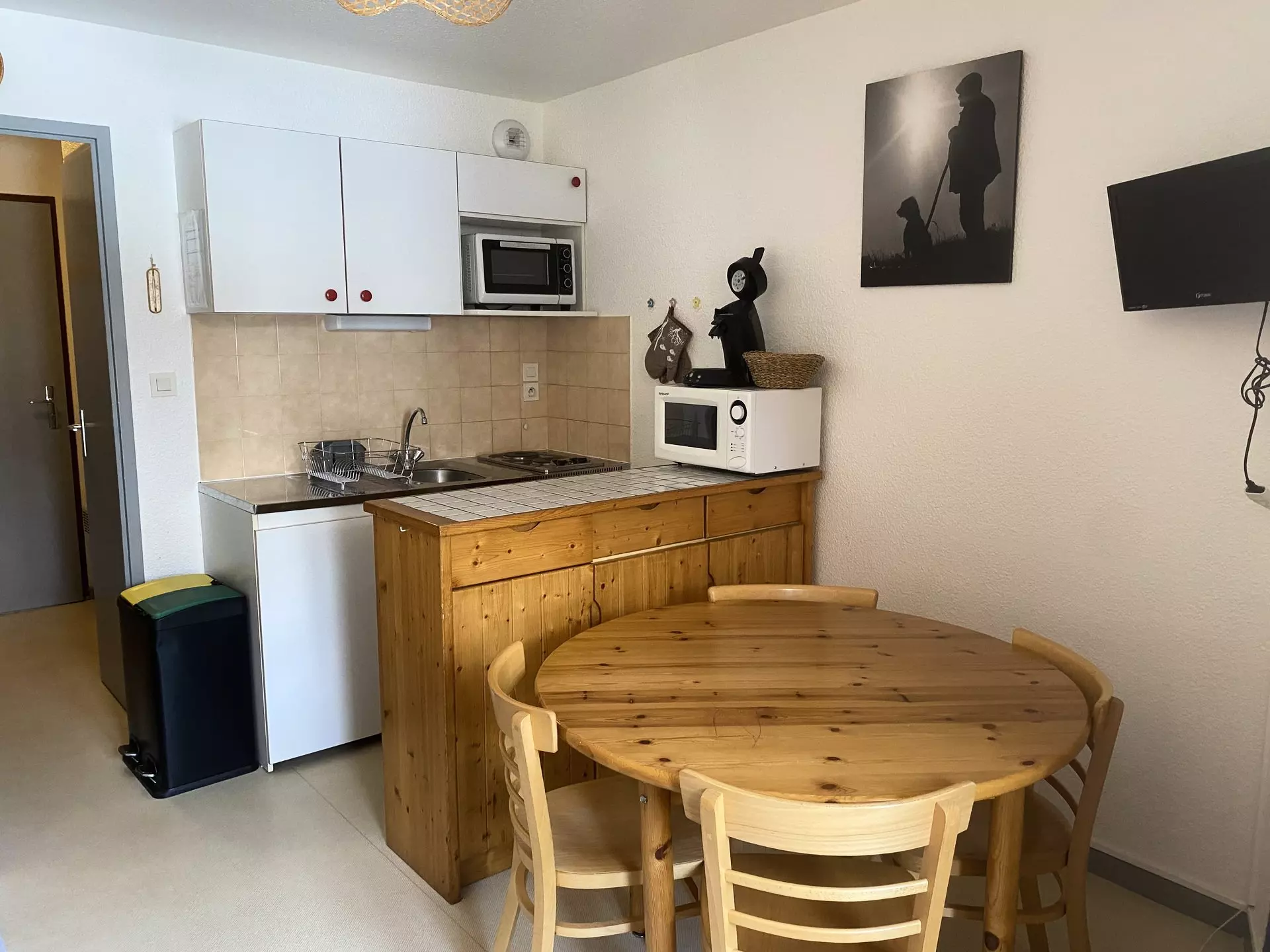 - Coin cuisine : plaque électrique (2 foyers), micro-ondes, réfrigérateur (130L)