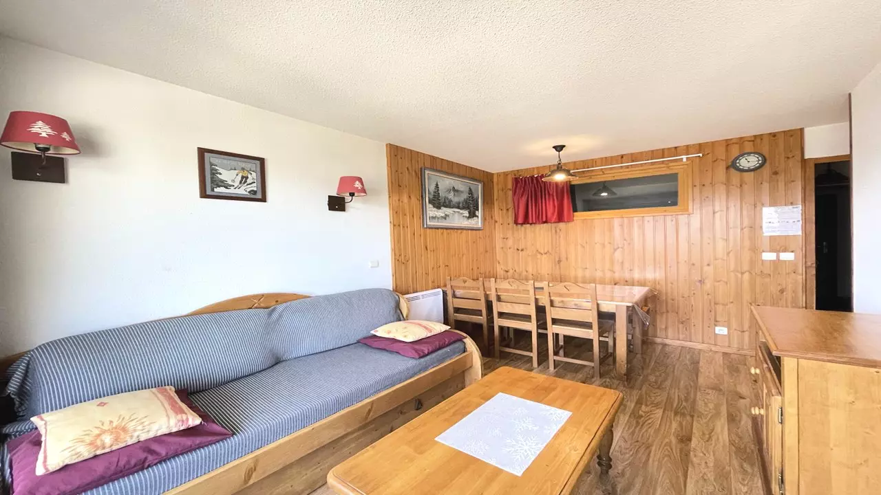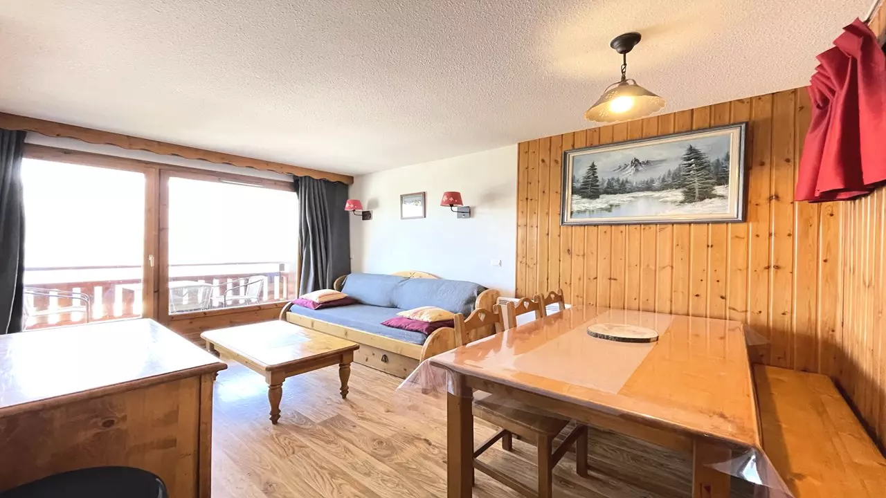 - Séjour avec canapé gigogne (2/80x190 ou 1/160x190), table à manger, tv écran plat et balcon équipé d’une table et deux chaises.
