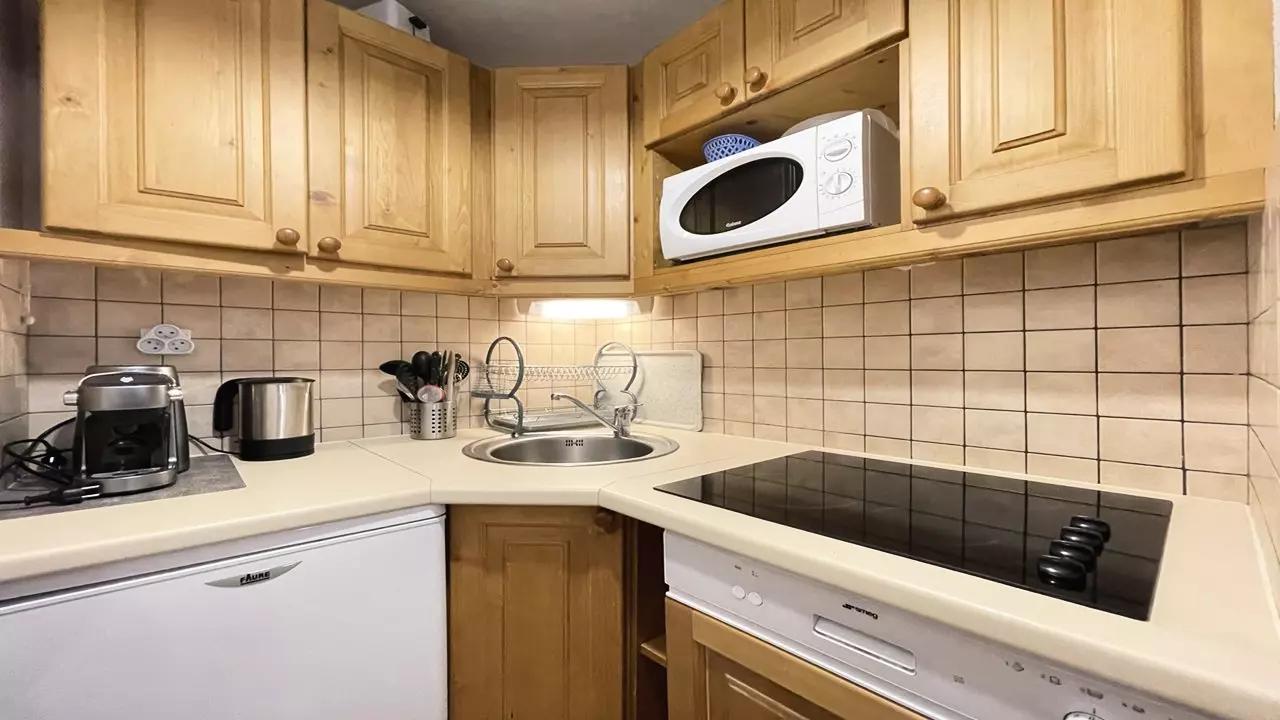 - Cuisine équipée : avec micro-ondes grill, lave-vaisselle, plaque vitrocéramique (4 feux), réfrigérateur, grille-pain, bouilloire, cafetière filtre et cafetière à capsules.