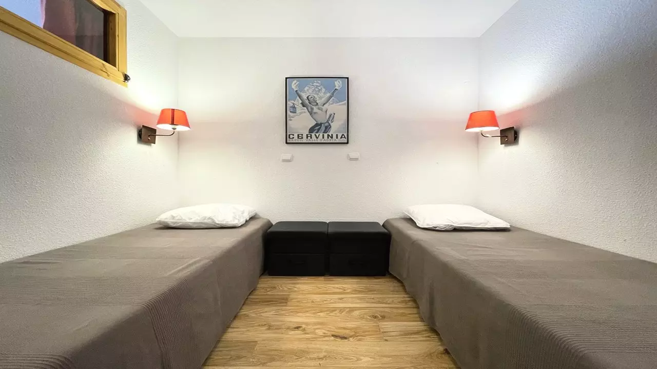 - Couchages : une chambre avec lit double neuf (140x190), une chambre cabine avec deux lits simples (matelas neufs 80x190) et rangements divers. Lits équipés de couettes et oreillers 60x60.