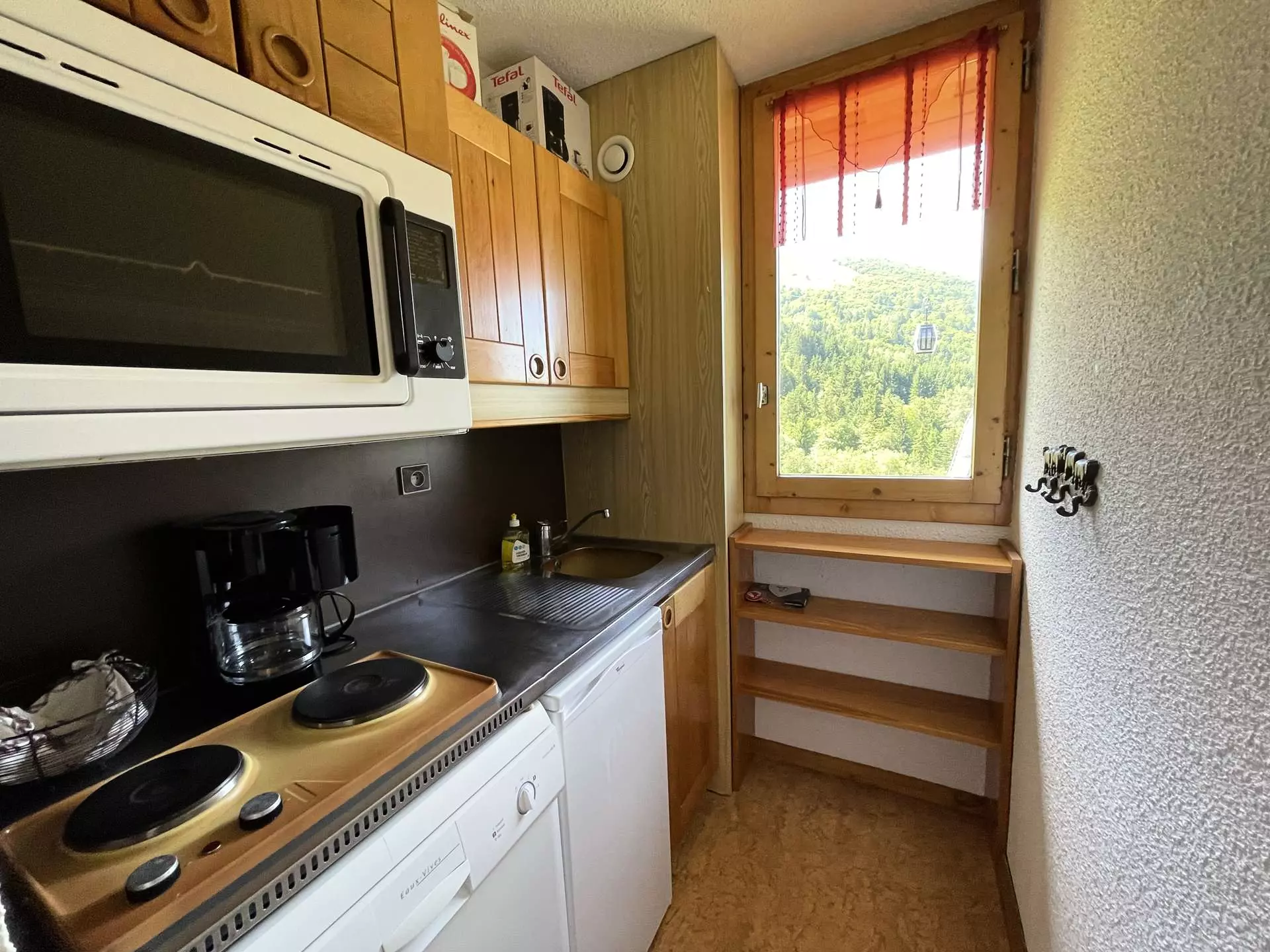 Il est équipé d'une kitchenette, d'une salle de bain, d'un wc séparé et d'un balcon.