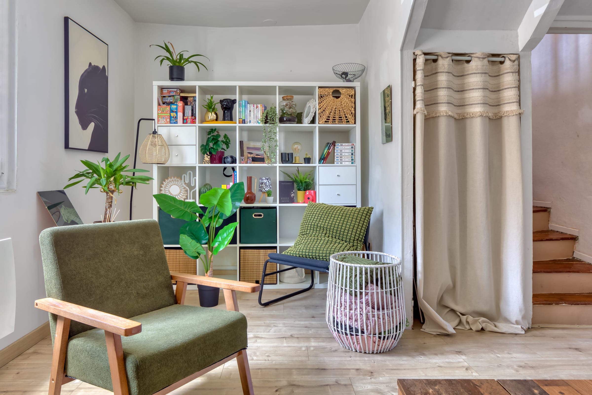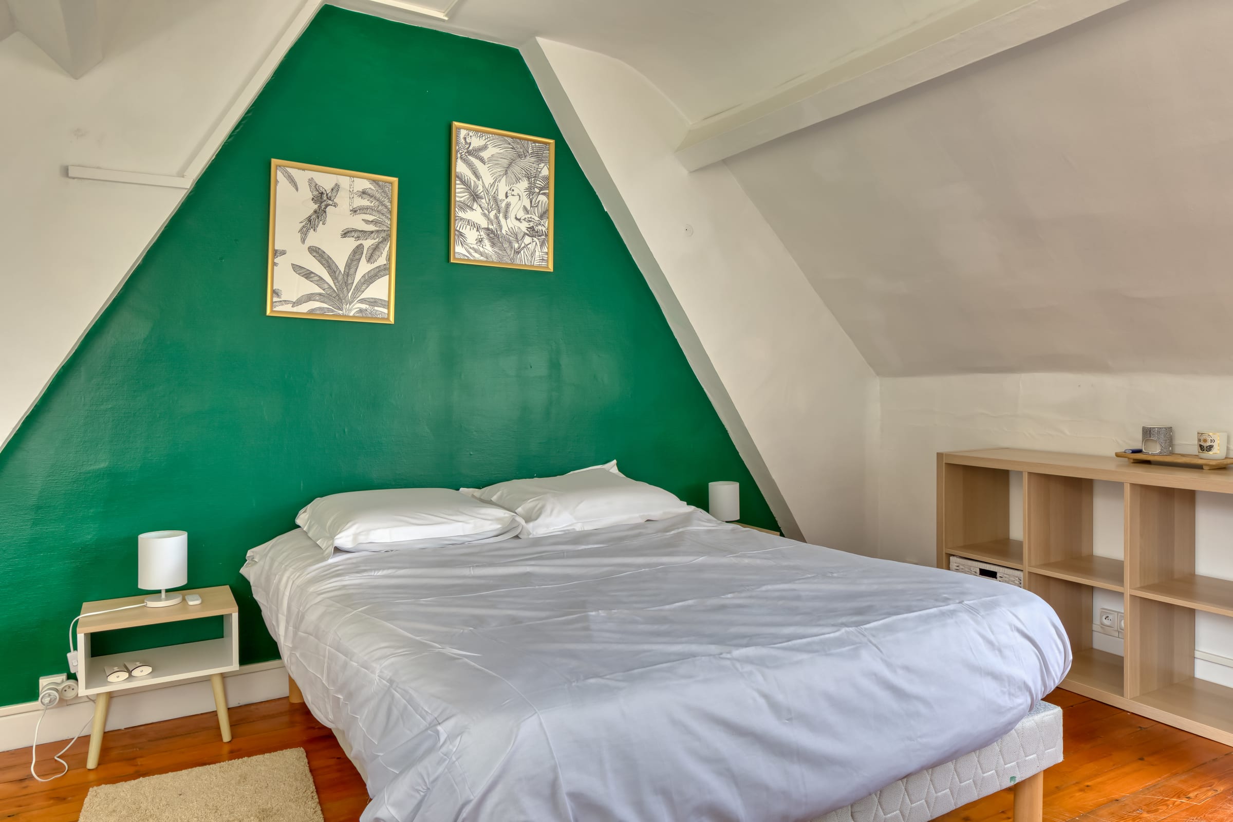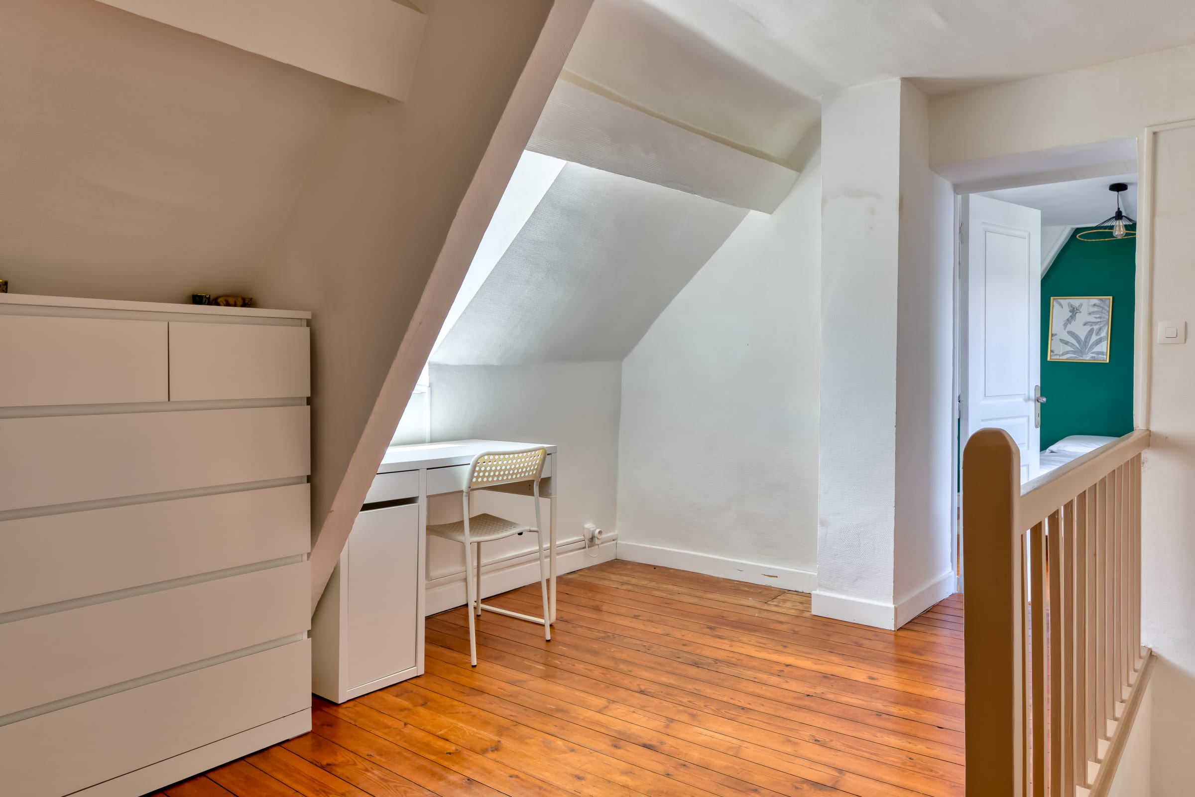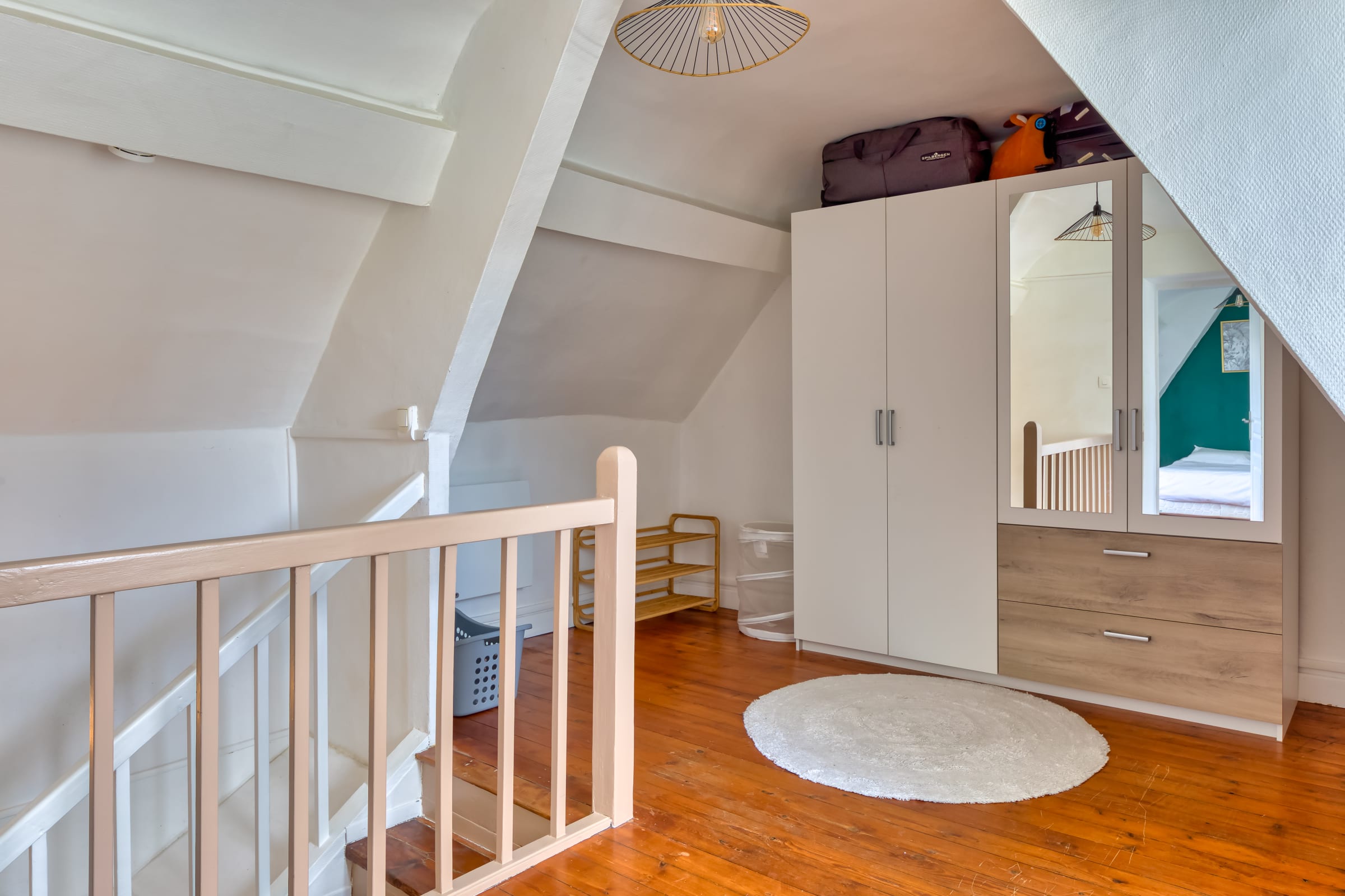 À l’étage, un espace rangement, très pratique pour vos vêtements et un espace bureau idéal pour travailler, derrière, la chambre spacieuse est un véritable havre de paix, dotée d’un lit double 140x180 et d’un espace de rangement fonctionnel. La décoration épurée et douce favorise un sommeil réparateur.