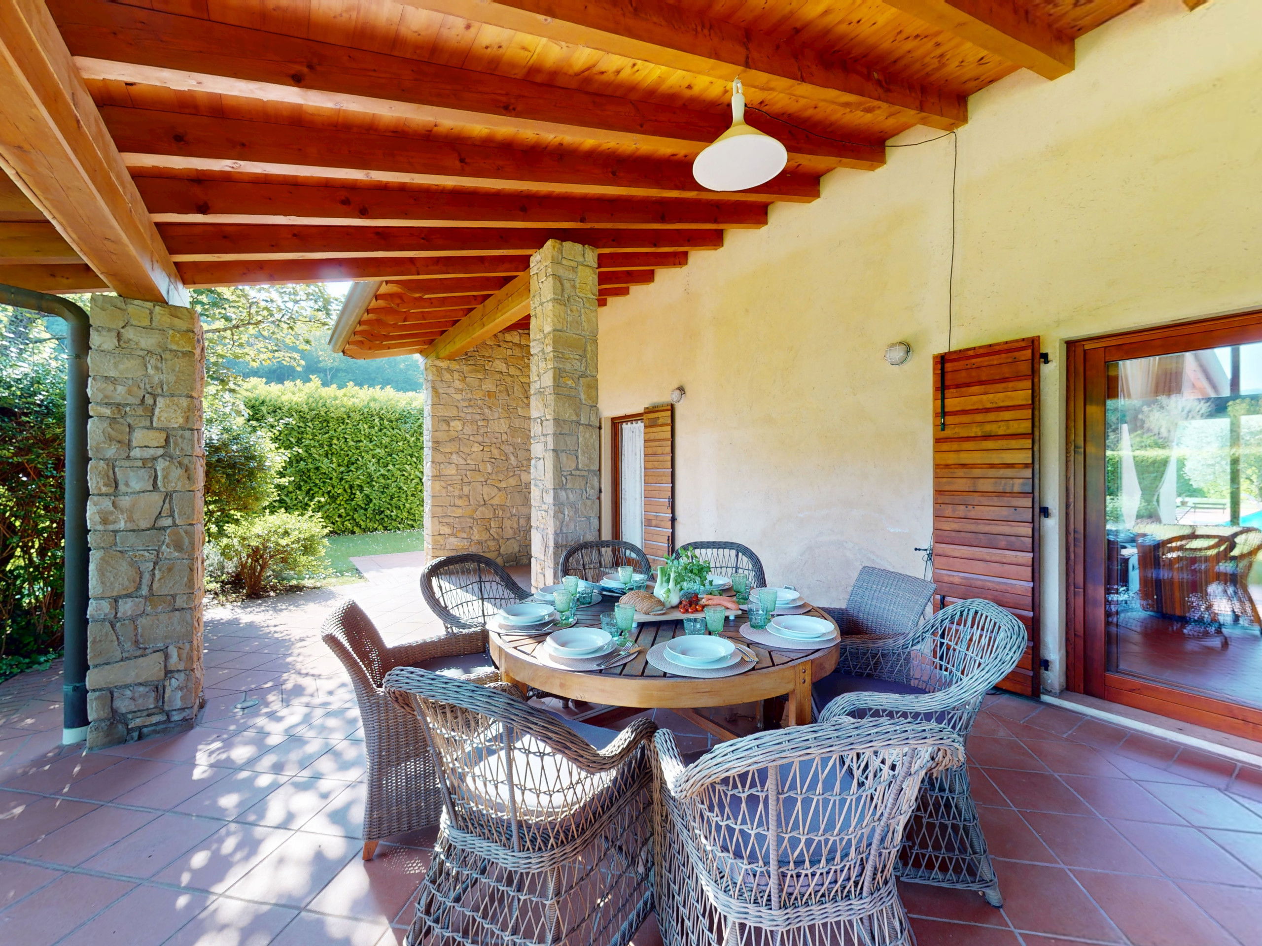 Le grand porche est une invitation à ralentir : petits-déjeuners dans la verdure, apéritifs au coucher du soleil, dîners sous les étoiles. Autour, un parc et une piscine privée pour des moments de pur bien-être.