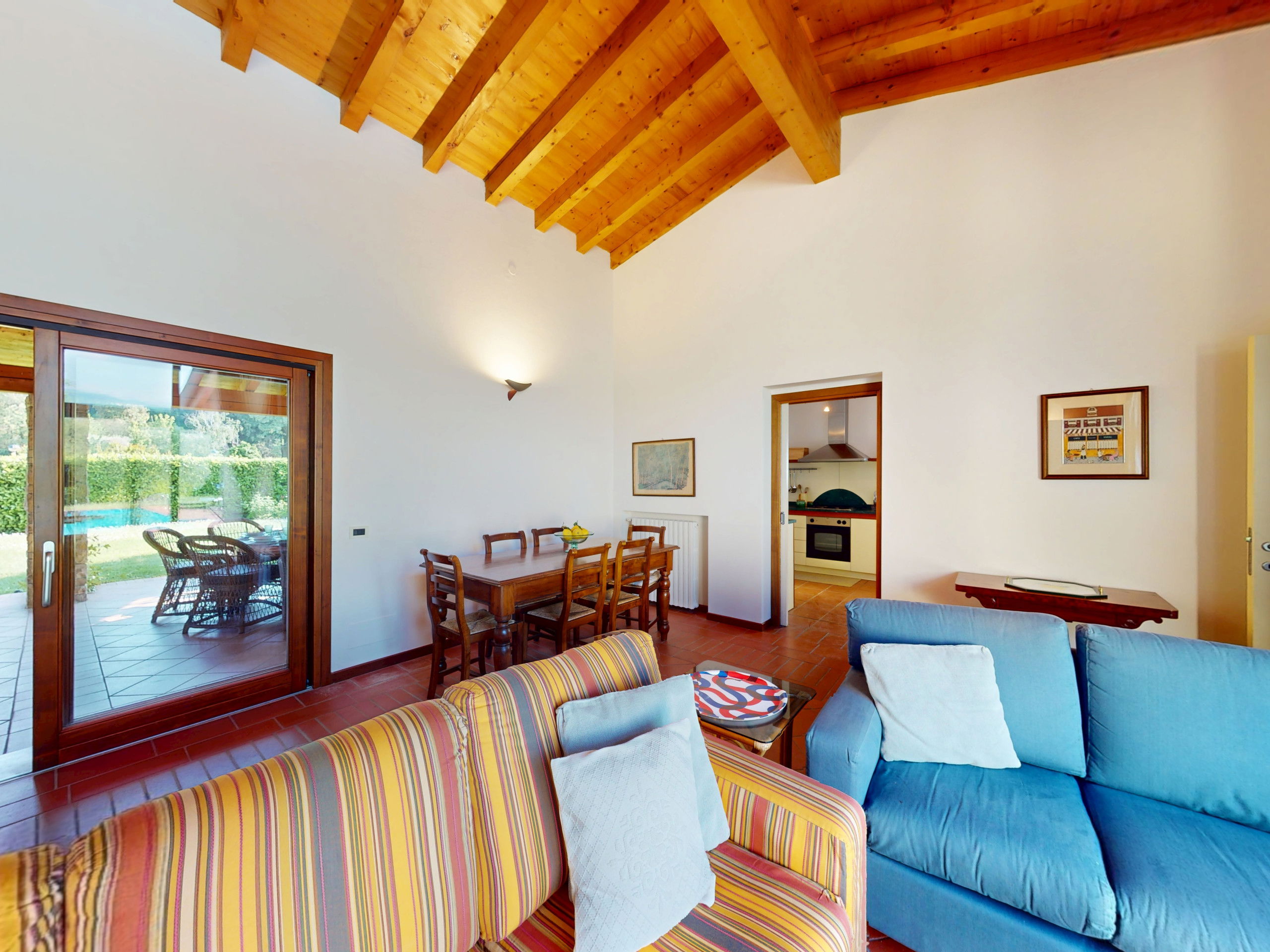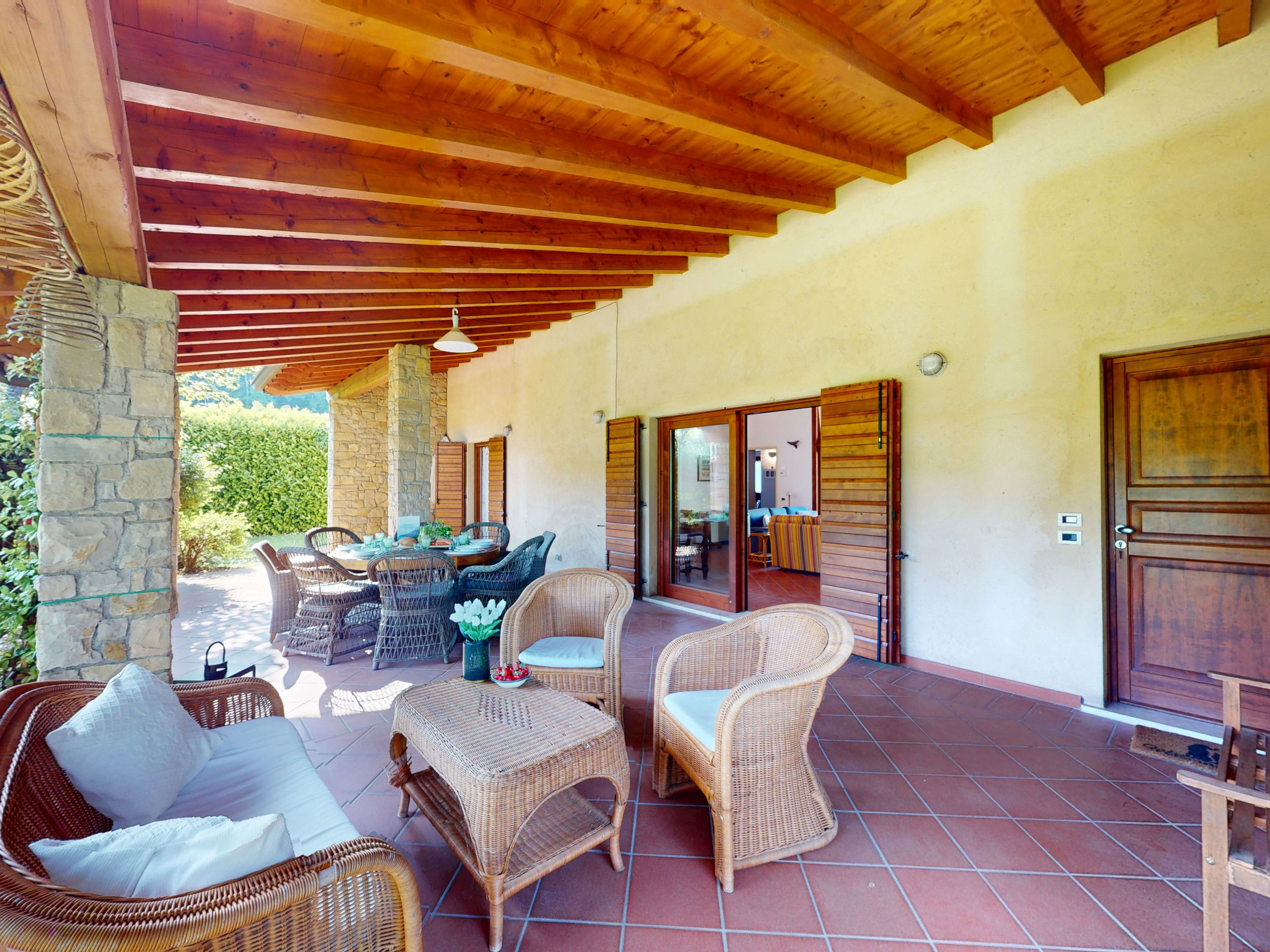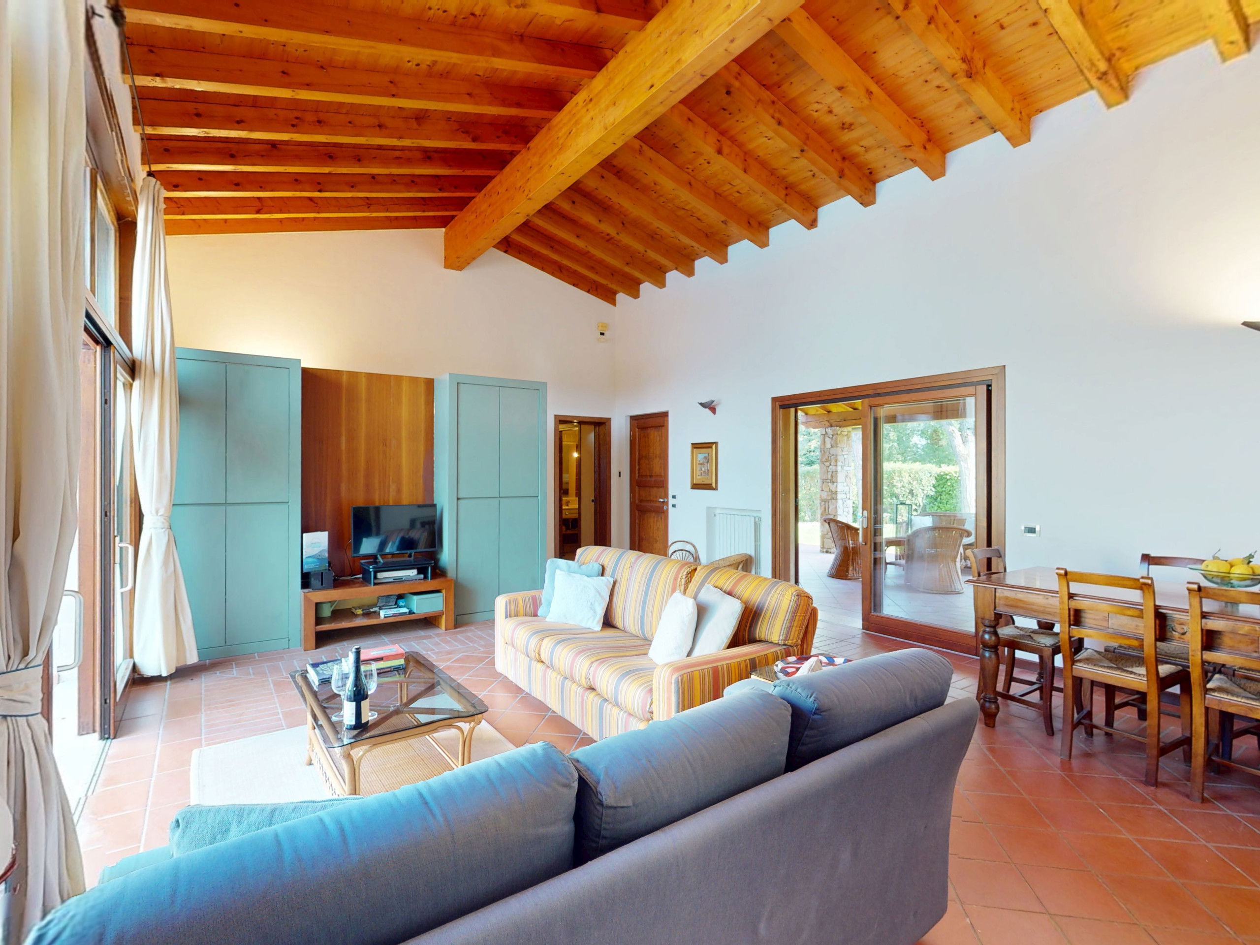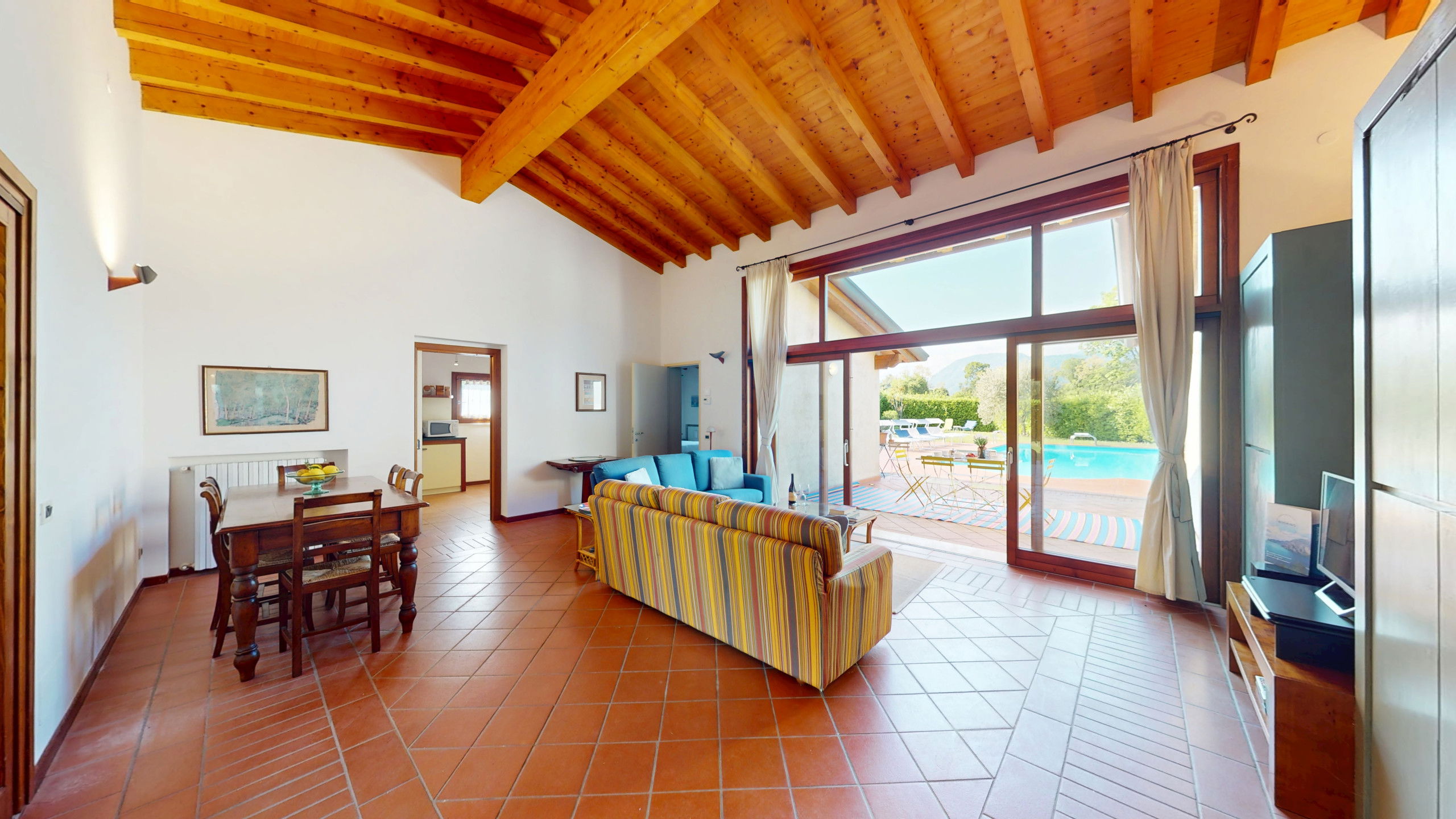 Tout sur un seul niveau, le logement s'ouvre sur des espaces vastes et lumineux, rehaussés par des plafonds hauts avec des poutres en bois apparentes qui racontent la tradition architecturale italienne la plus authentique.