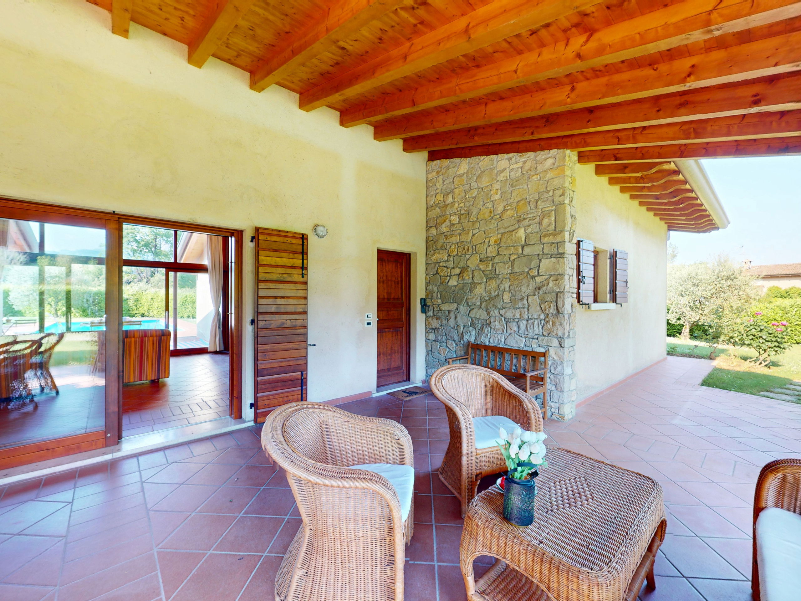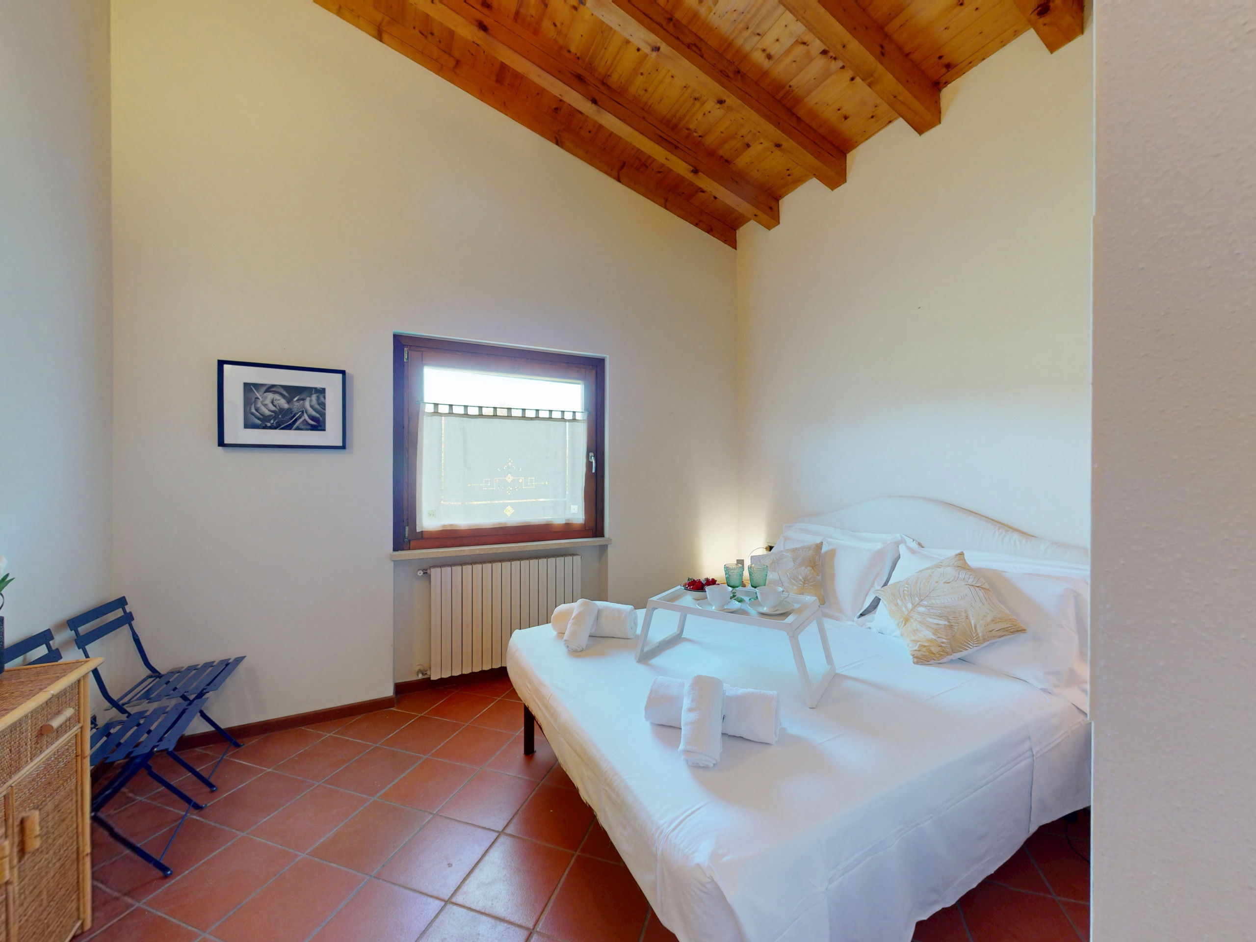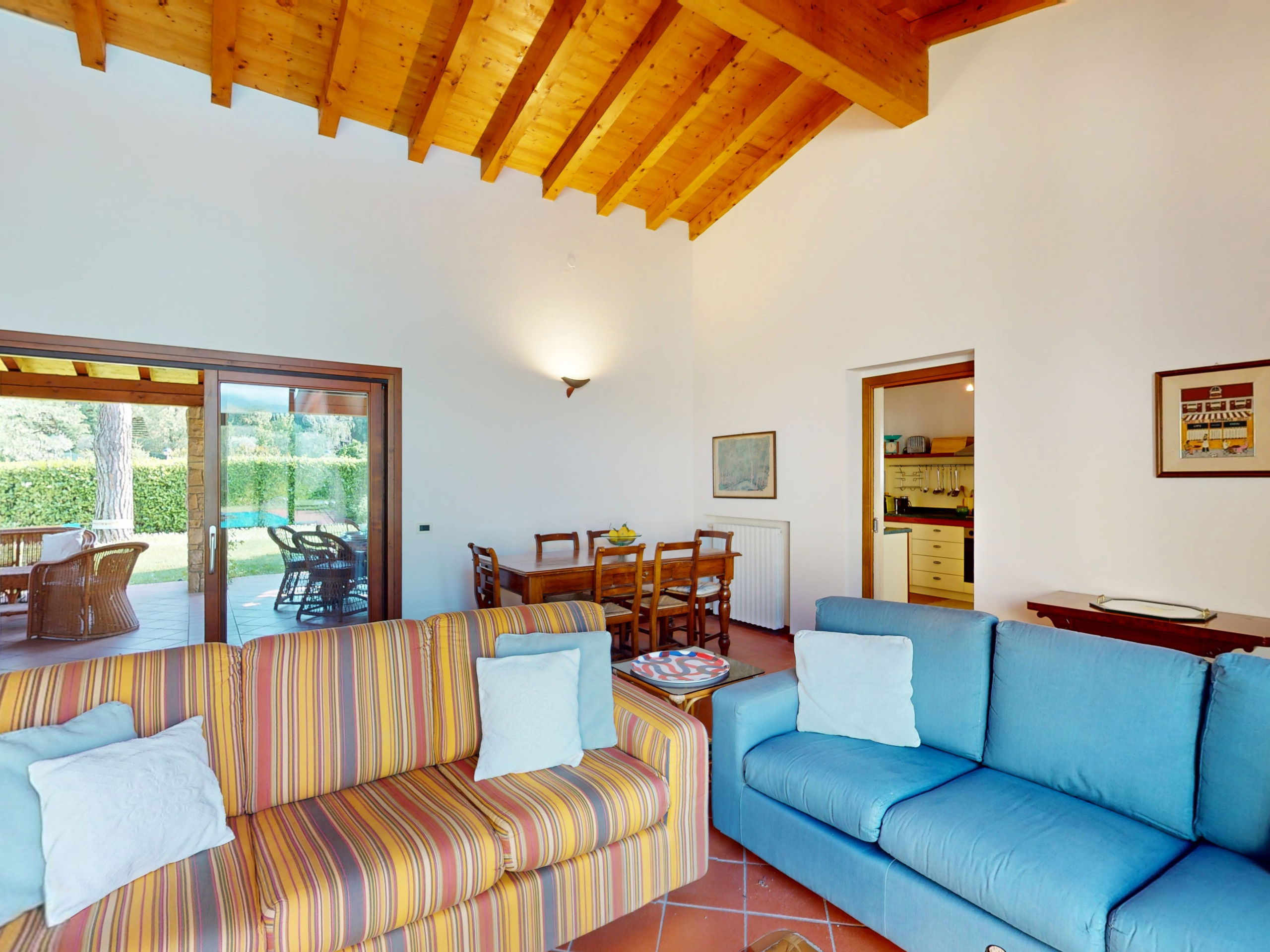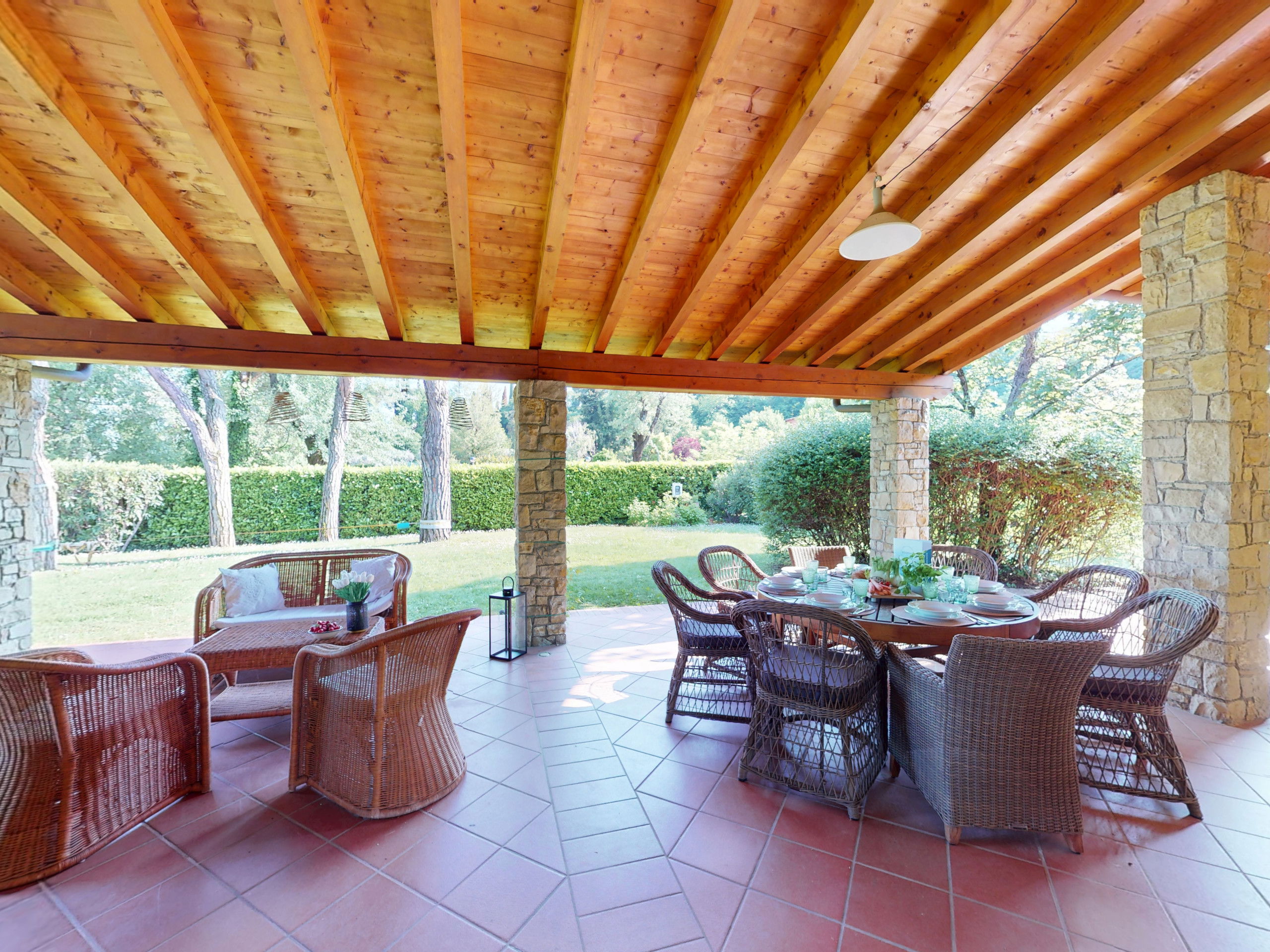 Tout sur un seul niveau, le logement s'ouvre sur des espaces vastes et lumineux, rehaussés par des plafonds hauts avec des poutres en bois apparentes qui racontent la tradition architecturale italienne la plus authentique.
