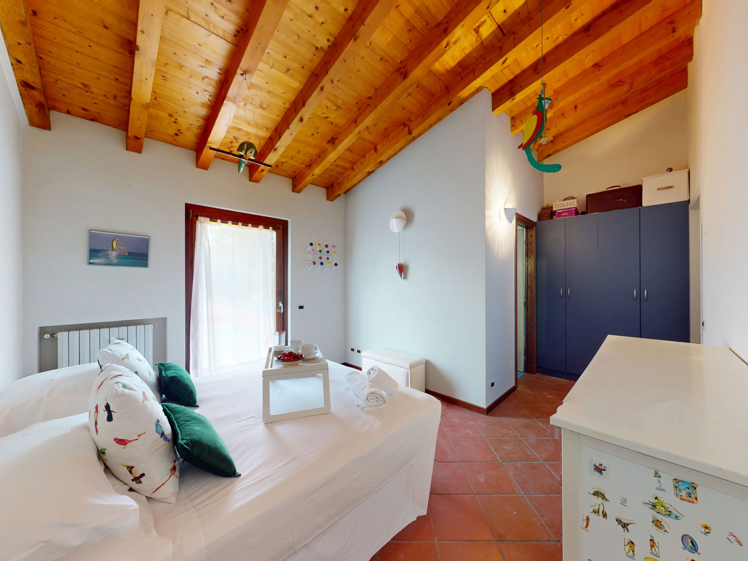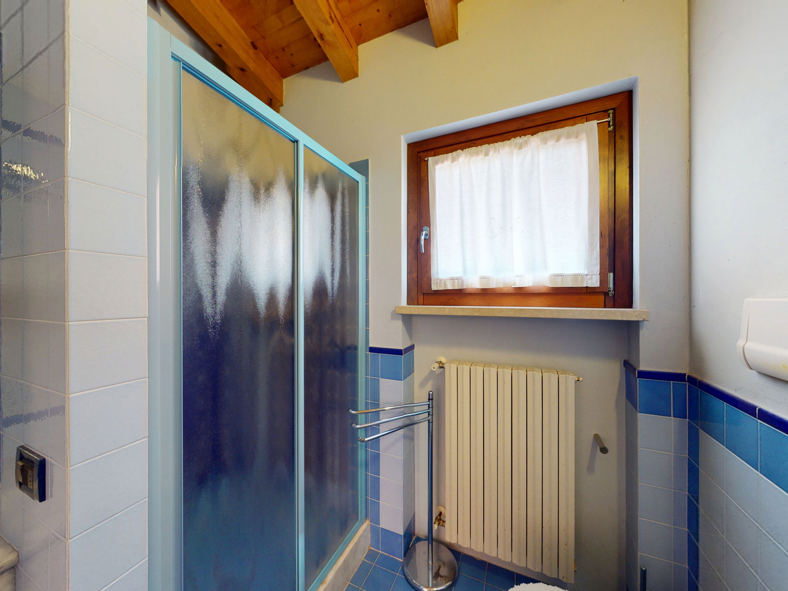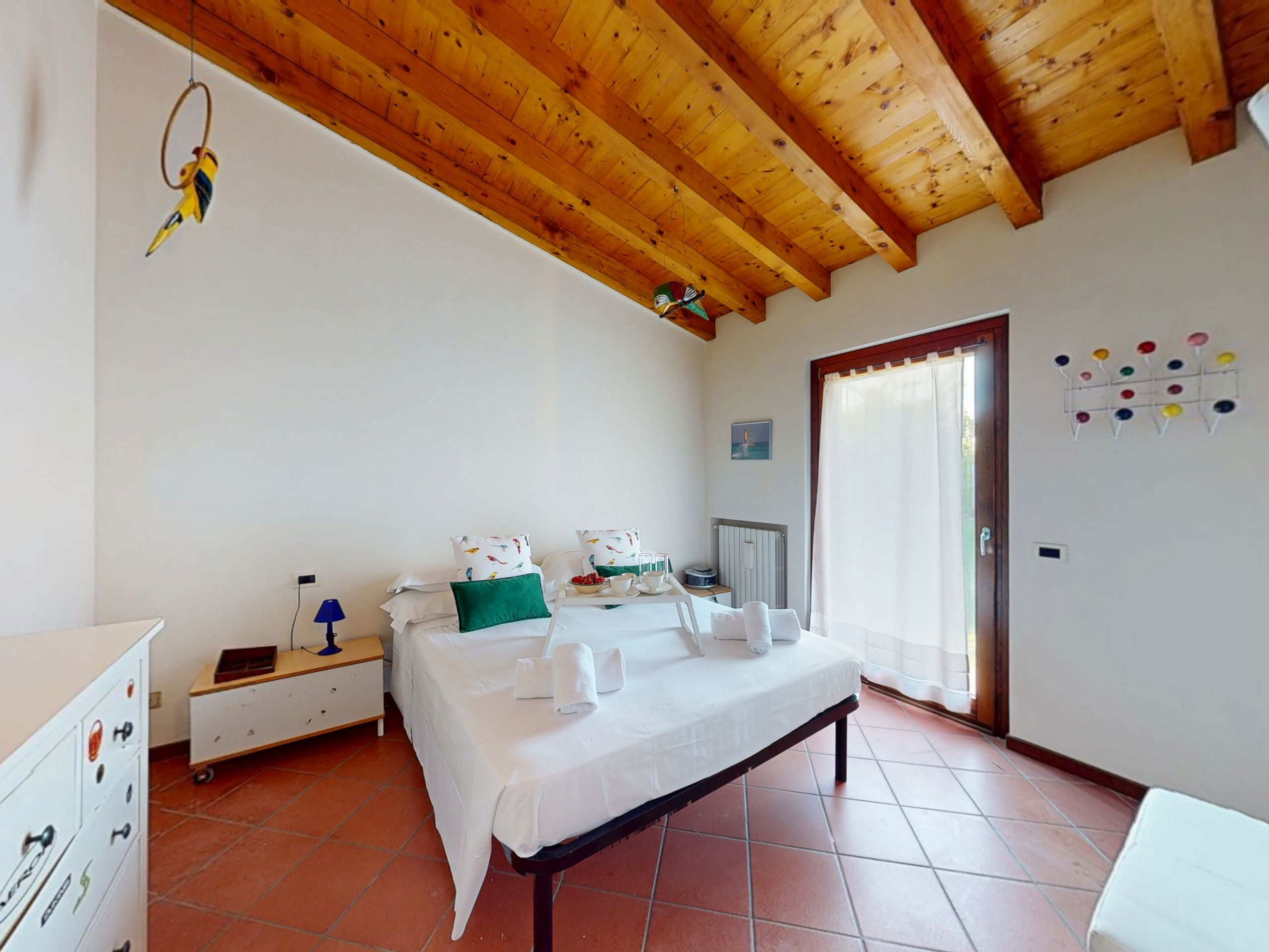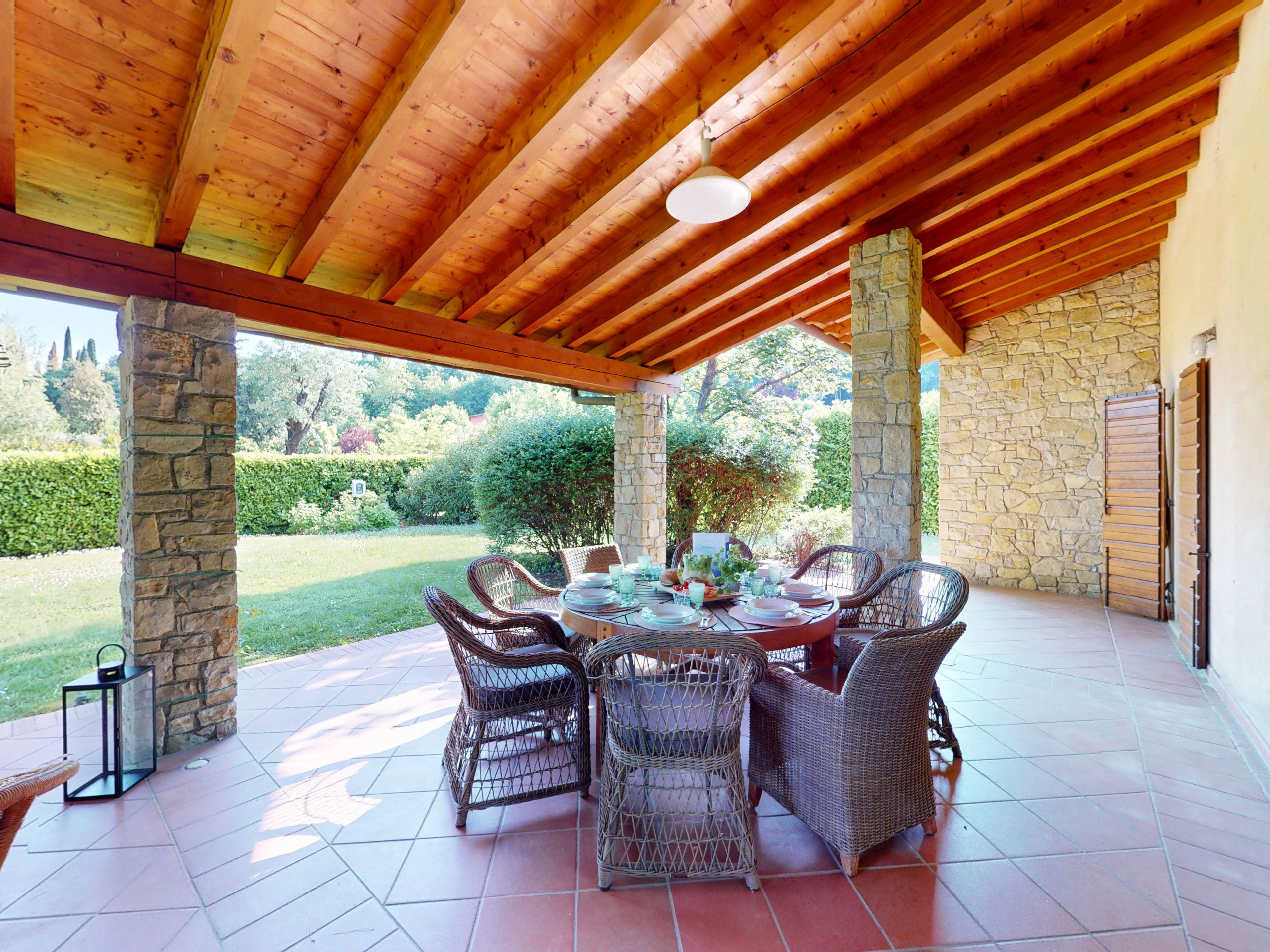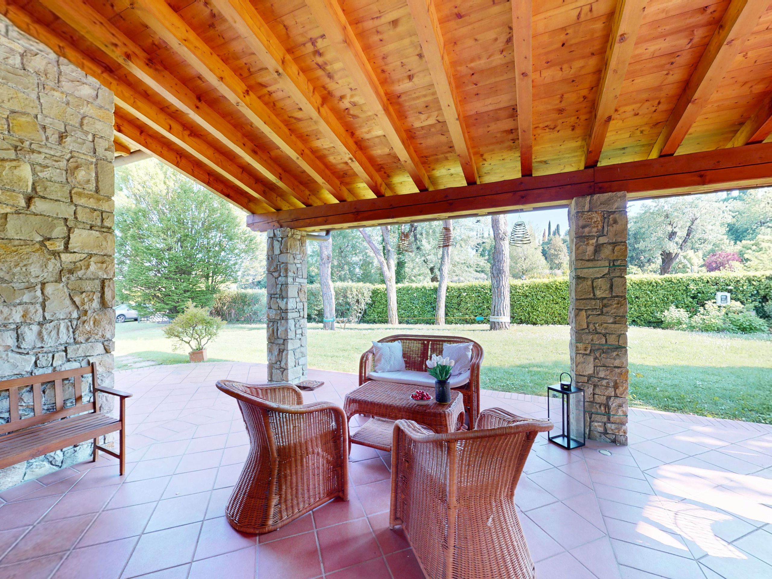 Tout sur un seul niveau, le logement s'ouvre sur des espaces vastes et lumineux, rehaussés par des plafonds hauts avec des poutres en bois apparentes qui racontent la tradition architecturale italienne la plus authentique.