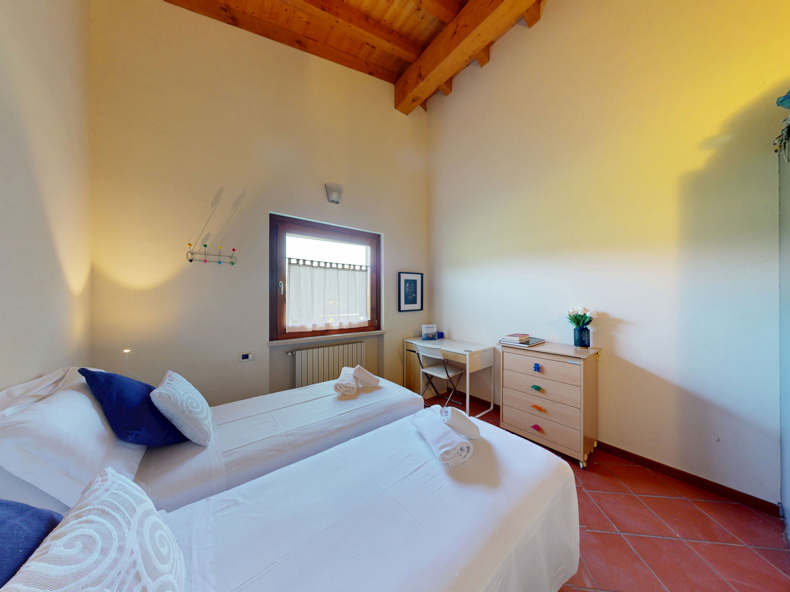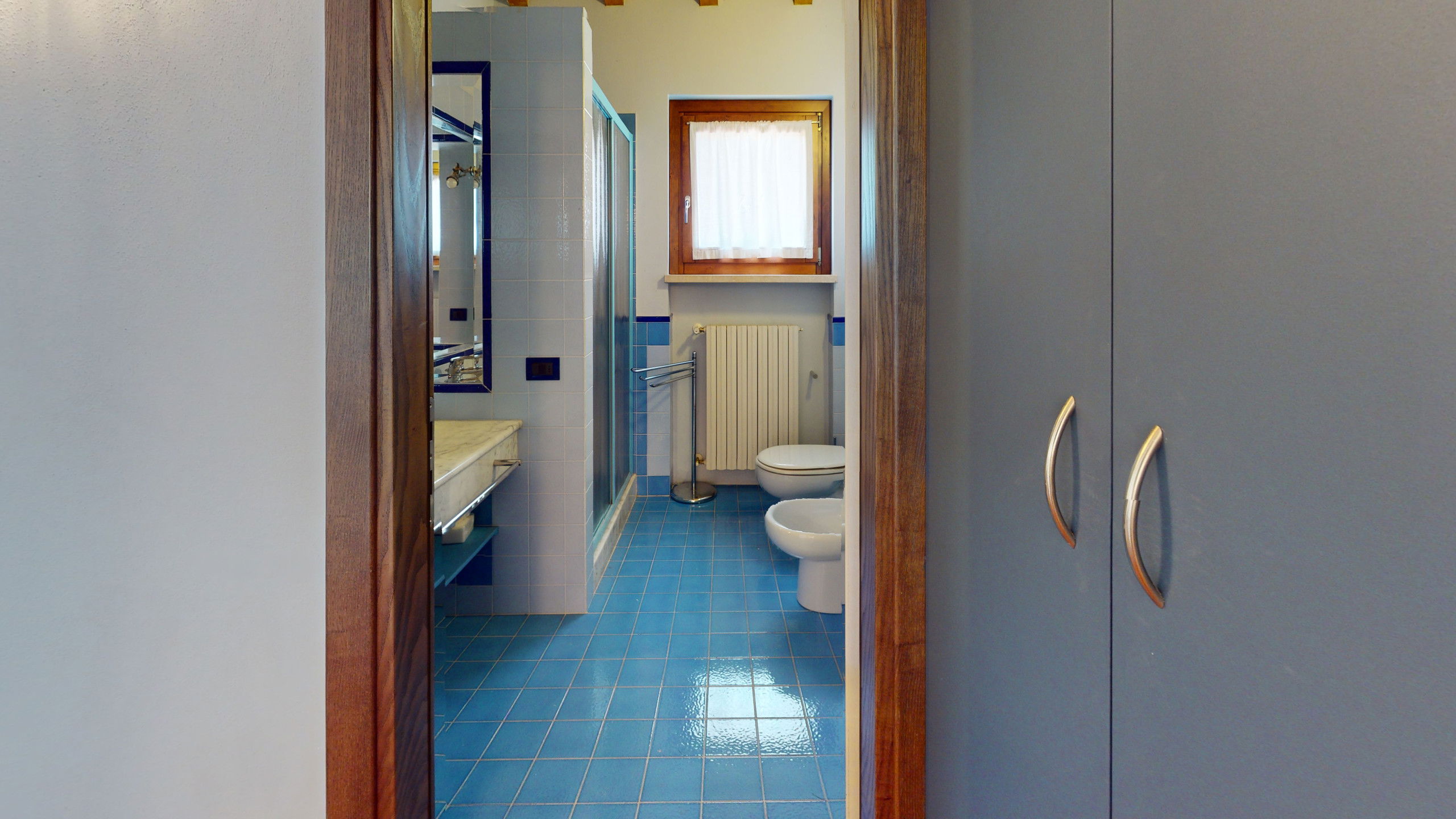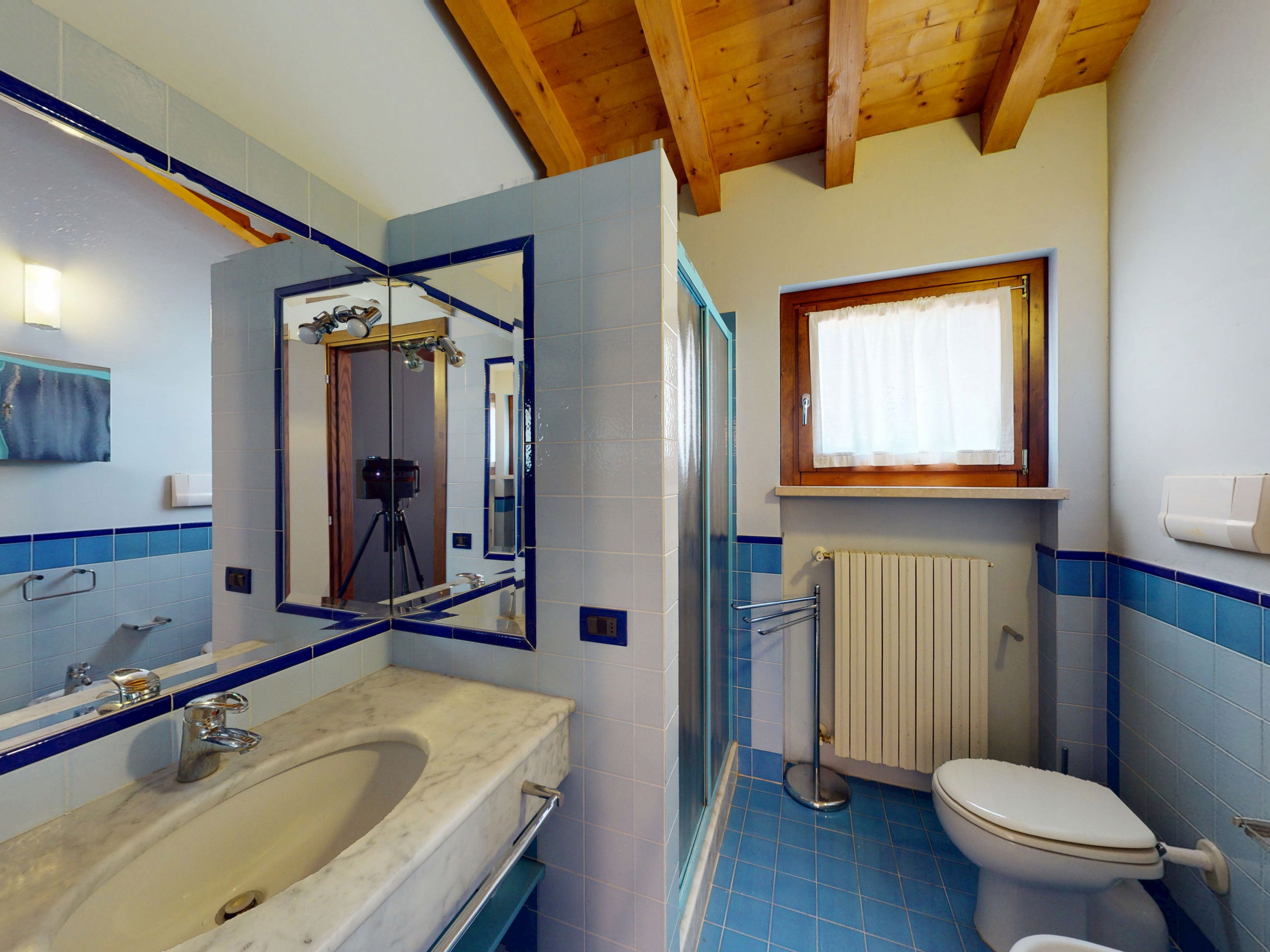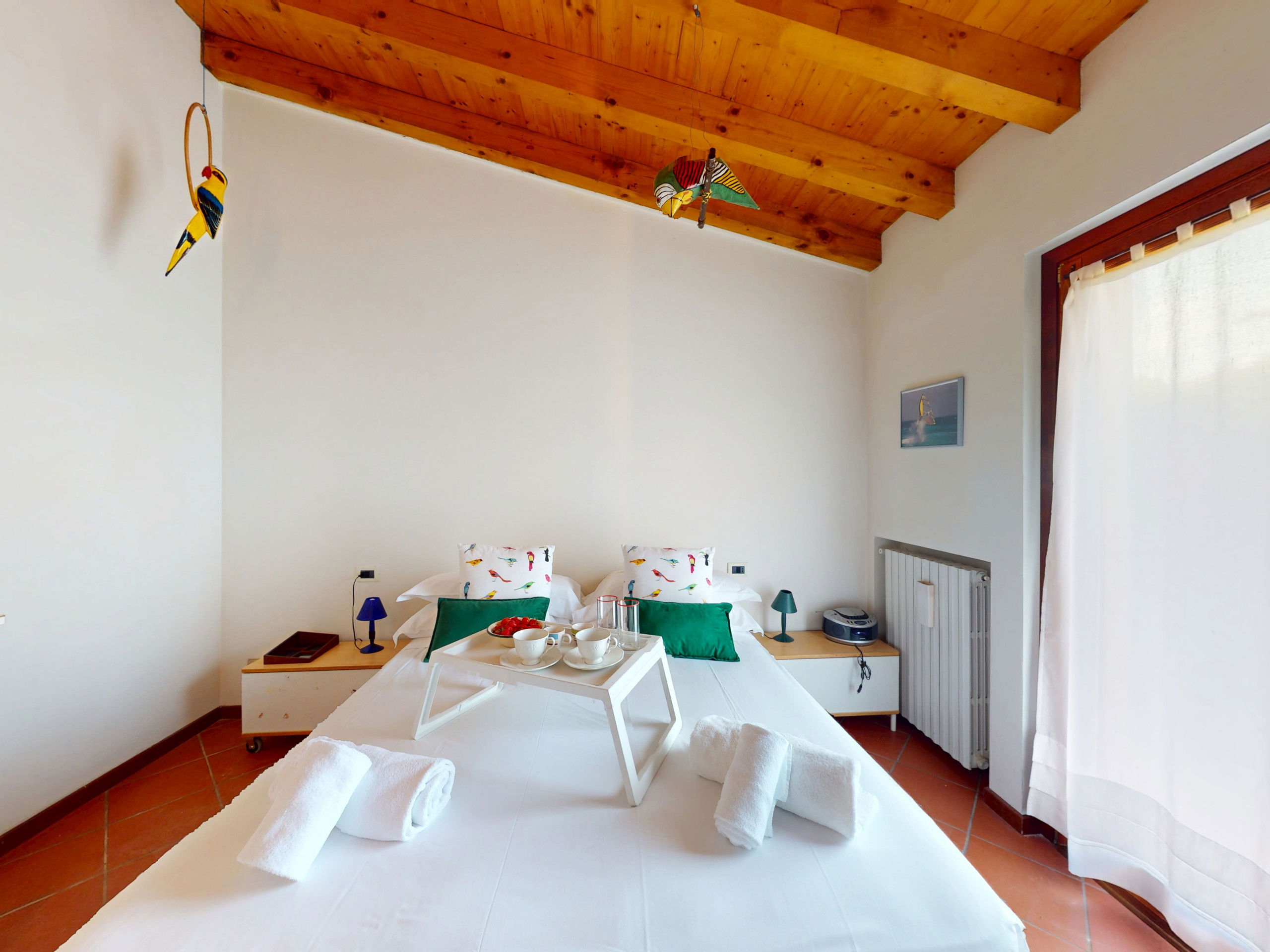 Tout sur un seul niveau, le logement s'ouvre sur des espaces vastes et lumineux, rehaussés par des plafonds hauts avec des poutres en bois apparentes qui racontent la tradition architecturale italienne la plus authentique.