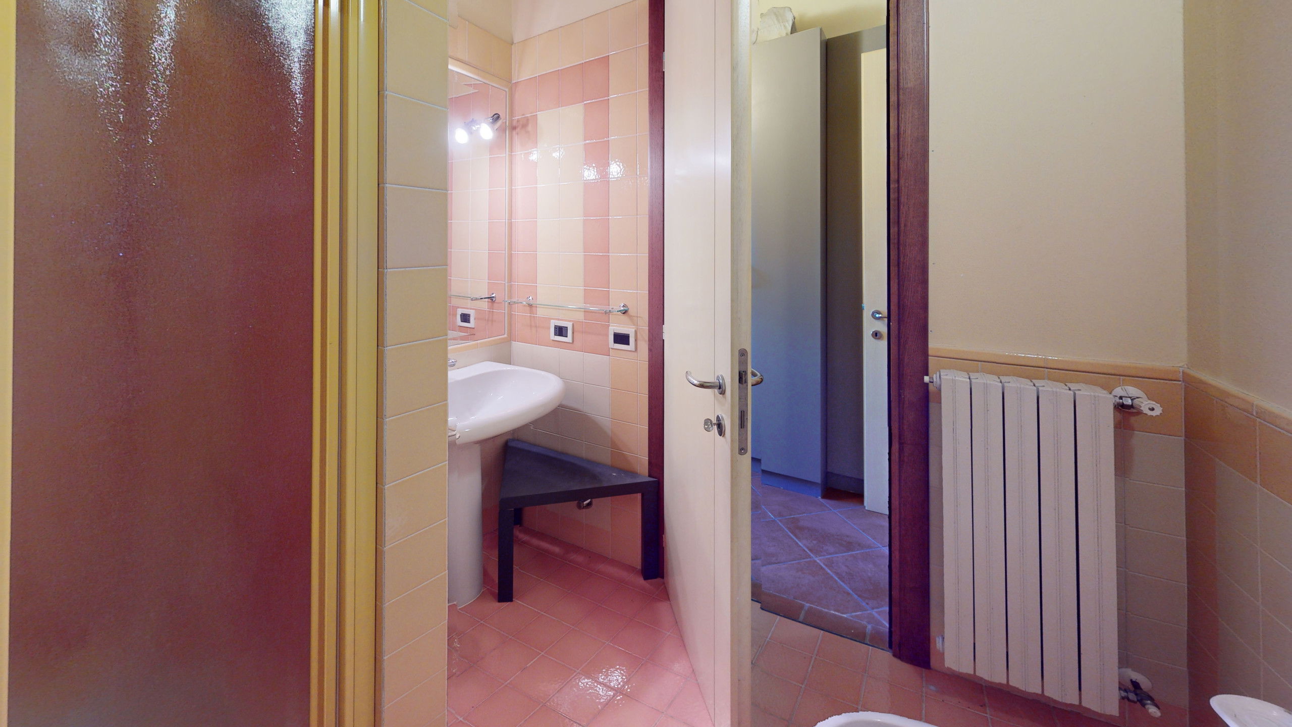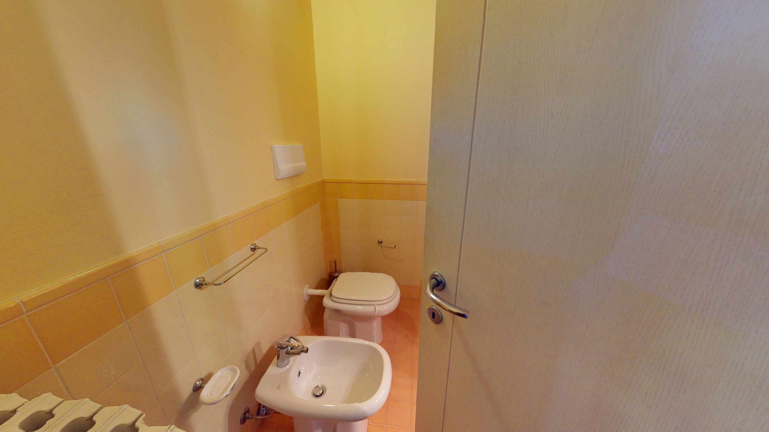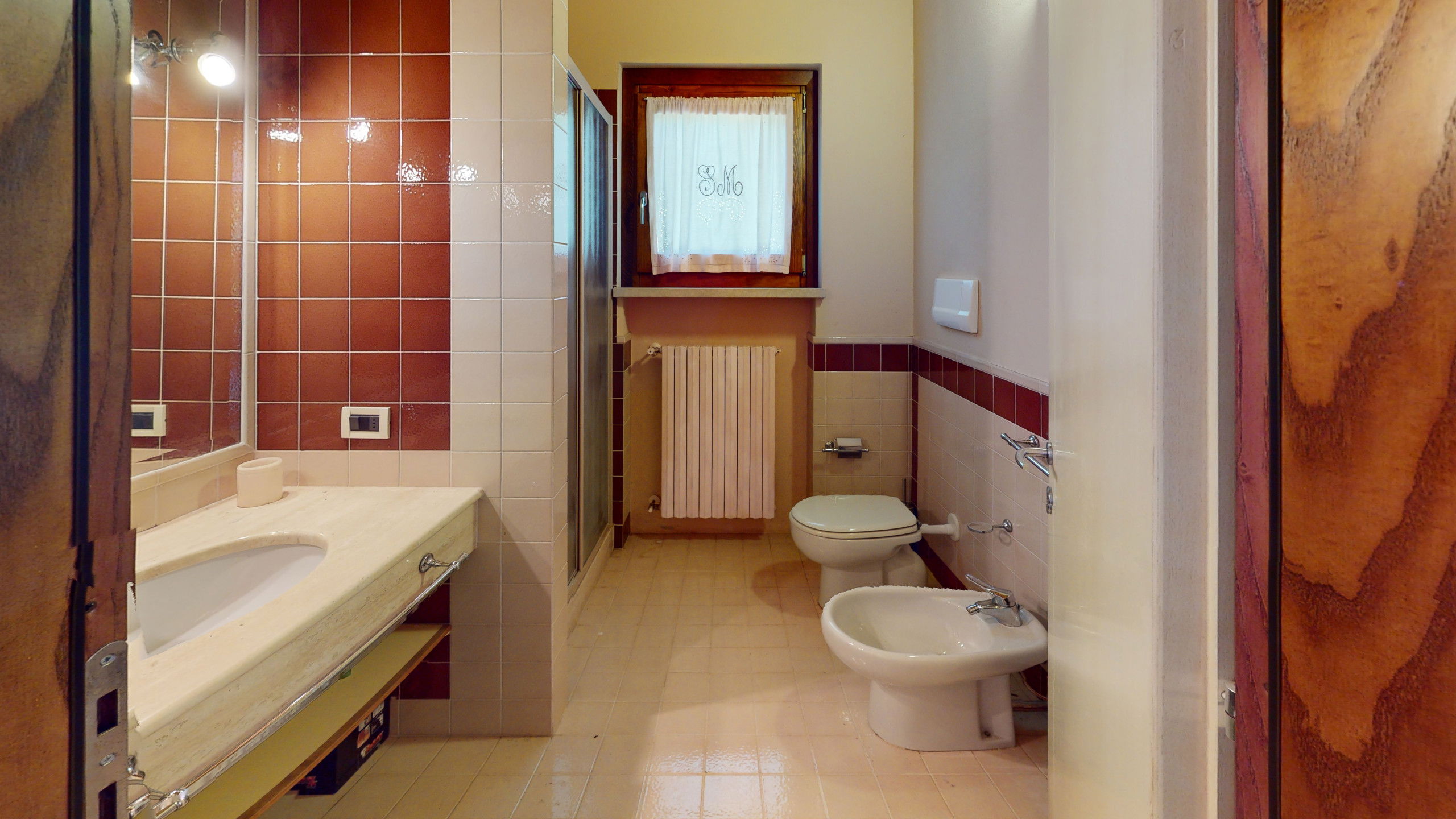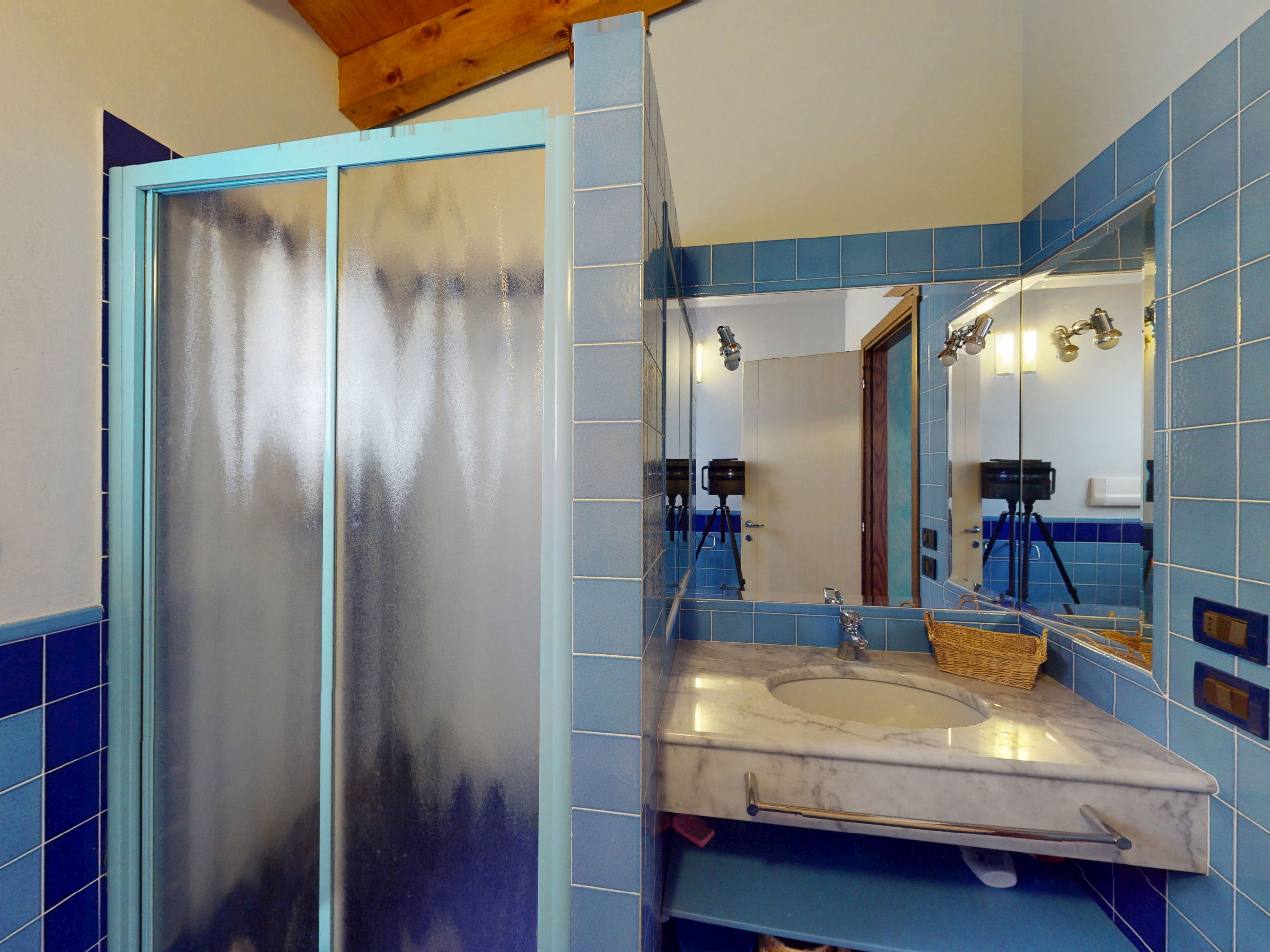 Tout sur un seul niveau, le logement s'ouvre sur des espaces vastes et lumineux, rehaussés par des plafonds hauts avec des poutres en bois apparentes qui racontent la tradition architecturale italienne la plus authentique.