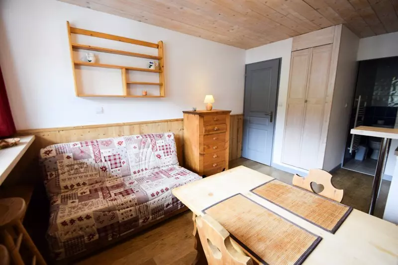 Studio Cabine 3/4 pers, 21m2, exposition Sud (sans balcon), vue sur les pistes, niveau 1 avec ascenseur. Cuisine à l'américaine dans séjour : 2 plaques vitrocéramiques, réfrigérateur, four combiné, lave-vaisselle - Séjour : coin repas, TV, 2 lits gigognes (banquette) - Cabine : dans l'entrée 2 lits superposés (80cm), - Salle de bains : douche, WC inclus. Literie : 2 couettes 1p, 1 couette 2p - Ménage de fin de séjour, draps, serviettes et forfaits ski en option. Studio lumineux, très bien exposé, plein sud. Sols : plastique -. Appartement non fumeur, animaux non admis. En option et en supplément: Ménage de fin de séjour, draps, serviettes, forfaits ski.