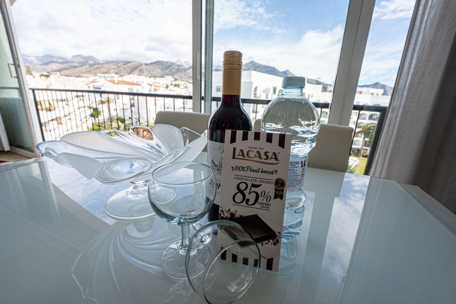 Vie intérieure et extérieure : Le salon communique avec l'extérieur, ce qui permet de profiter de la vue sur la mer et la montagne et crée une ambiance agréable aussi bien en journée qu'au coucher du soleil. Un espace idéal pour se reposer après la plage ou partager un repas tranquille après avoir parcouru Nerja à pied.