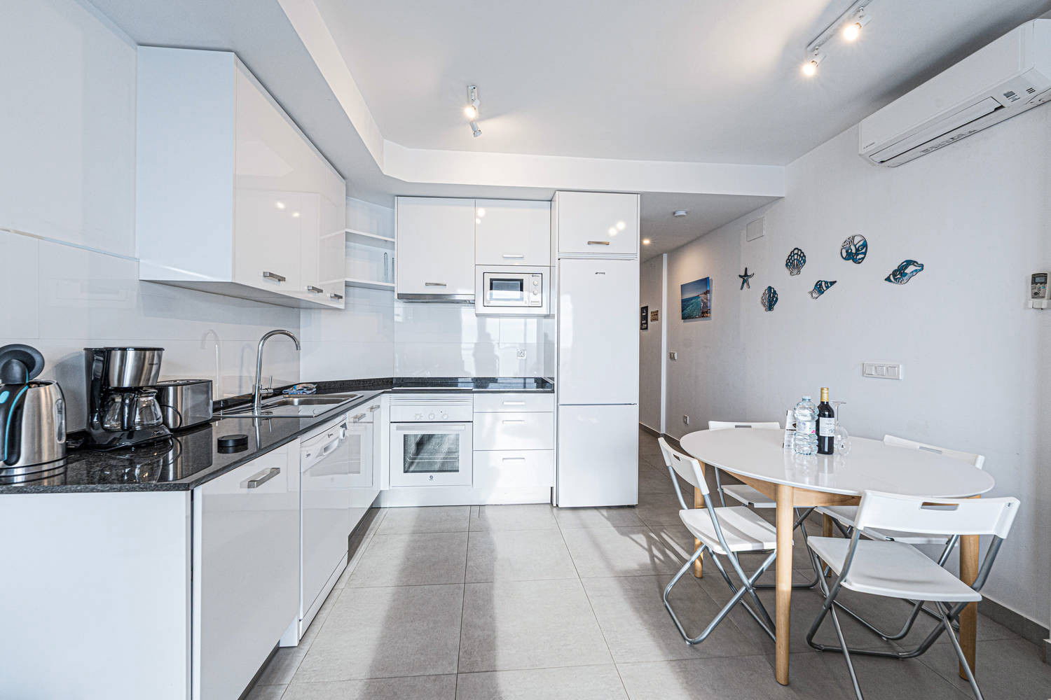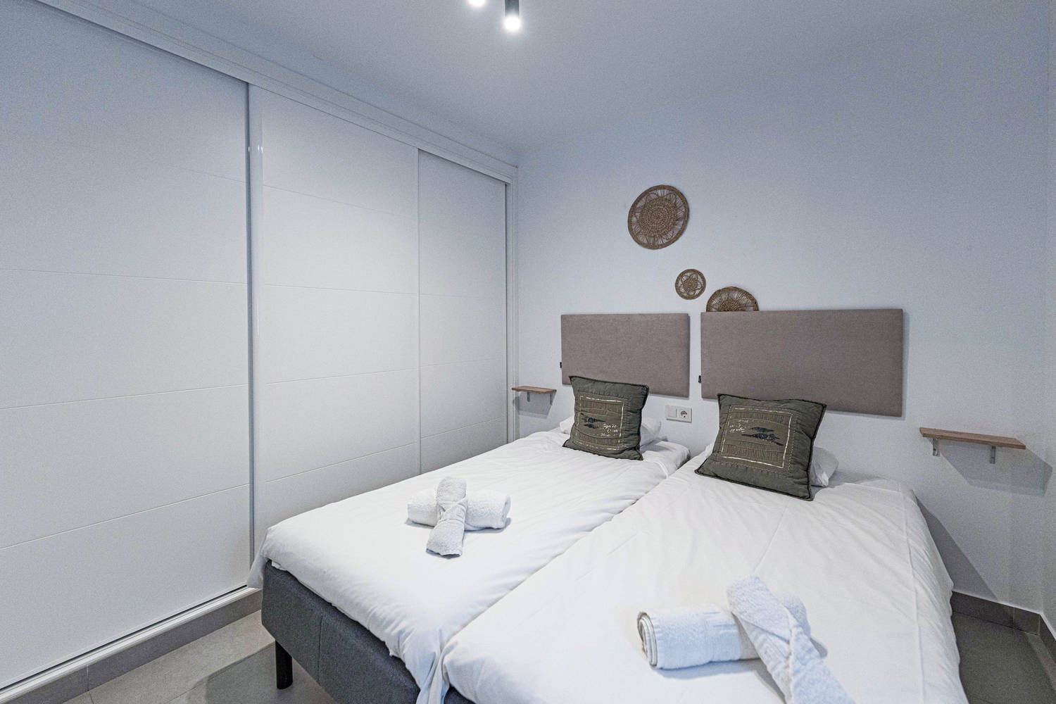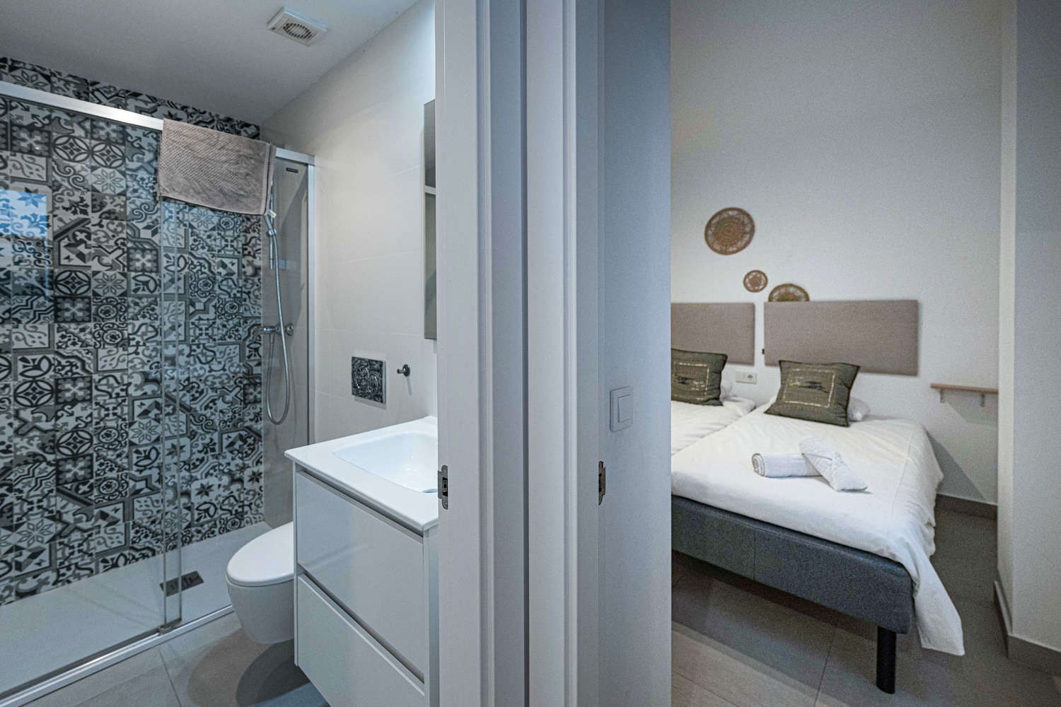 L'appartement dispose de deux chambres et de deux salles de bain : l'une avec un lit king size et une salle de bain privée, et une autre chambre avec des lits superposés. Il dispose également d'une cuisine moderne entièrement équipée avec des appareils dernier cri, parfaite pour que tu te sentes comme chez toi pendant tes vacances.