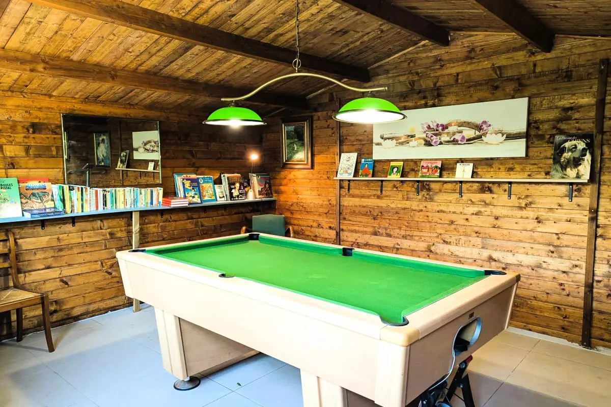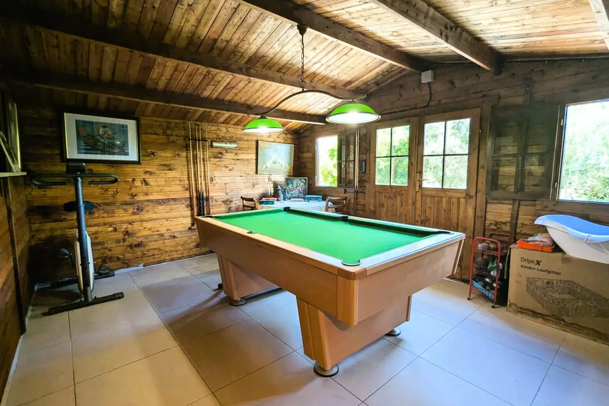 - terrain de pétanque, billard et vélo d'appartement dans chalet de jardin avec éclairage ;