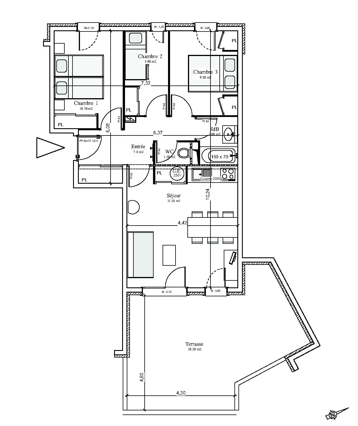 Appartement 4 pièces (3 chambres) – 1ère étage avec balcon orienté sud/est, vue sur pistes.