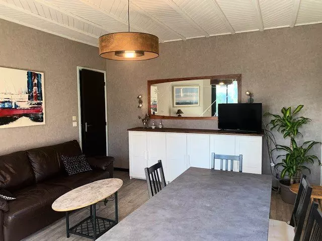 SALON-SEJOUR : table, chaises, canapé, fauteuil, télévision, des baies vitrées donnent sur une petite terrasse