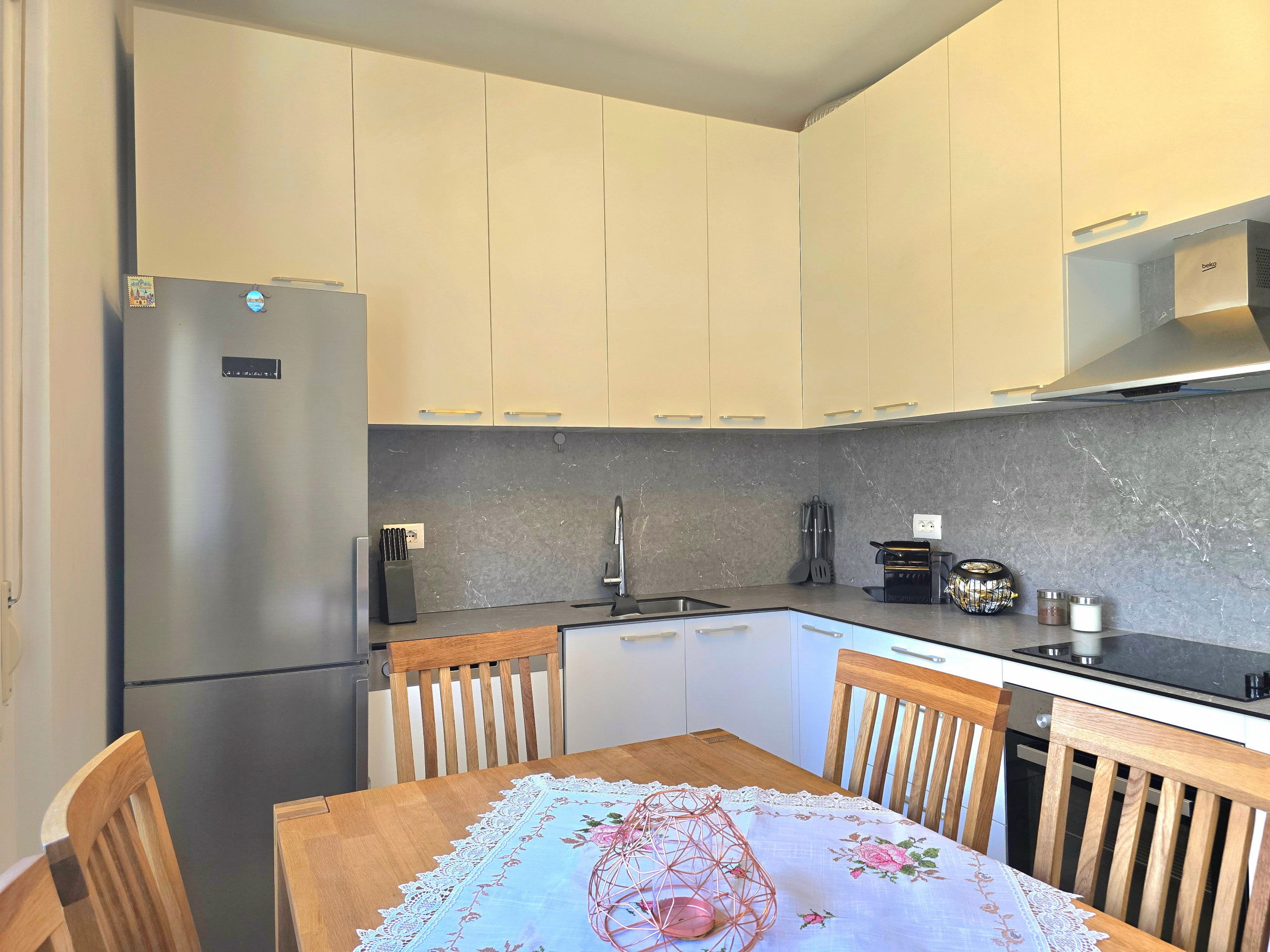 La cuisine américaine, à vitrocéramique, est équipée avec réfrigérateur, four, congélateur, lave-vaisselle, vaisselle/couverts, ustensiles/cuisine, bouilloire et equipement de cuisine.