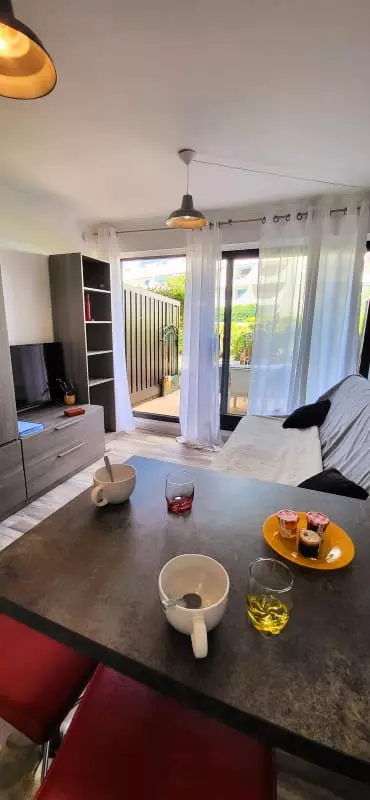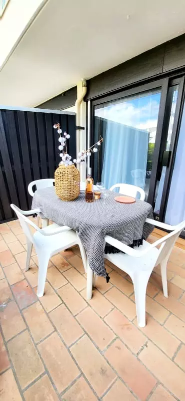 Côté cuisine : ouverte sur le séjour, entièrement équipée (2 feux induction, micro-ondes, frigo, lave-linge, *cafetière Senséo* , grille pain et bouilloire) avec une table pour 2 en terrasse, qui vous permettra d'accueillir vos repas et convives.